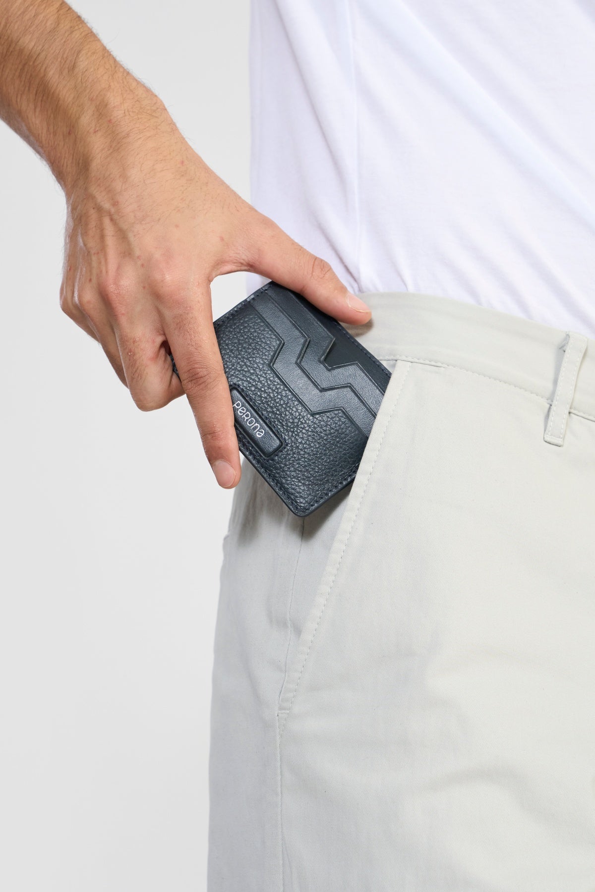 Crafted from premium textured leather, this compact card holder combines elegance with everyday functionality. The modern navy blue tone, enhanced with sleek geometric embossing, makes it a refined choice for professionals. Designed with multiple card slots, it keeps your essentials organized while maintaining a slim silhouette. Finished with a polished Perona metal logo plate, it’s the perfect blend of sophistication and practicality.
