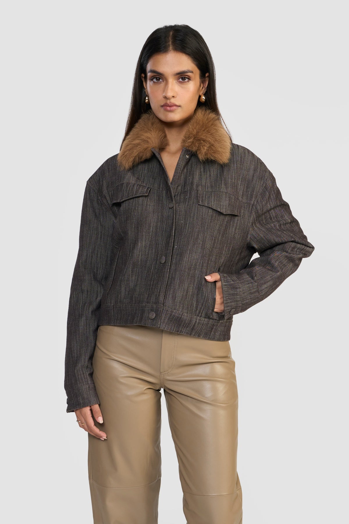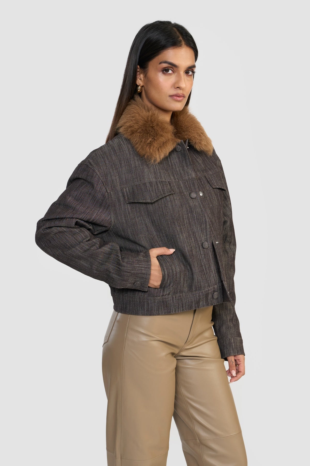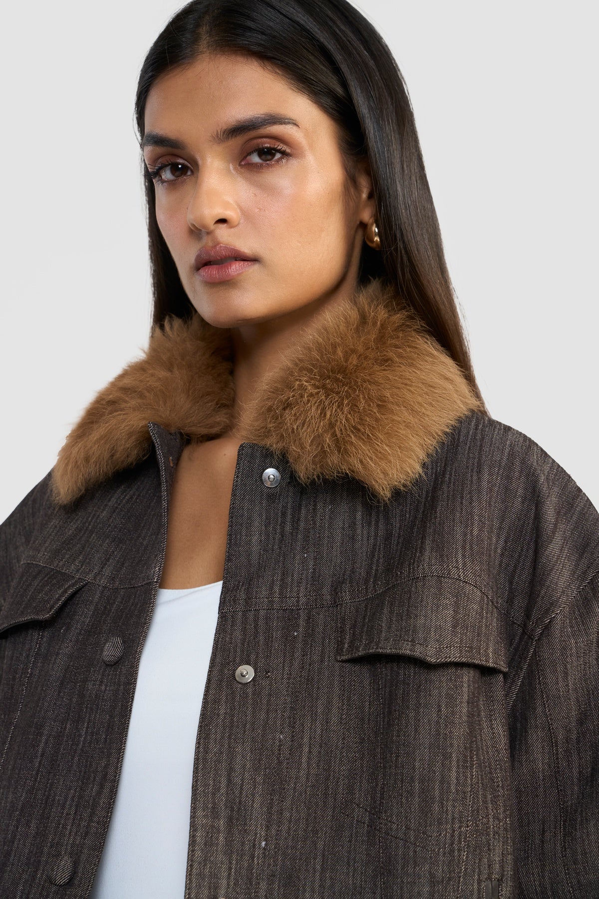 Elevate your wardrobe with this quintessential denim jacket, where classic ruggedness meets contemporary sophistication. Crafted from OEKO-TEX® certified premium distressed denim, it is finished with a plush shearling collar, adding both warmth and a touch of luxurious detail.