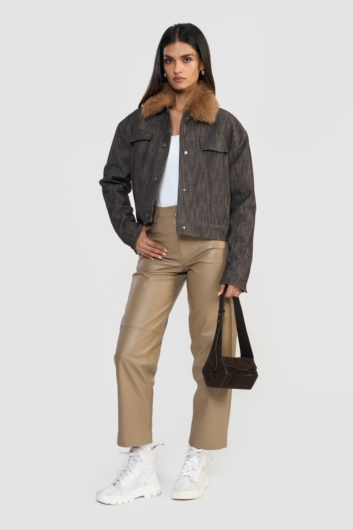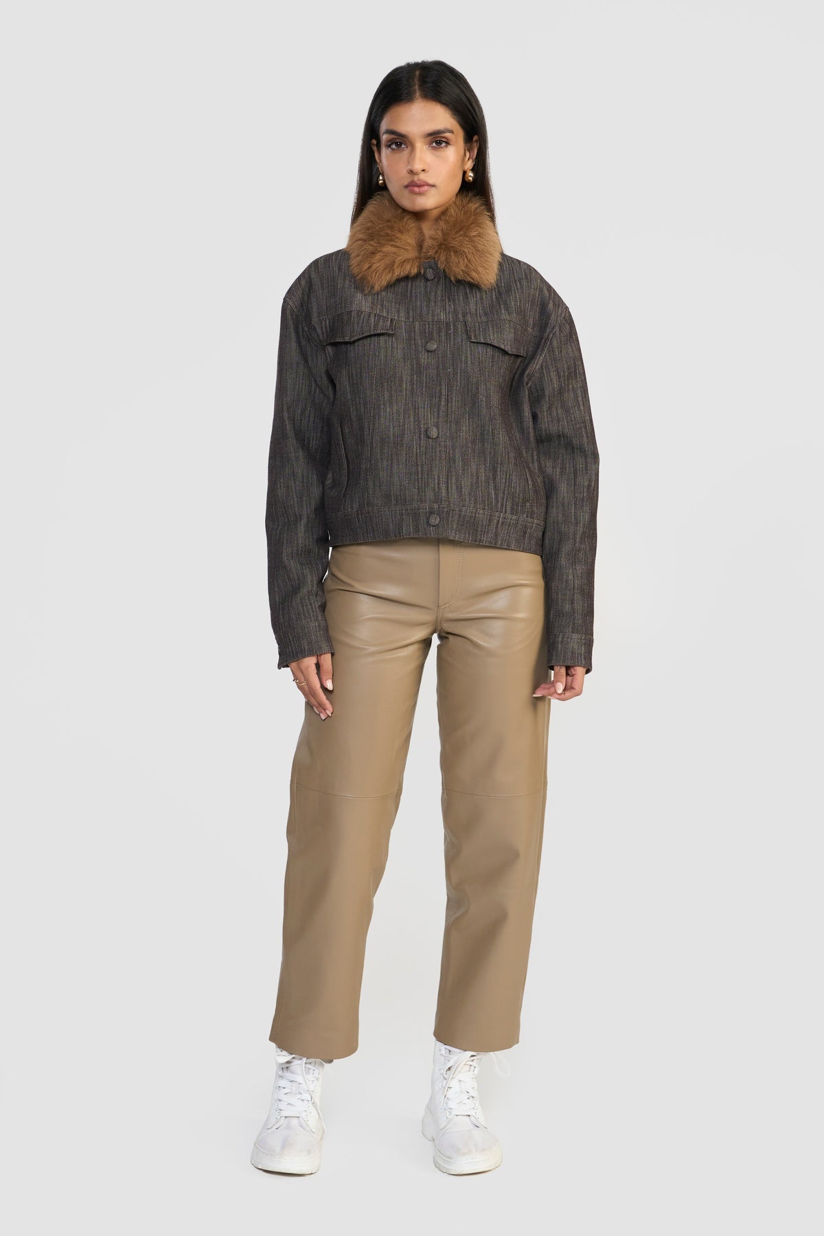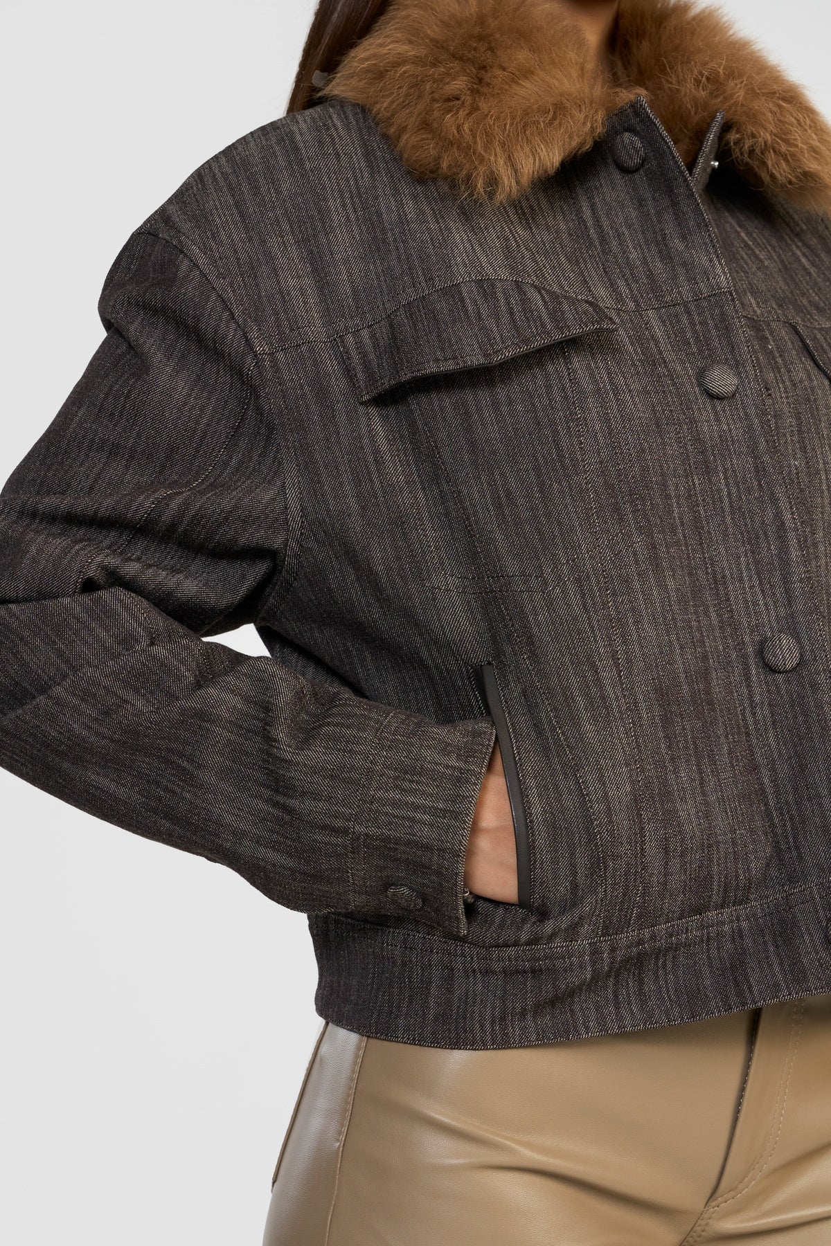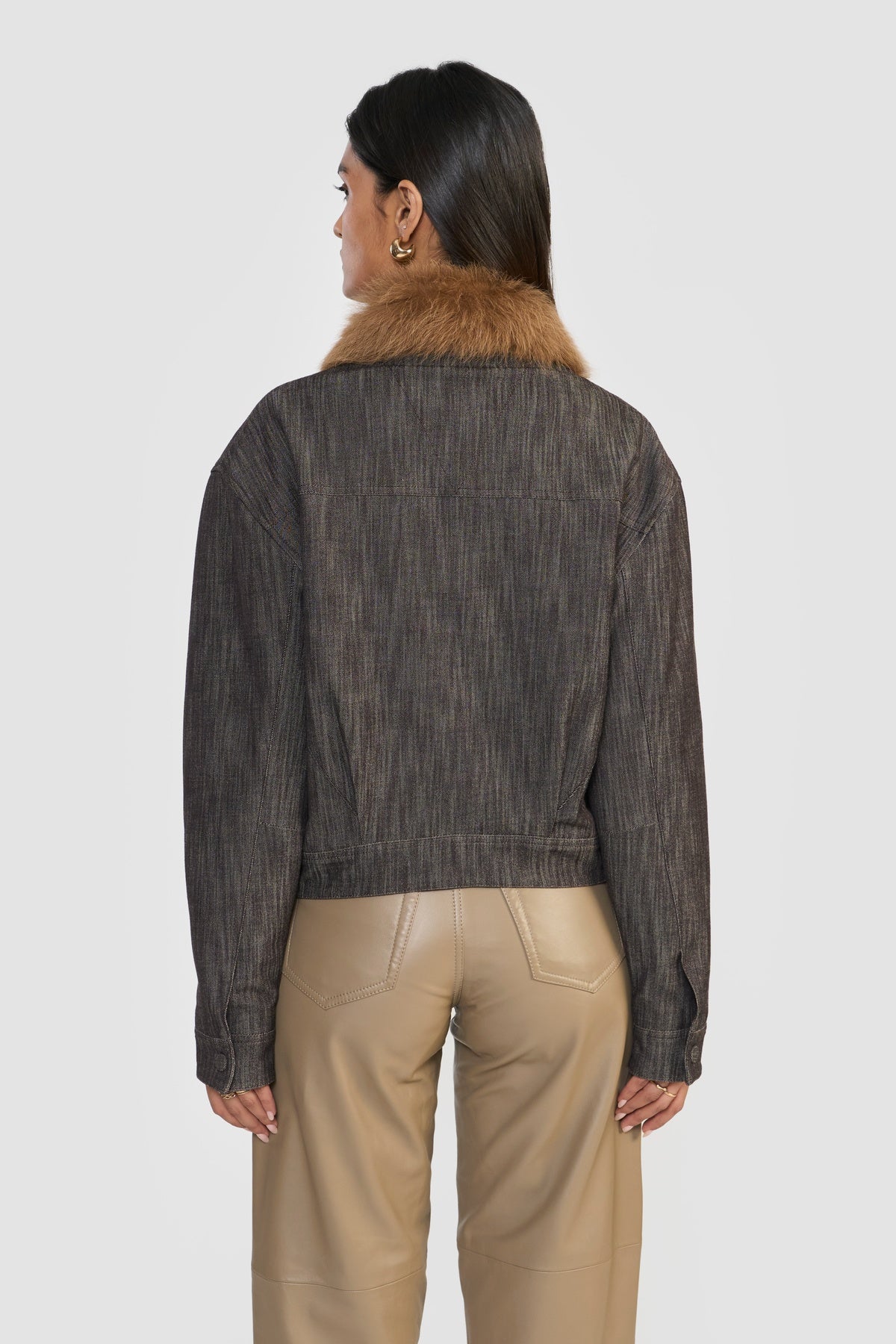Elevate your wardrobe with this quintessential denim jacket, where classic ruggedness meets contemporary sophistication. Crafted from OEKO-TEX® certified premium distressed denim, it is finished with a plush shearling collar, adding both warmth and a touch of luxurious detail.