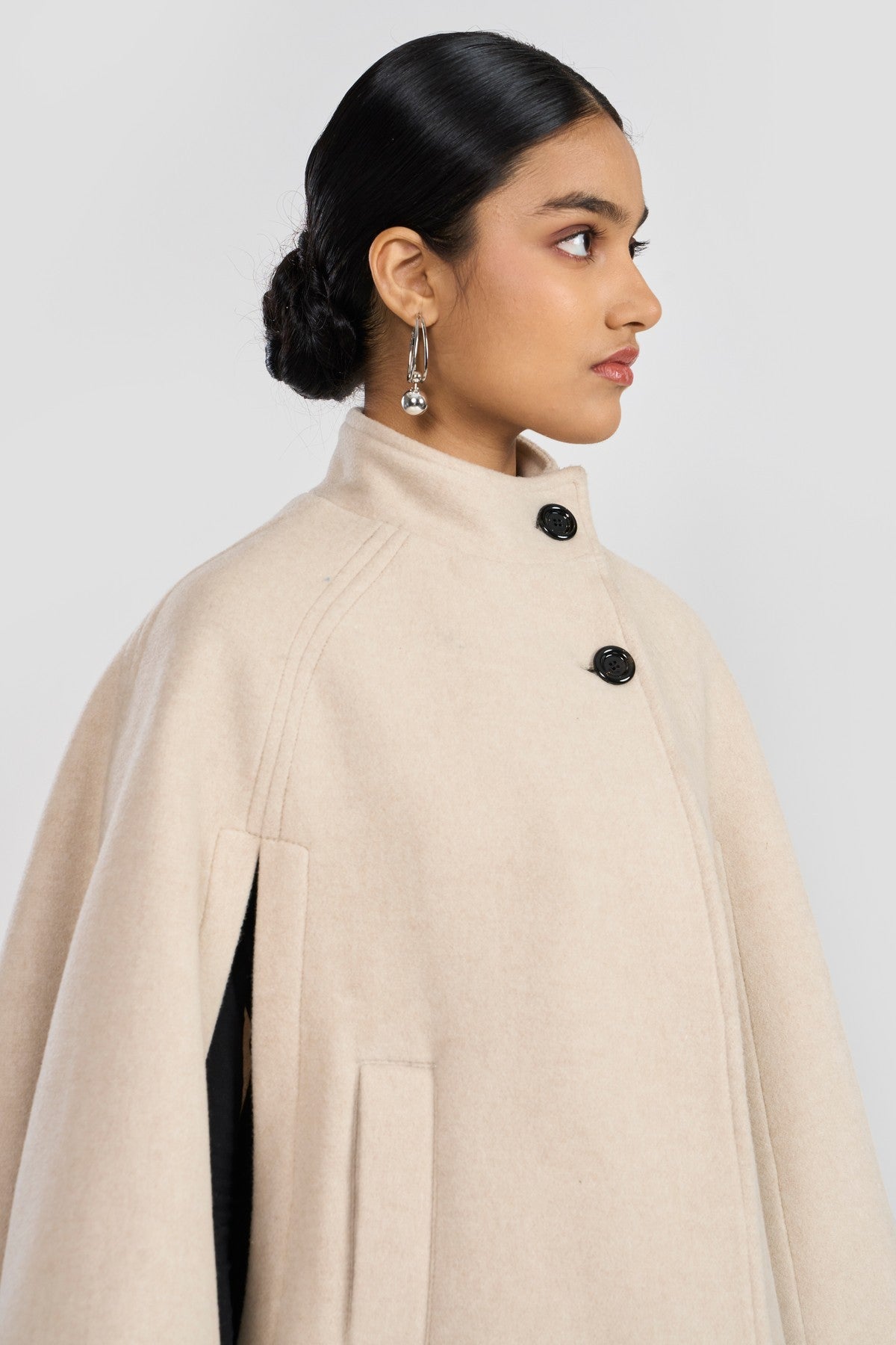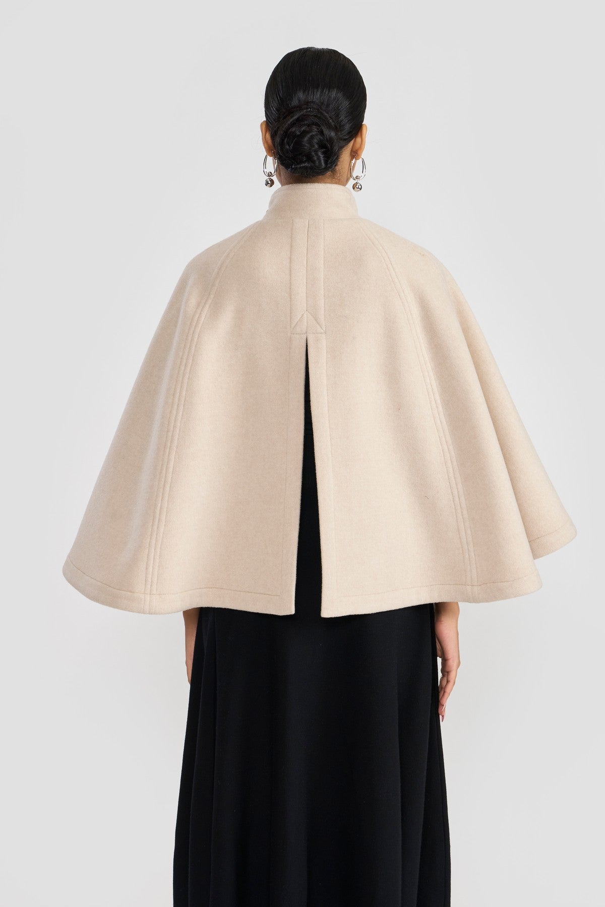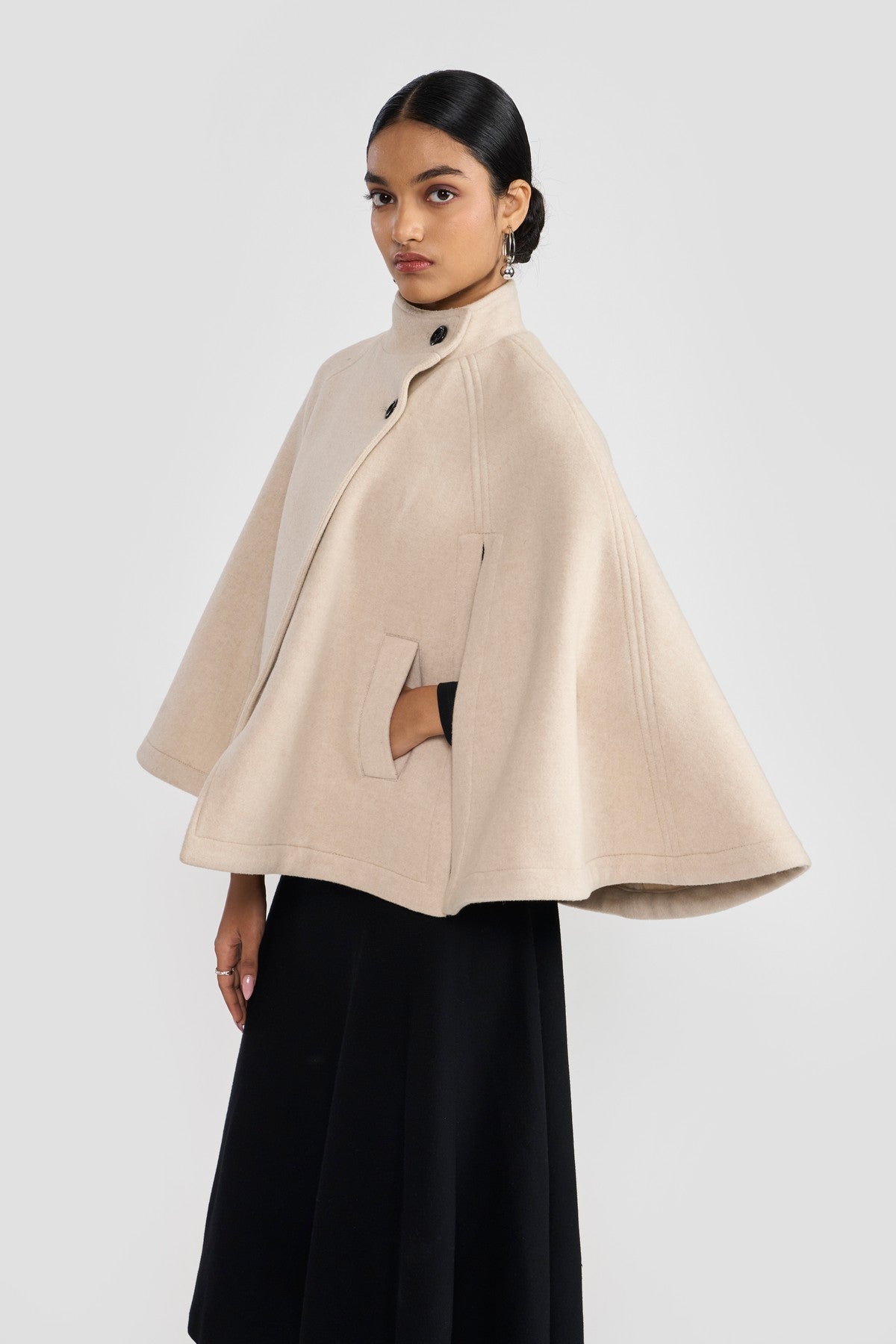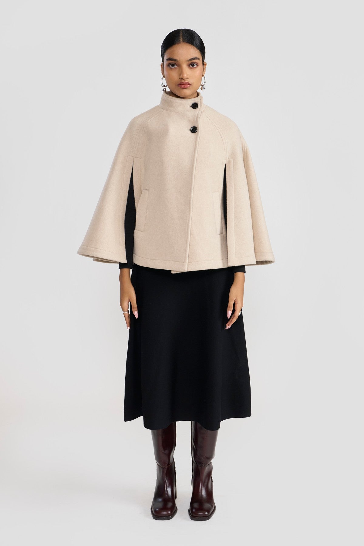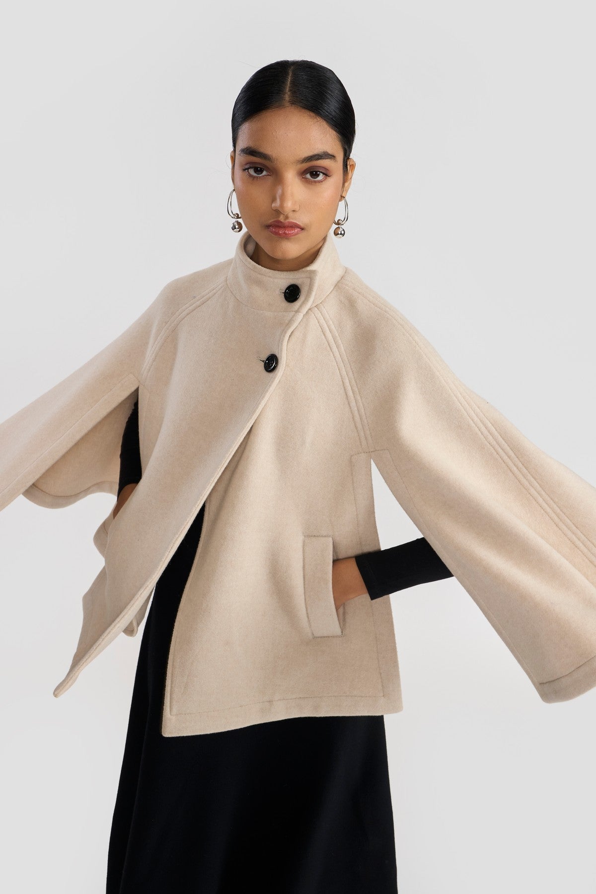 AGNES, a sophisticated hybrid poncho jacket crafted from luxurious Italian Wool certified by the Global Recycled Standard (GRS). This hybrid cape jacket is designed to be layered. Features an elegant high- neck collar, dynamic a- line silhouette, two side slip pockets and leather covered button closure.