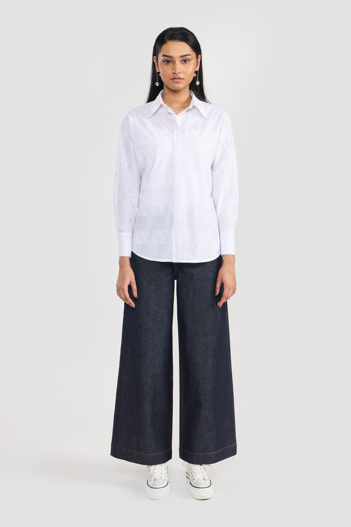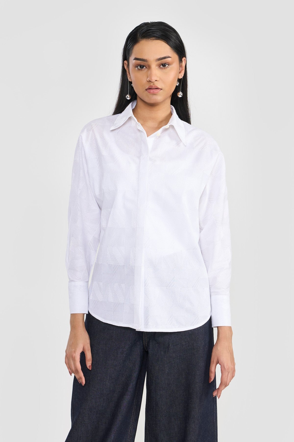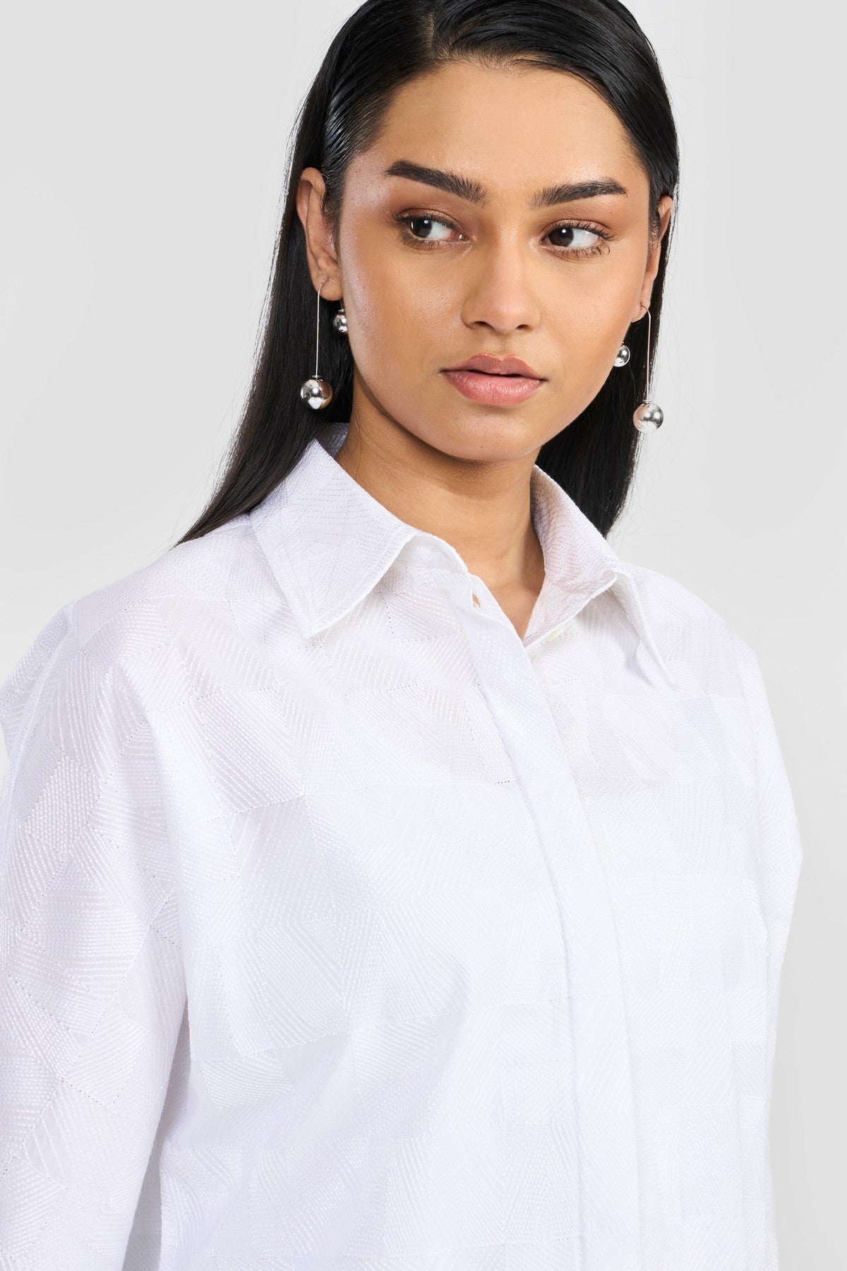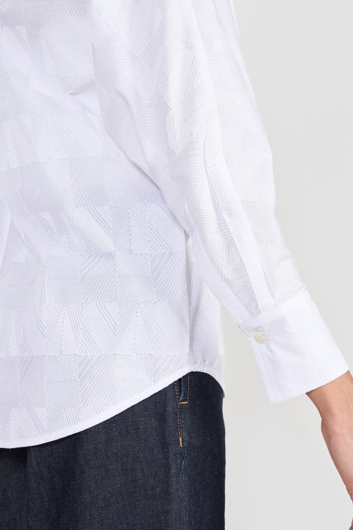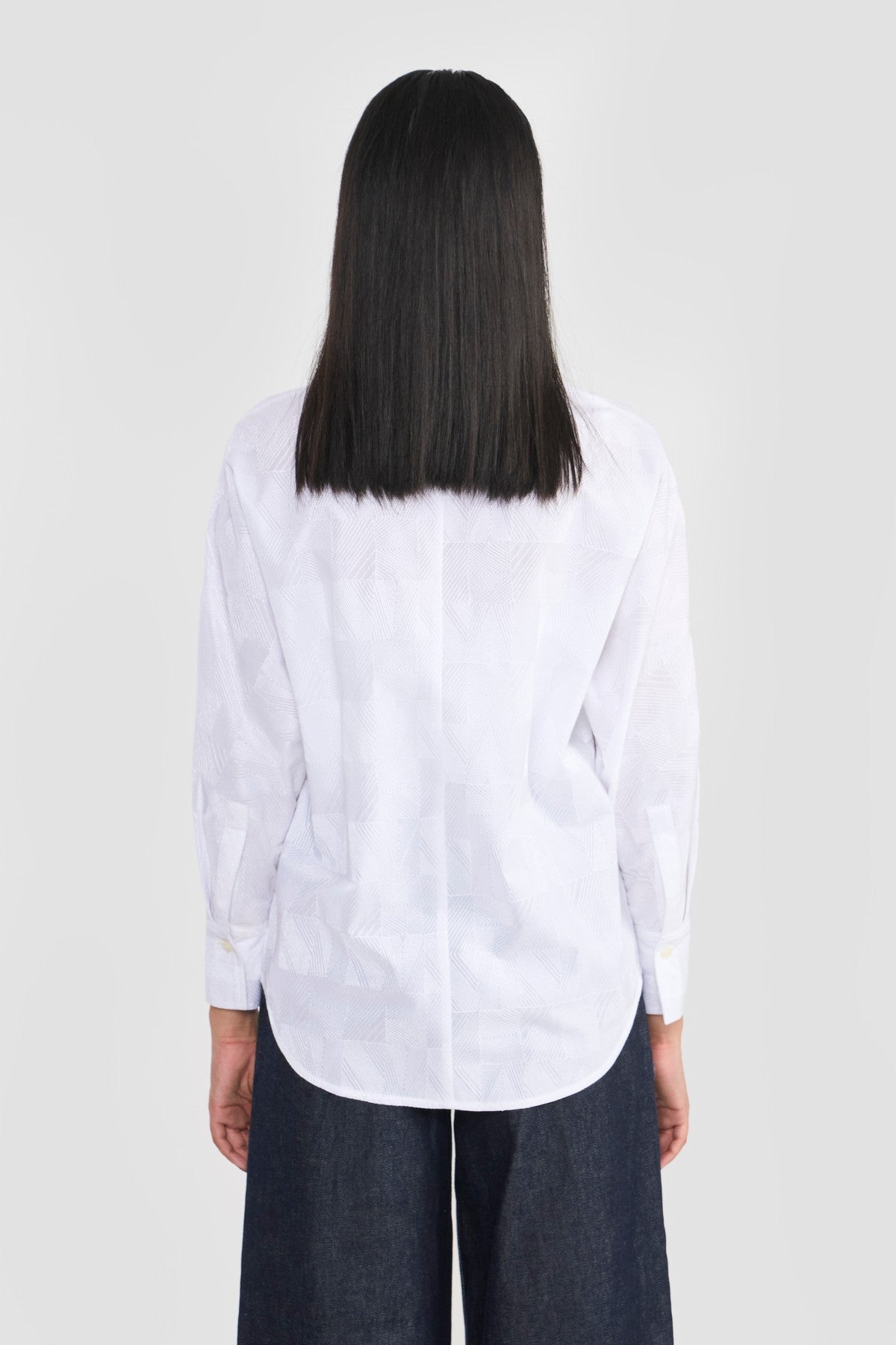A precious, distinctly Perona geometric embroidery enriches the premium cotton with a three-dimensional effect giving the garment a particularly elegant appearance. Bringing forth Perona’s design innovation, executed to the highest quality. ALAINA shirt is cut for an oversized fit and features relaxed dropped shoulder sleeve, back box pleat adds volume for extra movement The deconstructed shape is enhanced by the curved, longline stepped hem. Our highly breathable premium cotton is produced using environment friendly dyes.