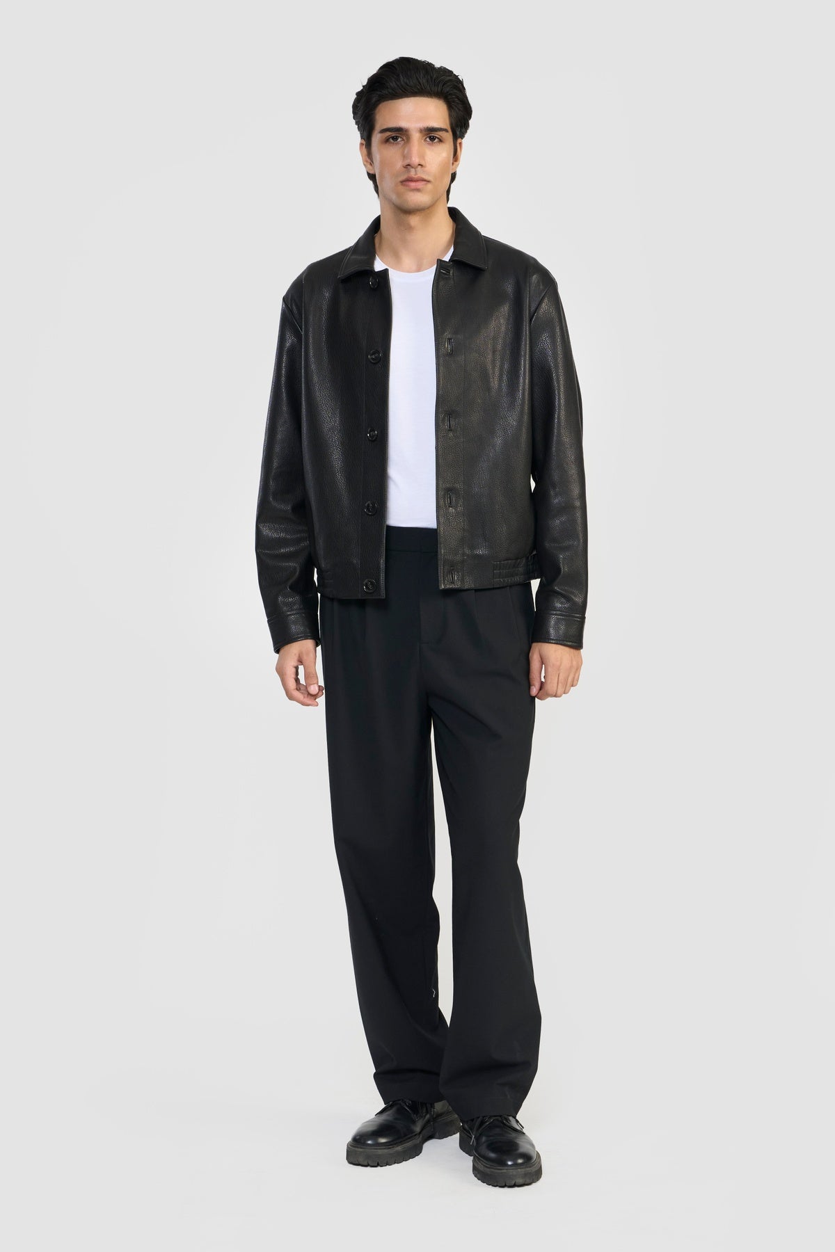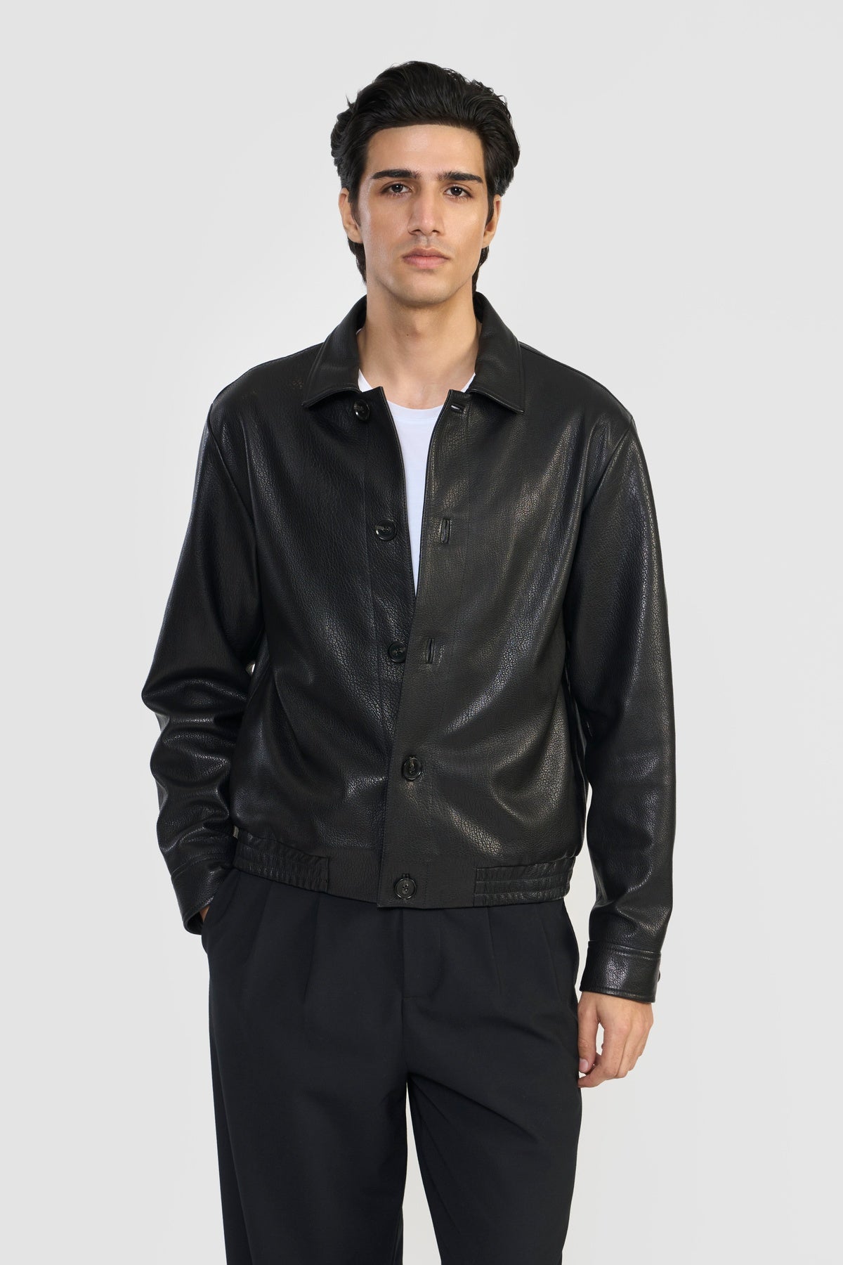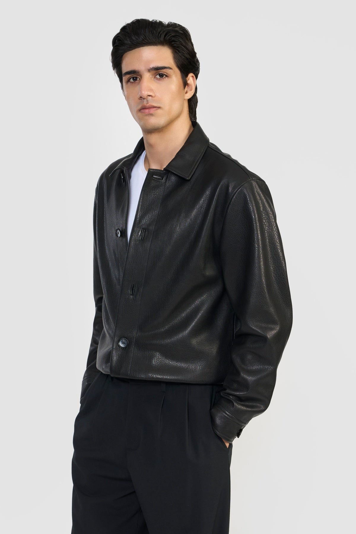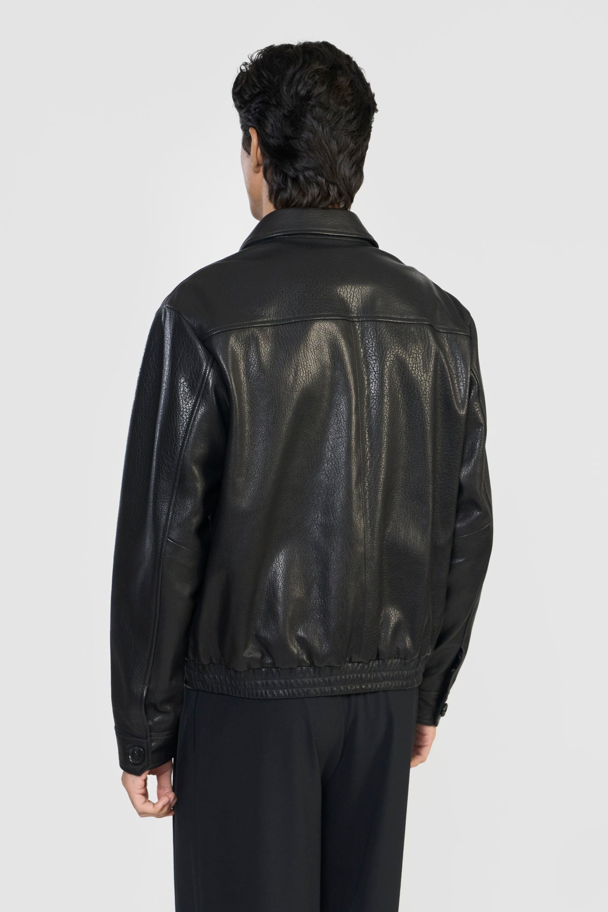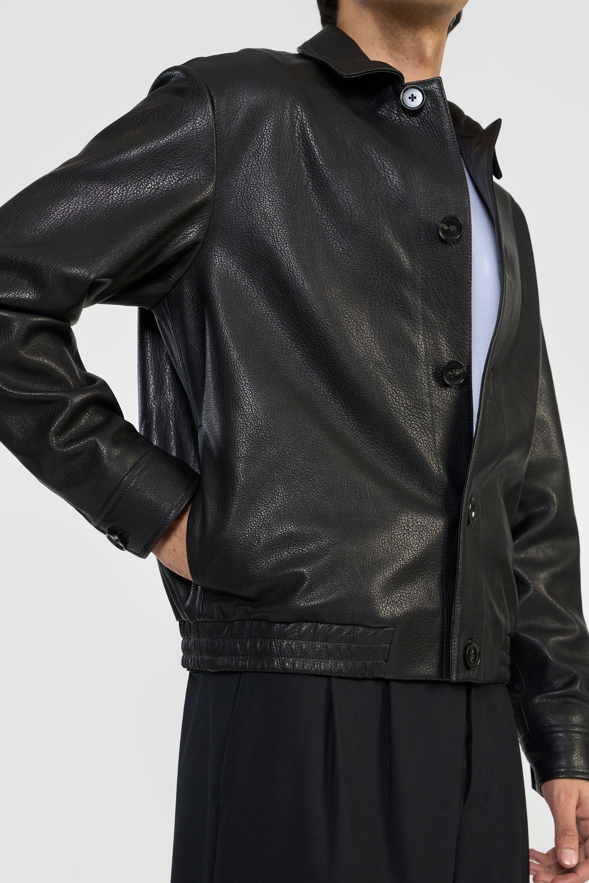 Perona's exclusive ALISTAIR bomber jacket features a pointed shirt collar, flap pockets, and striking details. The grainy lambskin boasts a natural sheen, complemented by softly elasticated bottom hem for a harmonious blend of textures. It’s crafted from premium nappa leather certified by LWG.