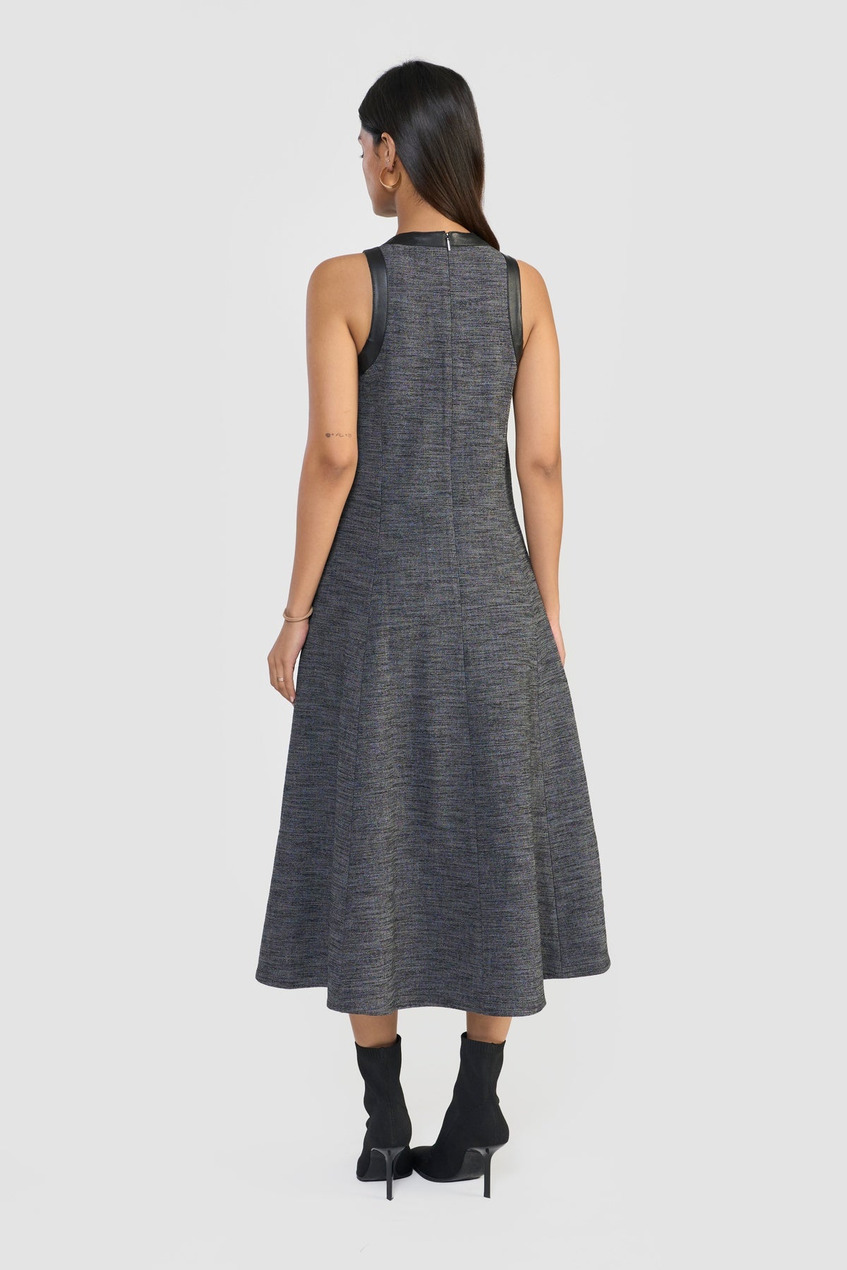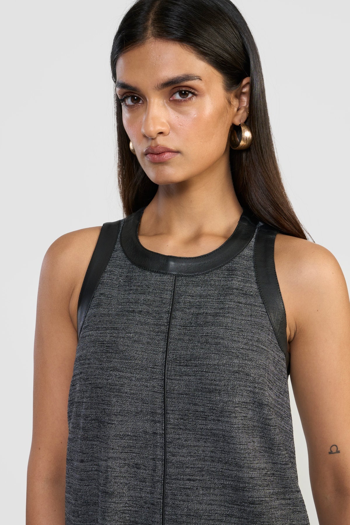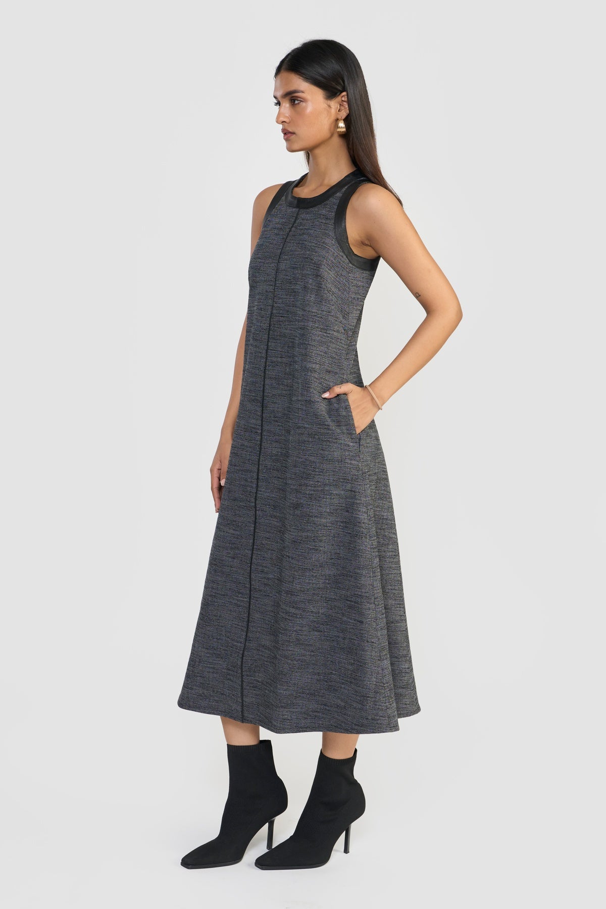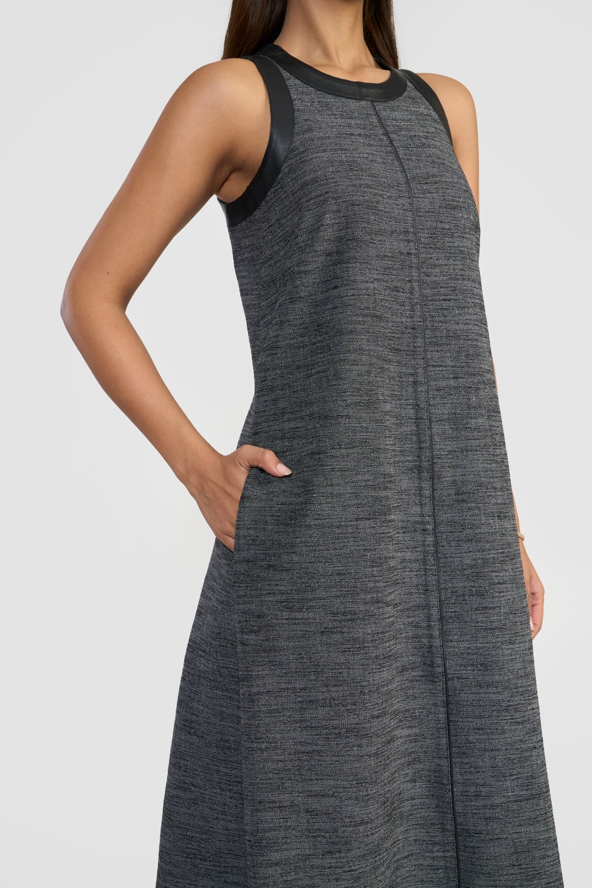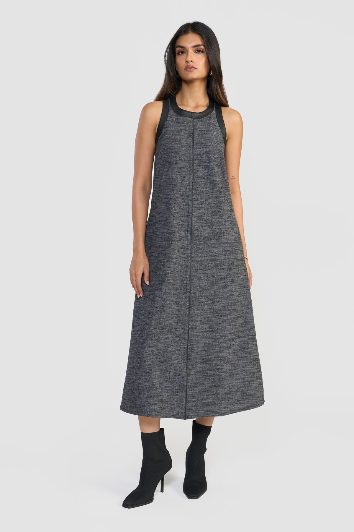Modern minimalism meets refined detailing in this halter dress. Crafted in a denim fabric, the silhouette is elongated with a clean, relaxed fall. Contrast leather trims accentuate the neckline and armholes, adding a structured edge, while the centre front piping introduces a sharp linear detail that elevates the simplicity of the design. Balancing ease with sophistication, this versatile piece transitions seamlessly from day to evening, offering understated luxury with a contemporary attitude.