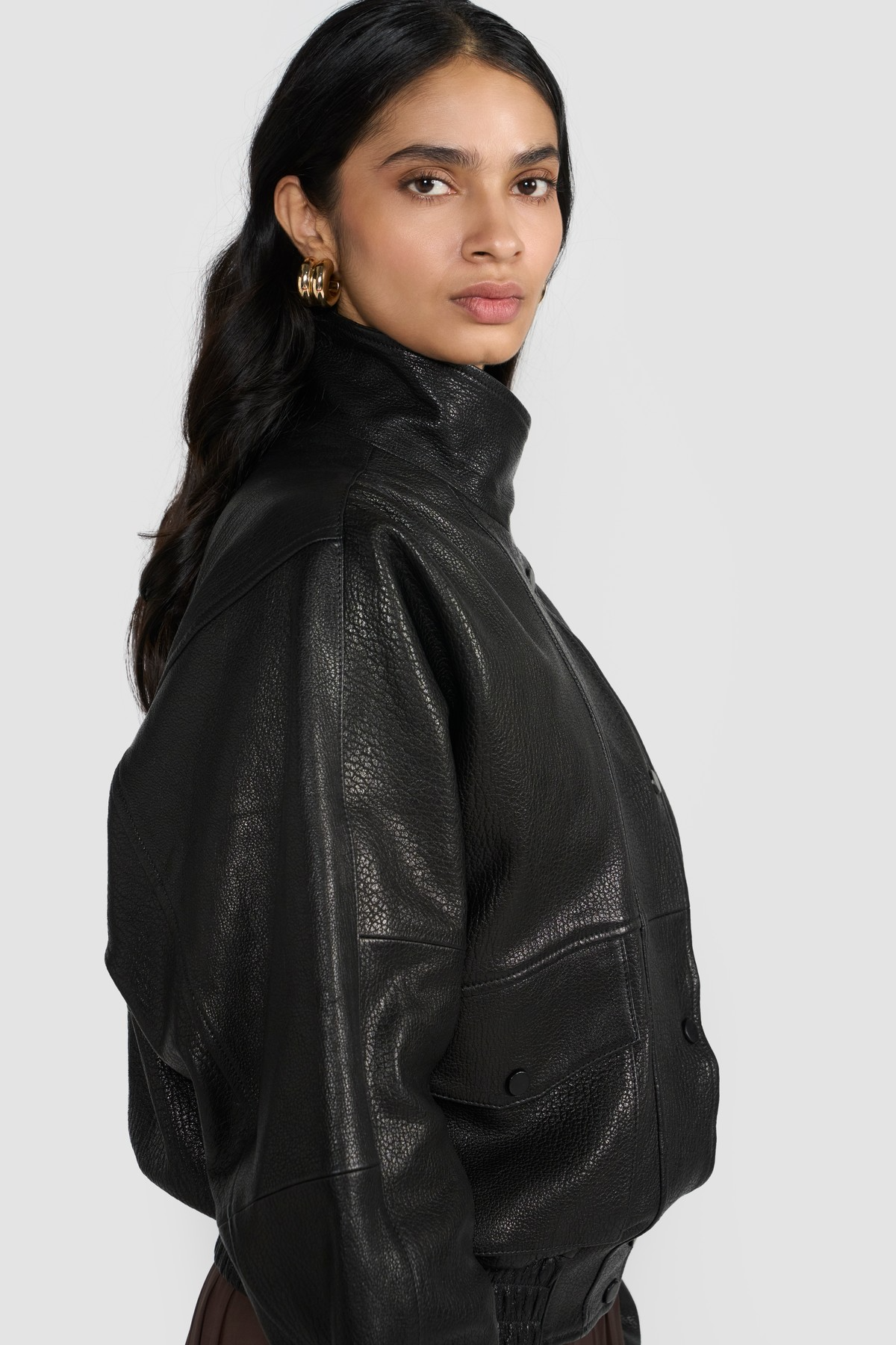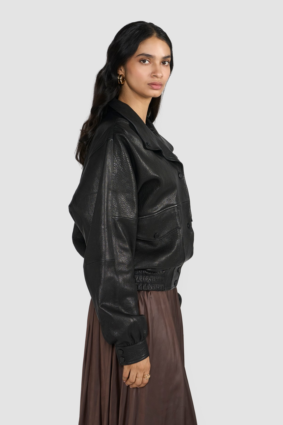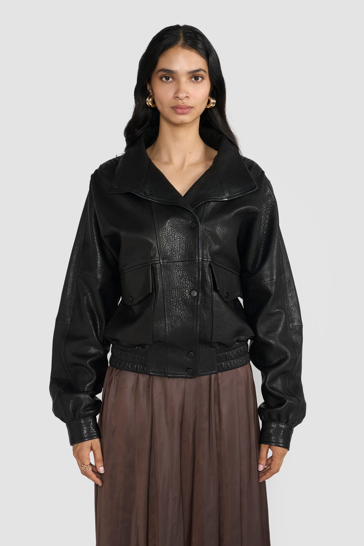 This women's bomber jacket is a sophisticated blend of classic design and modern craftsmanship. Expertly tailored from LWG-certified premium Nappa leather, it boasts a deep grain texture that enhances its natural character, while a subtle metallic sheen adds a refined, edgy appeal. The structured silhouette features a high stand collar and a button-front closure, offering both warmth and bold style.Functional elements like oversized flap pockets and elasticized hem and cuffs not only nod to traditional bomber aesthetics but also ensure comfort and practicality. Whether layered over a casual outfit or paired with sleek evening wear, this jacket elevates any look with timeless confidence and ethical craftsmanship.