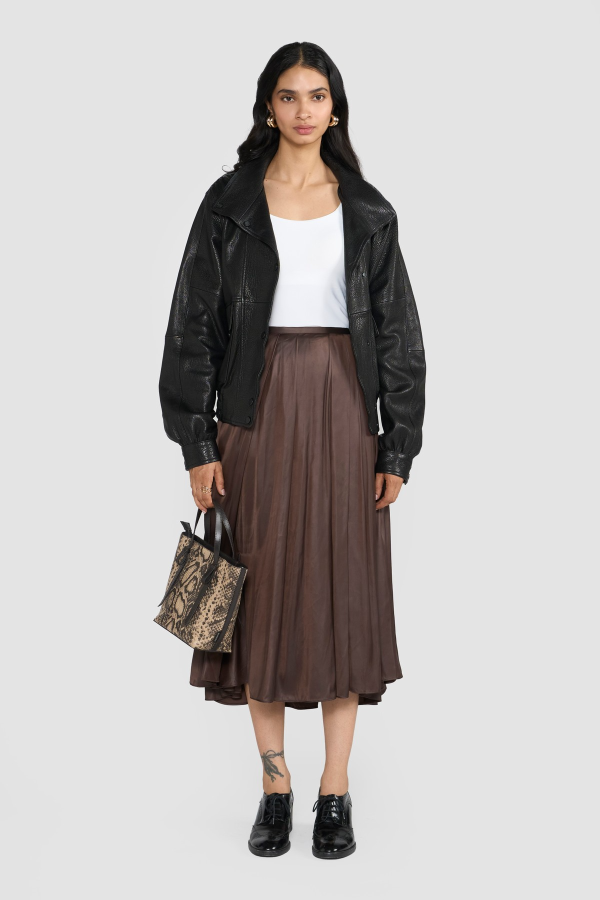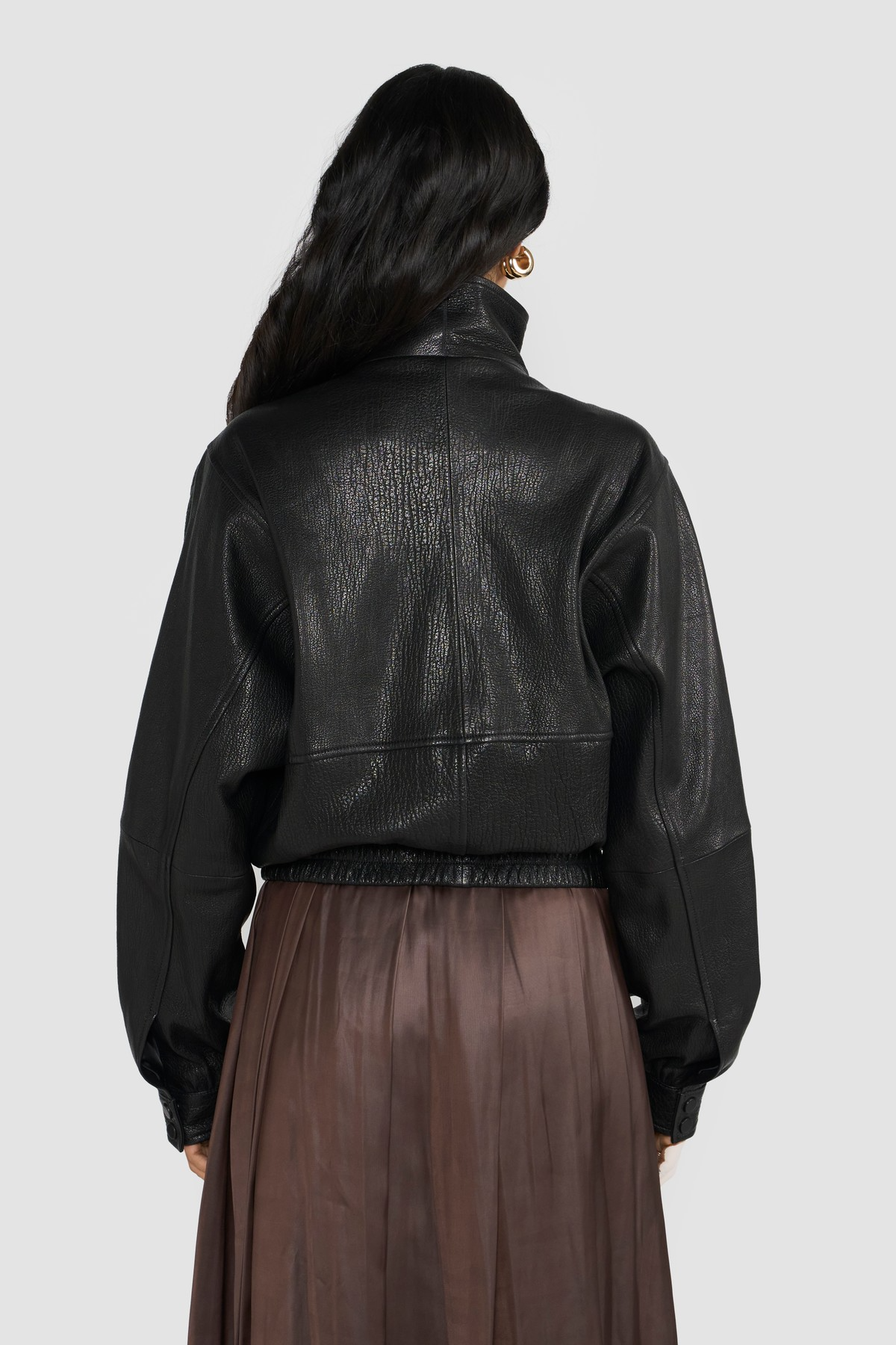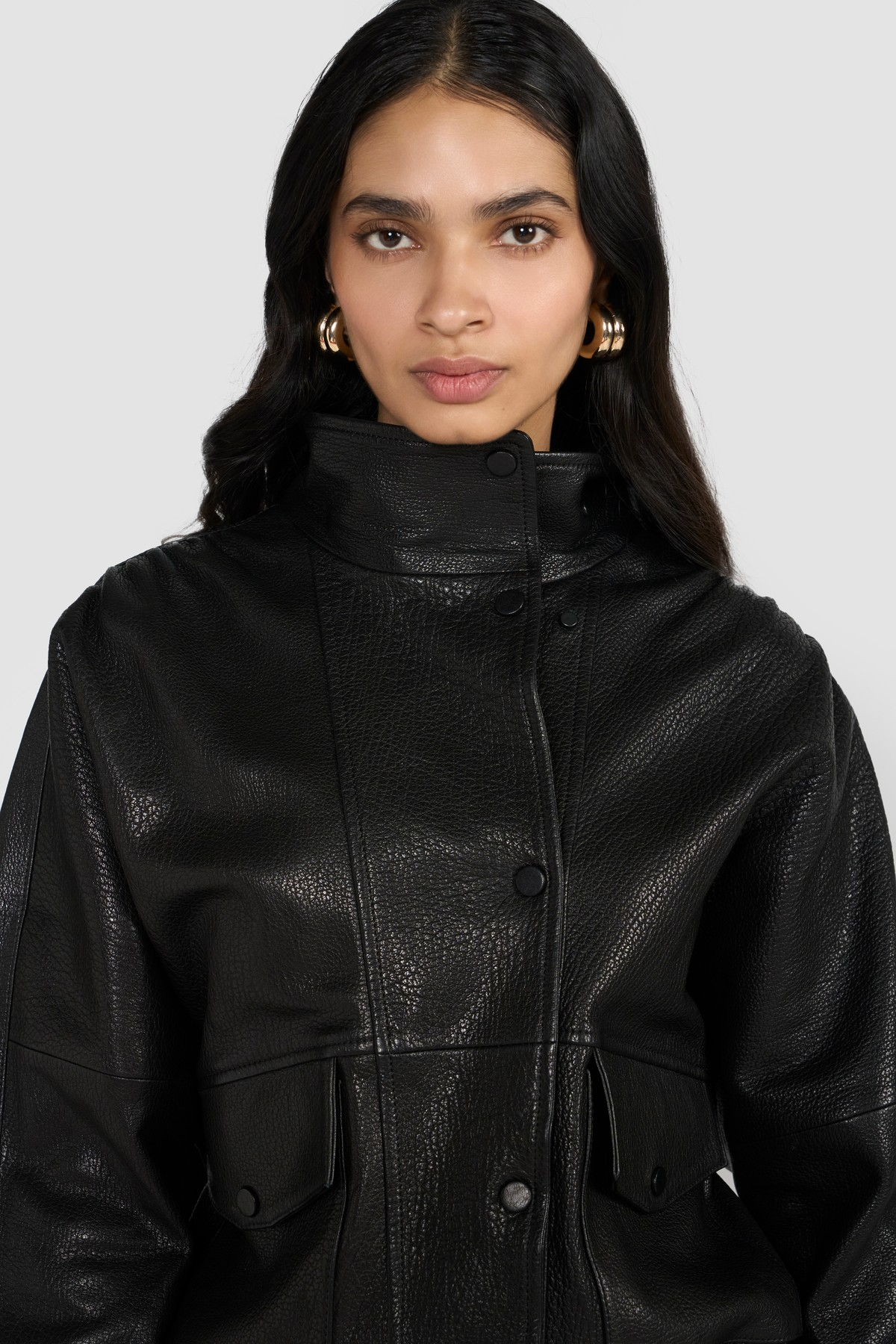 This women's bomber jacket is a sophisticated blend of classic design and modern craftsmanship. Expertly tailored from LWG-certified premium Nappa leather, it boasts a deep grain texture that enhances its natural character, while a subtle metallic sheen adds a refined, edgy appeal. The structured silhouette features a high stand collar and a button-front closure, offering both warmth and bold style.Functional elements like oversized flap pockets and elasticized hem and cuffs not only nod to traditional bomber aesthetics but also ensure comfort and practicality. Whether layered over a casual outfit or paired with sleek evening wear, this jacket elevates any look with timeless confidence and ethical craftsmanship.
