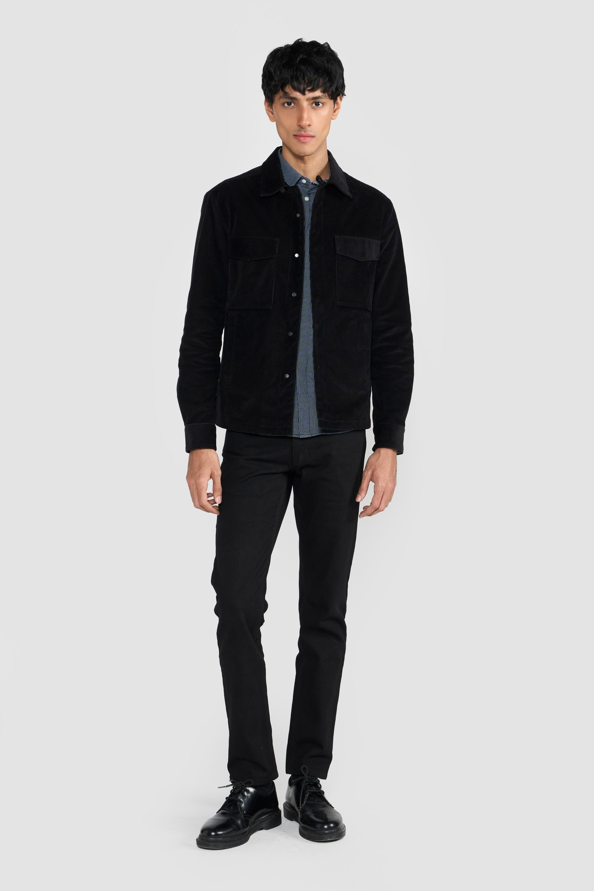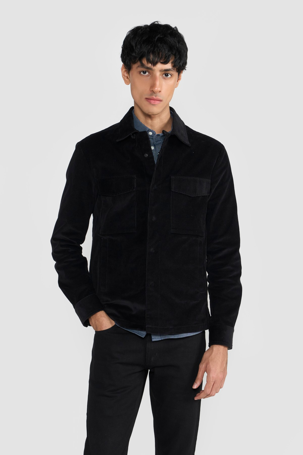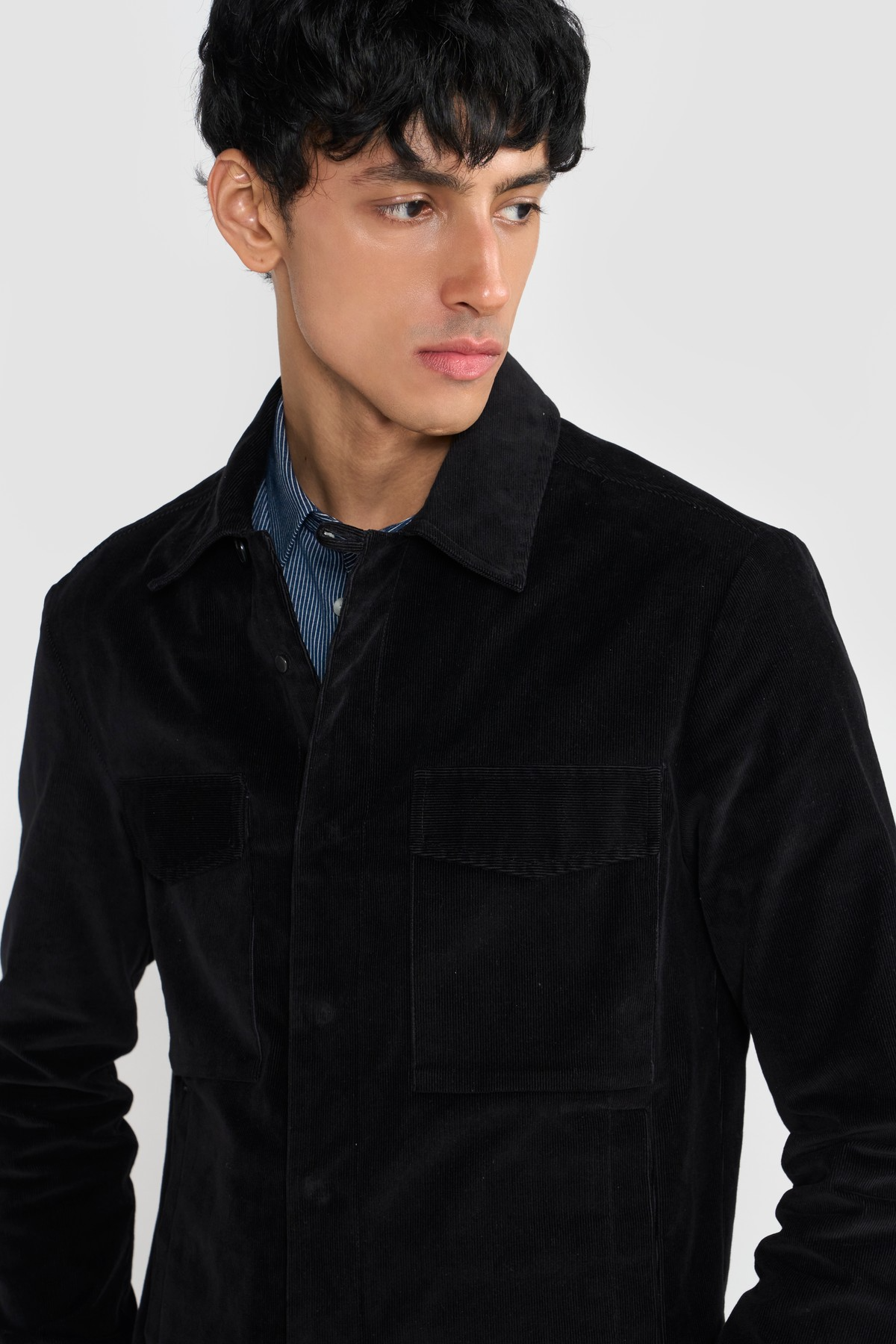 A wardrobe staple crafted in premium Japanese corduroy. Elevate your style with corduroy with shacket crafted from fine organic cotton yarn. The ANDREY shacket is styled with pointed shirt collar and flap chest pockets to set the look apart. These shackets can be dressed up or styled down. Each piece embodies our dedication to craftsmanship and textile innovation. Designed for modern living, these styles provide warmth without weight, making them perfect for layering. They bring subtle texture and refined structure to contemporary wardrobes—seamlessly suited for business, travel, and everyday wear.Relaxed Fit