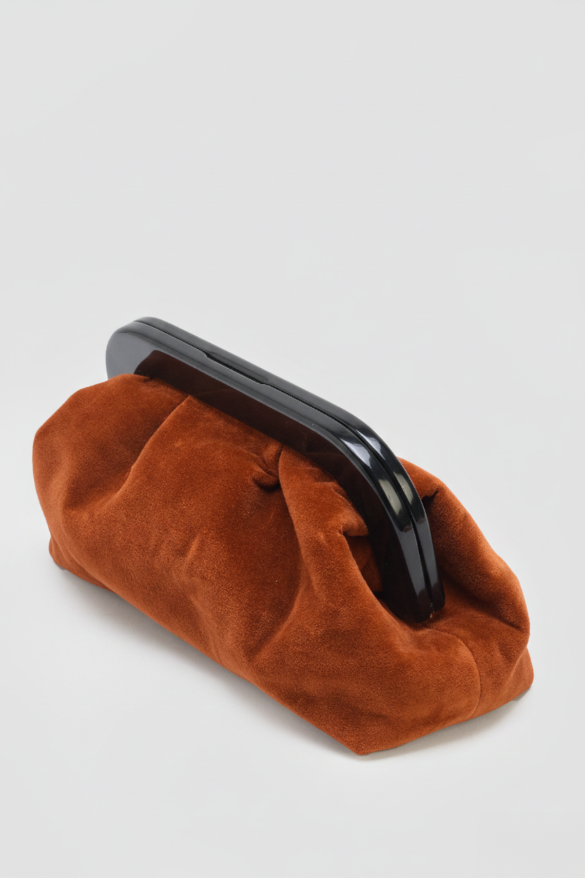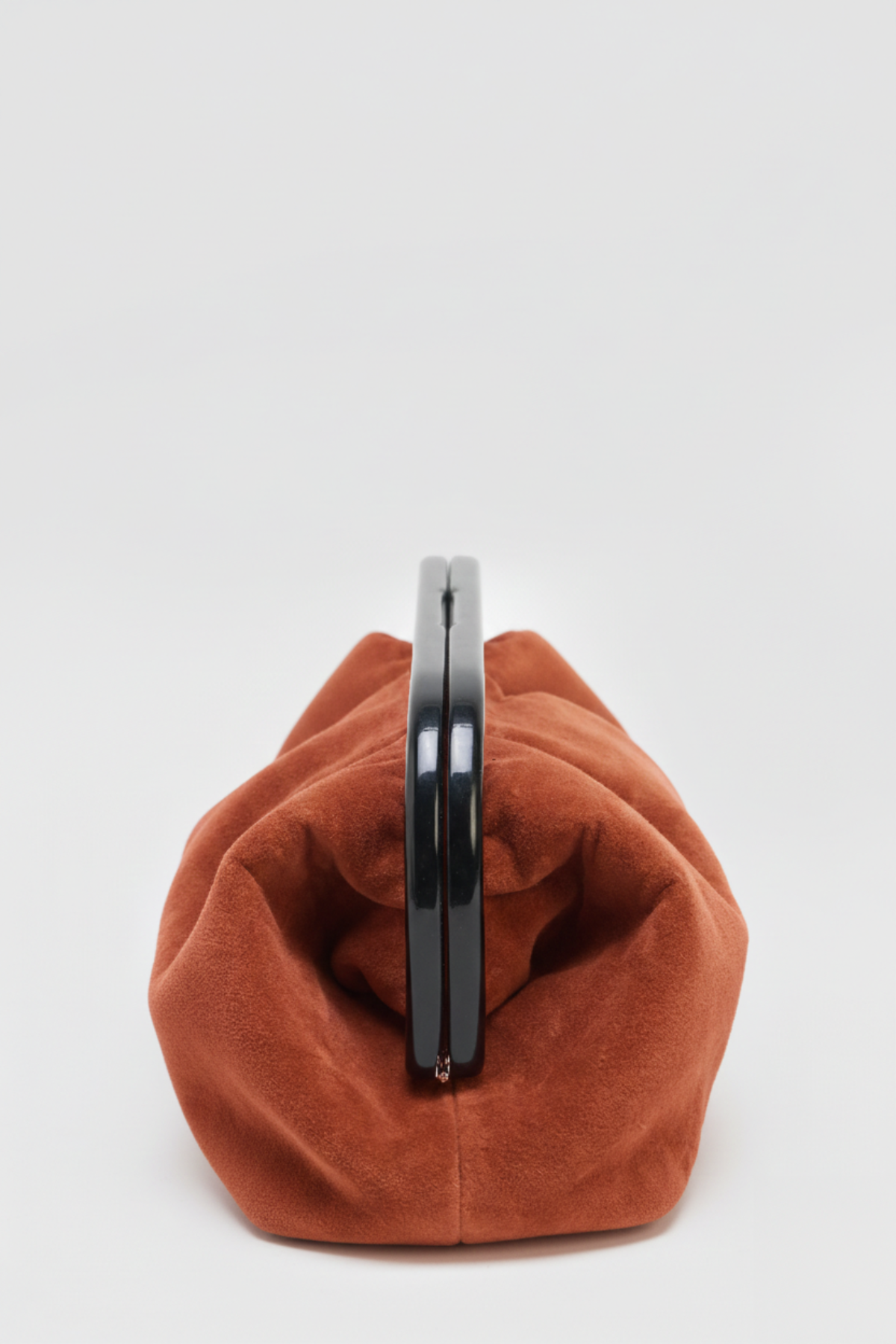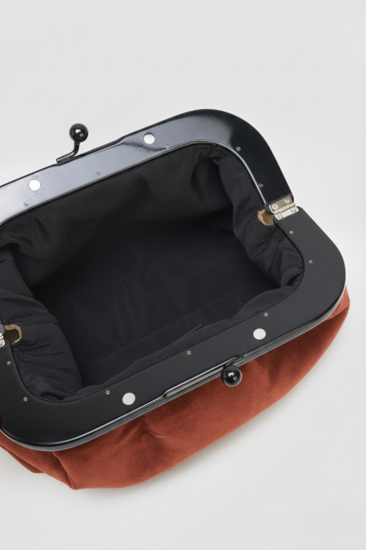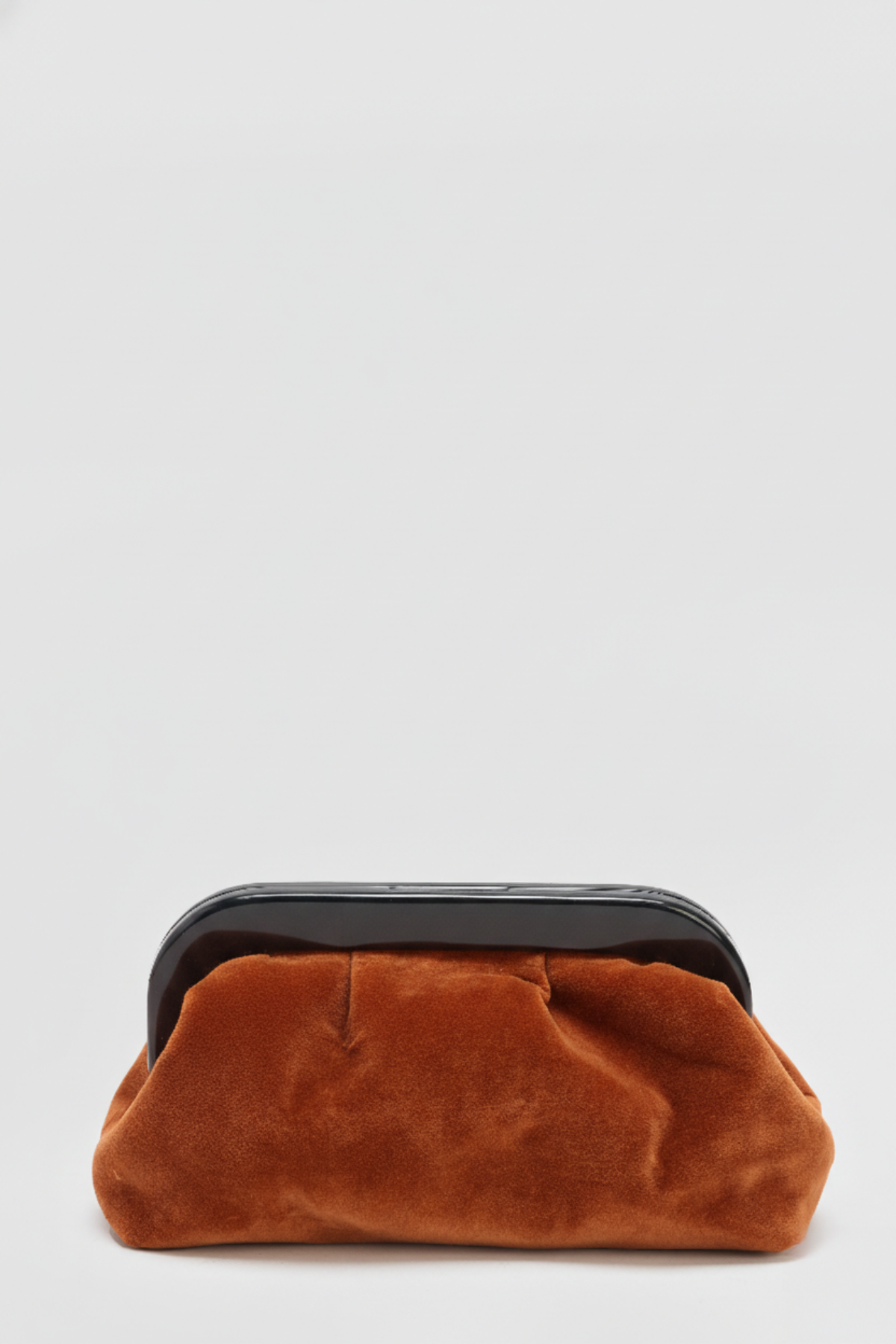 The AURA clutch blends a voluminous silhouette with a structured frame and premium velvet with a sumptuous texture and soft lustre. Its color-blocked frame introduces a metaphysical element to this iconic design, further enhanced by artistically crafted side grooves. Features a spacious main compartment, perfect for carrying all your essentials in style.