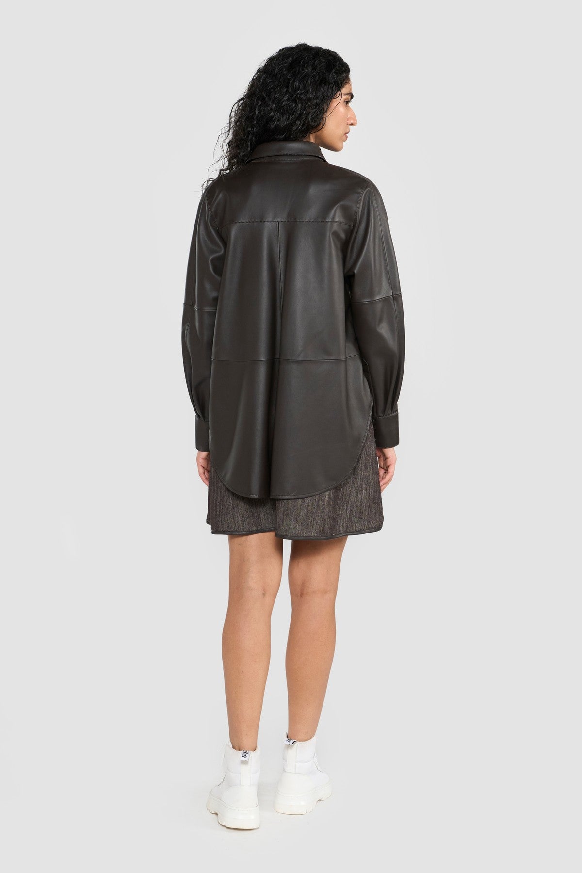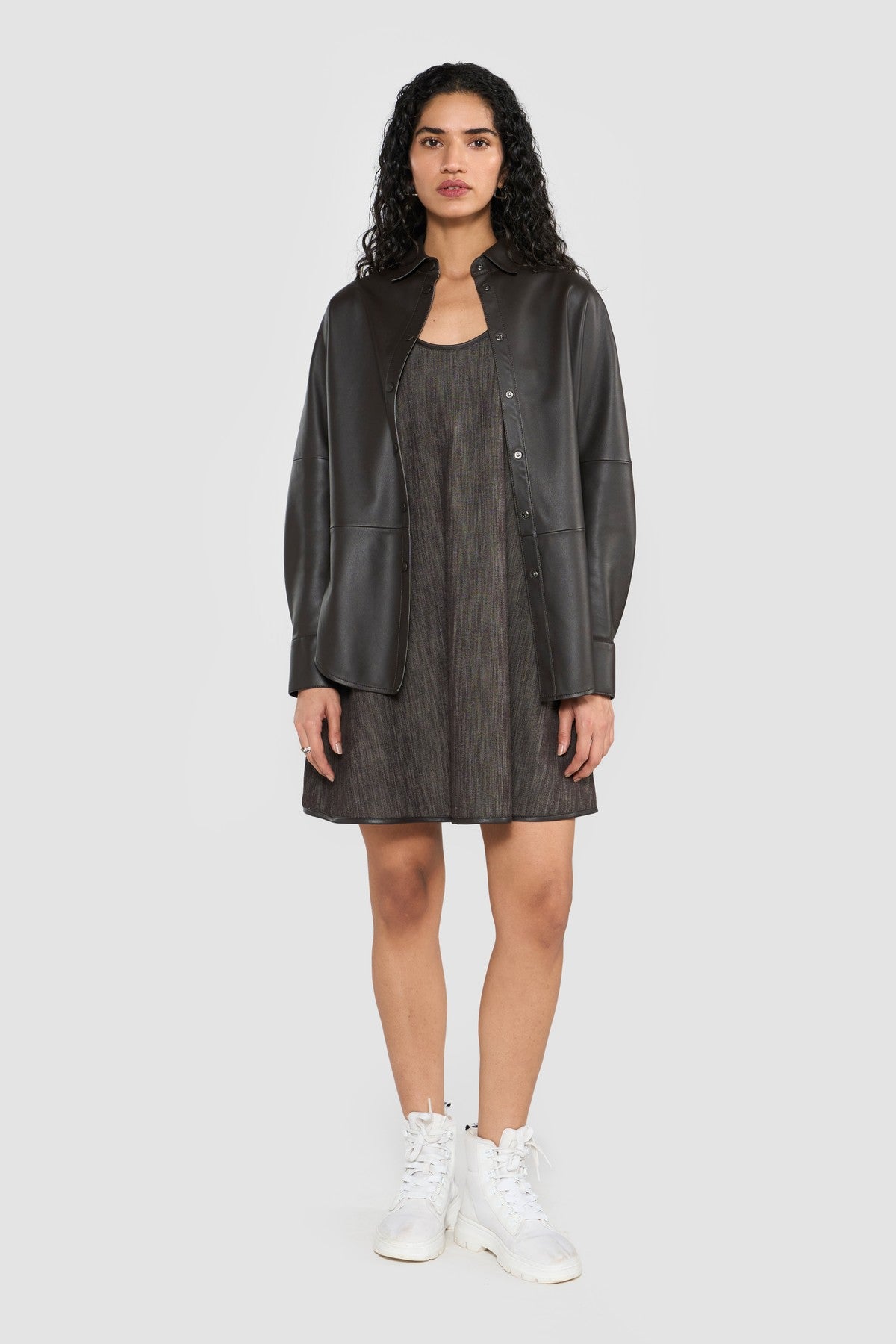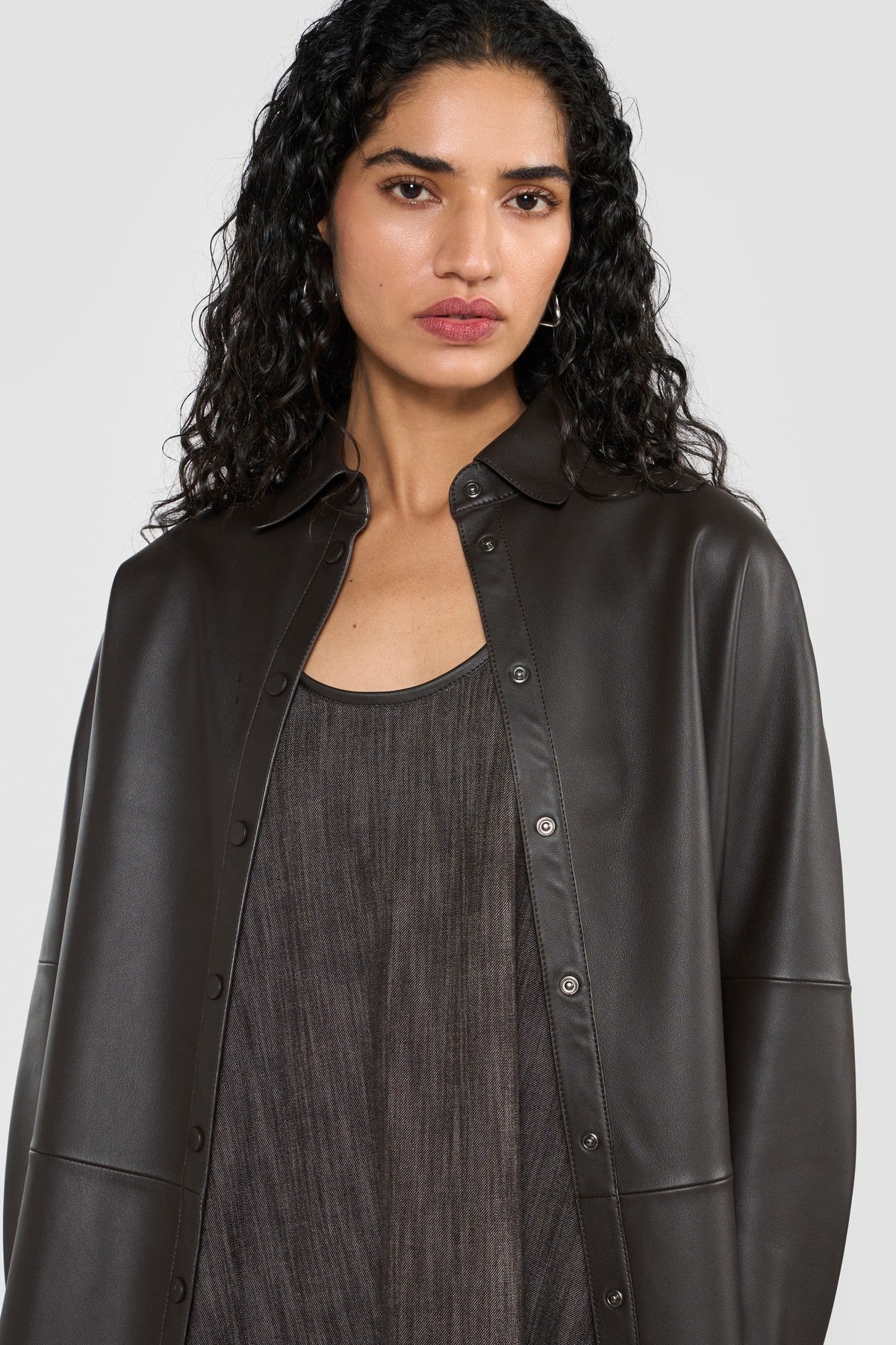 Perona’s modern shirt, designed to layer effortlessly over the tunic denim dress, is tailored in a relaxed silhouette defined by a sharp pointed collar, concealed placket, full sleeves, buttoned cuffs, and an elongating longline cut. Expertly crafted from LWG-certified premium lamb leather, it embodies understated luxury and modern refinement. Pair it with our exclusive LOUISA tunic dress to create a complete, iconic look.