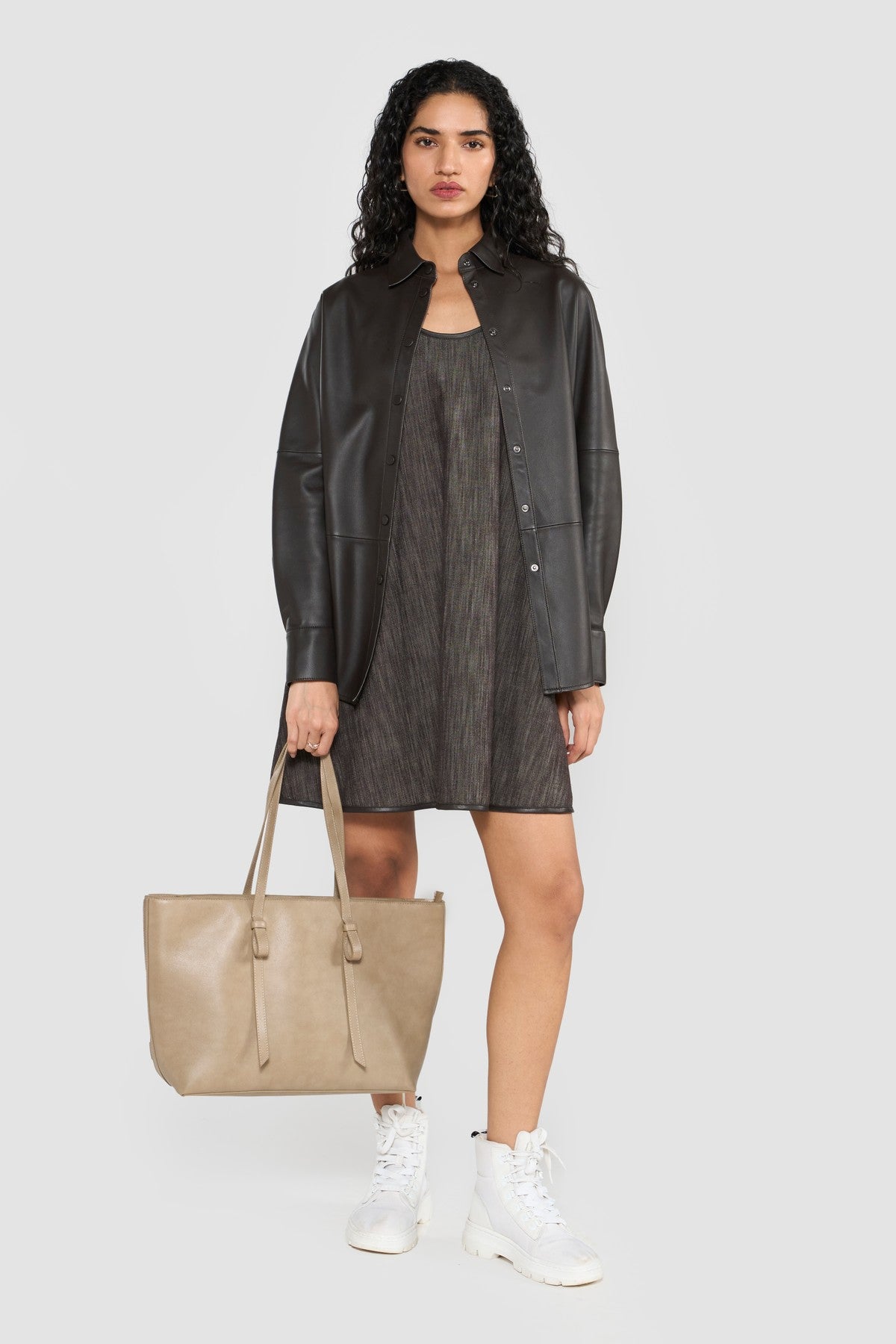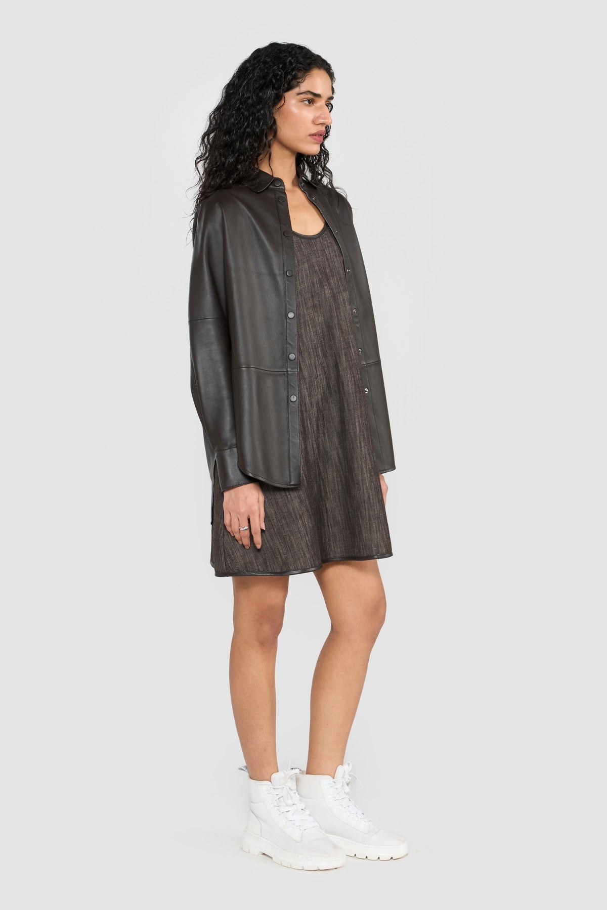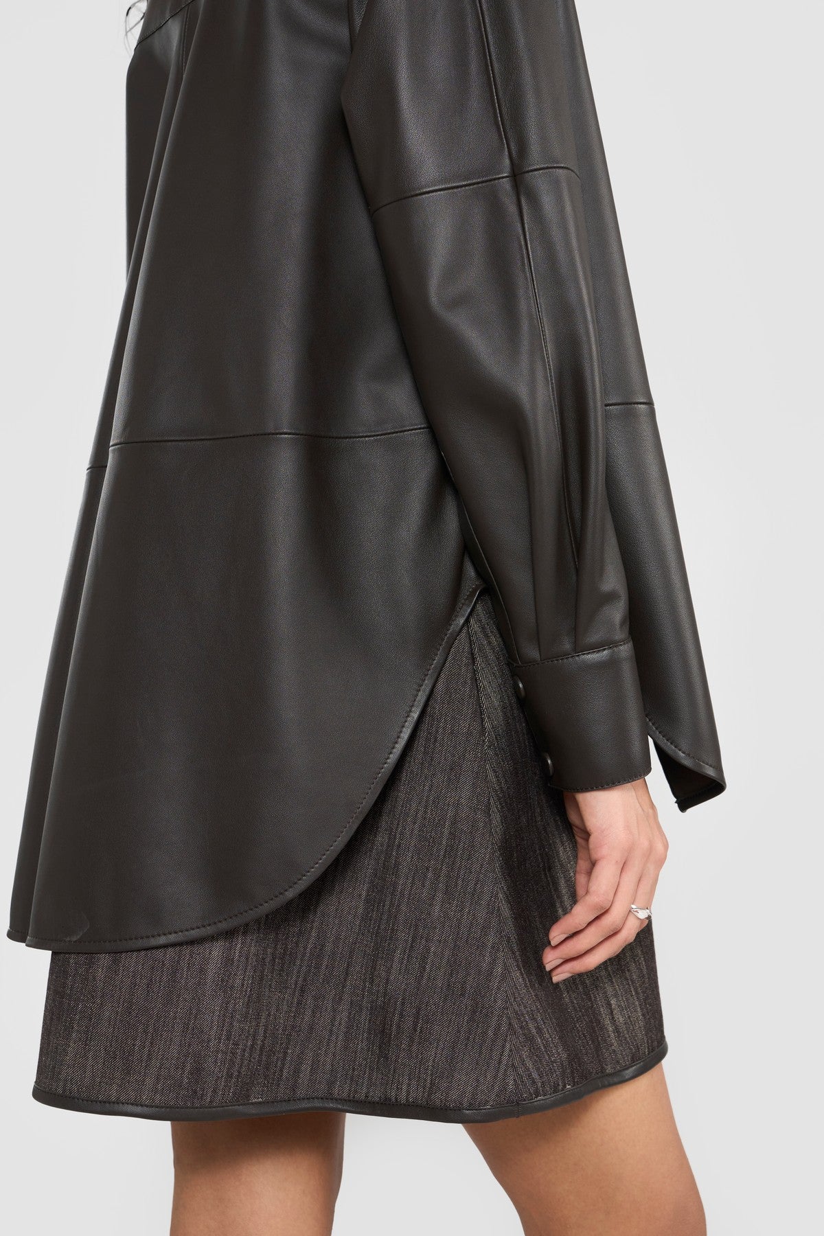 Perona’s modern shirt, designed to layer effortlessly over the tunic denim dress, is tailored in a relaxed silhouette defined by a sharp pointed collar, concealed placket, full sleeves, buttoned cuffs, and an elongating longline cut. Expertly crafted from LWG-certified premium lamb leather, it embodies understated luxury and modern refinement. Pair it with our exclusive LOUISA tunic dress to create a complete, iconic look.