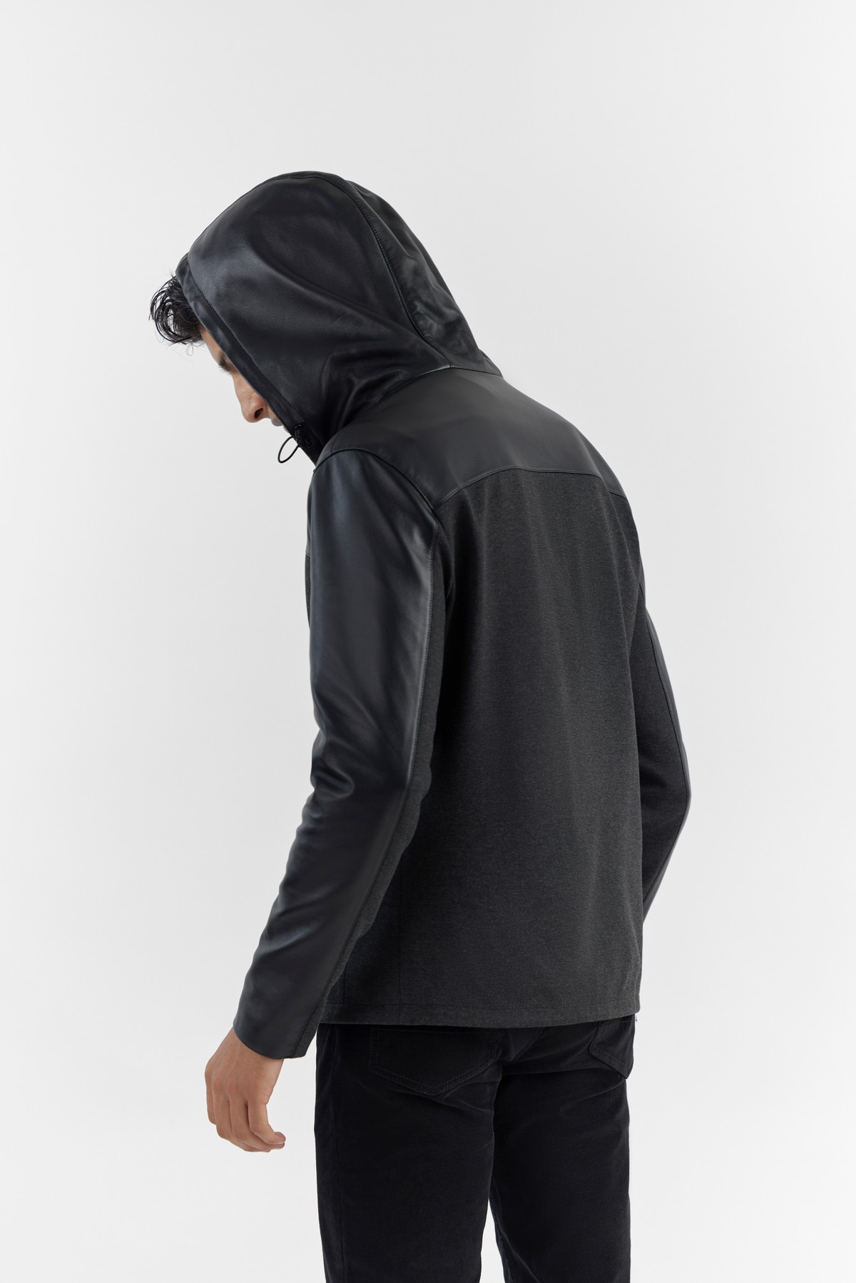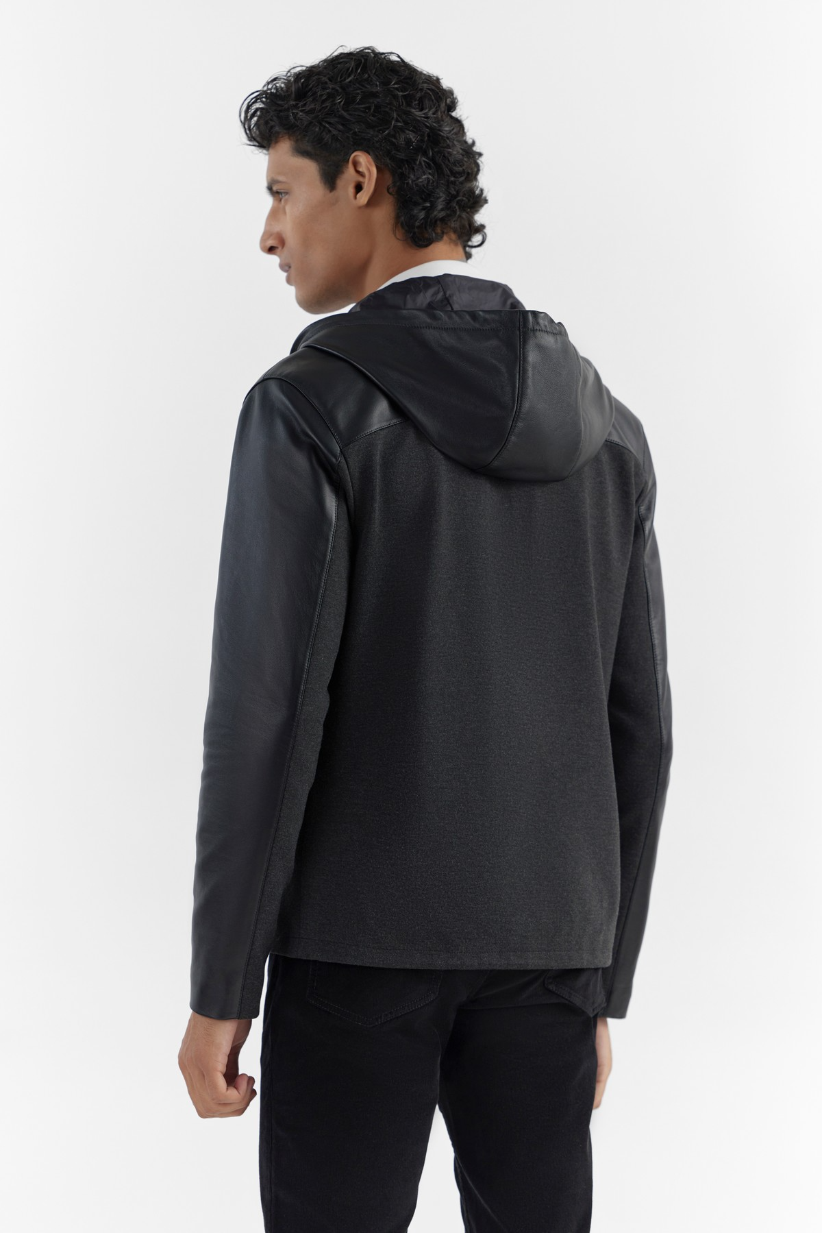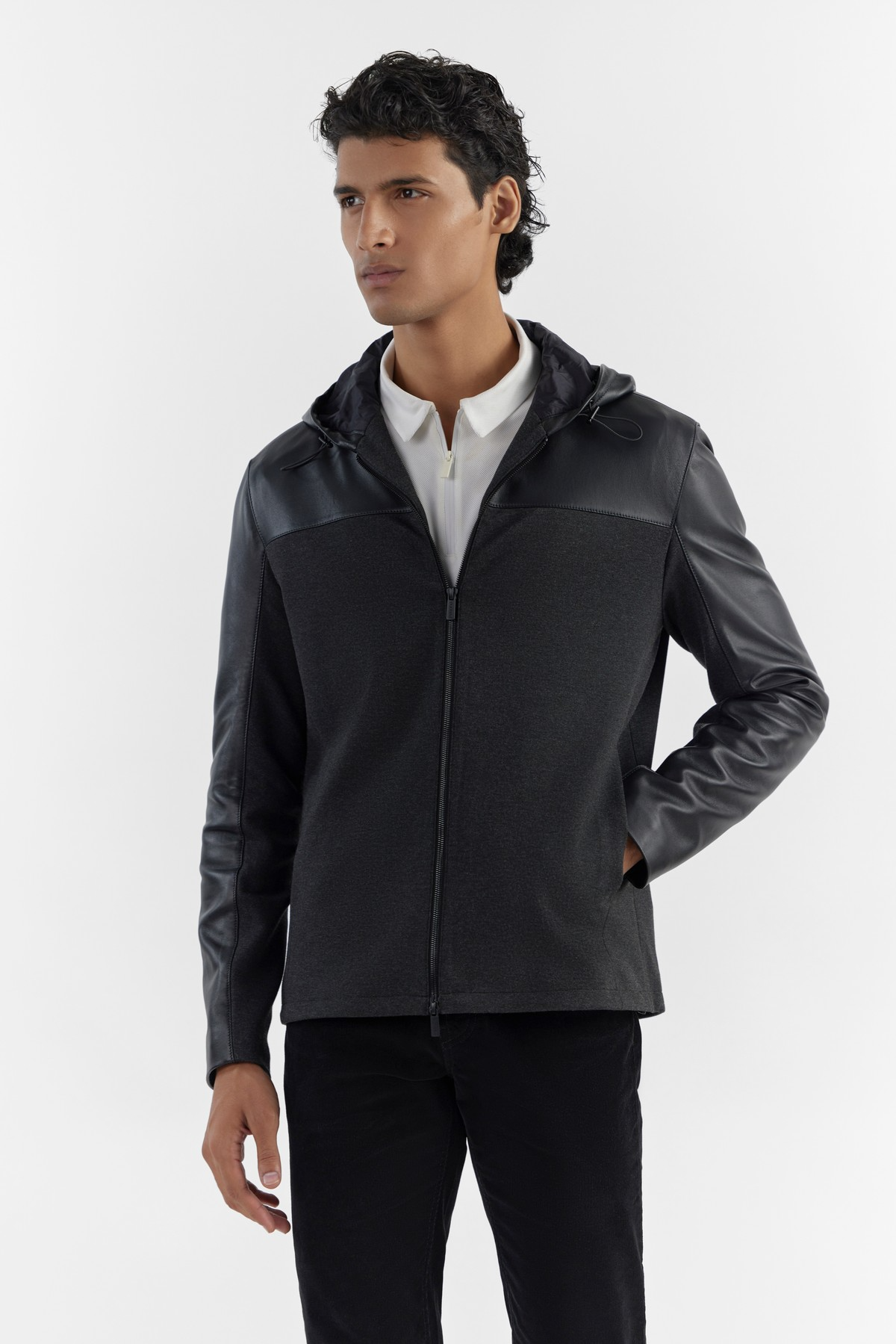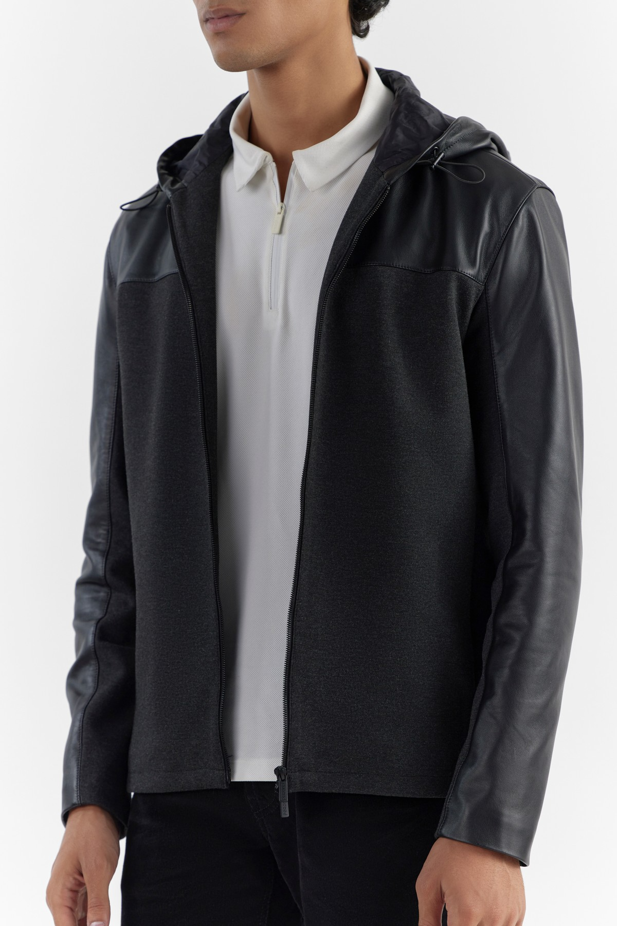 This practical and ergonomic hooded jacket is cut for a regular fit and is crafted in combination with soft-touch, 360 stretch ponte and LWG certified premium leather that perfectly complements athleisure lifestyles. Accentuated with hood, exclusive silhouette, zip closure and an interior bottom hem drawstring ensures the elegant fit and functionality.- Model height is 6'1" ft (185 cm ) and is wearing size M