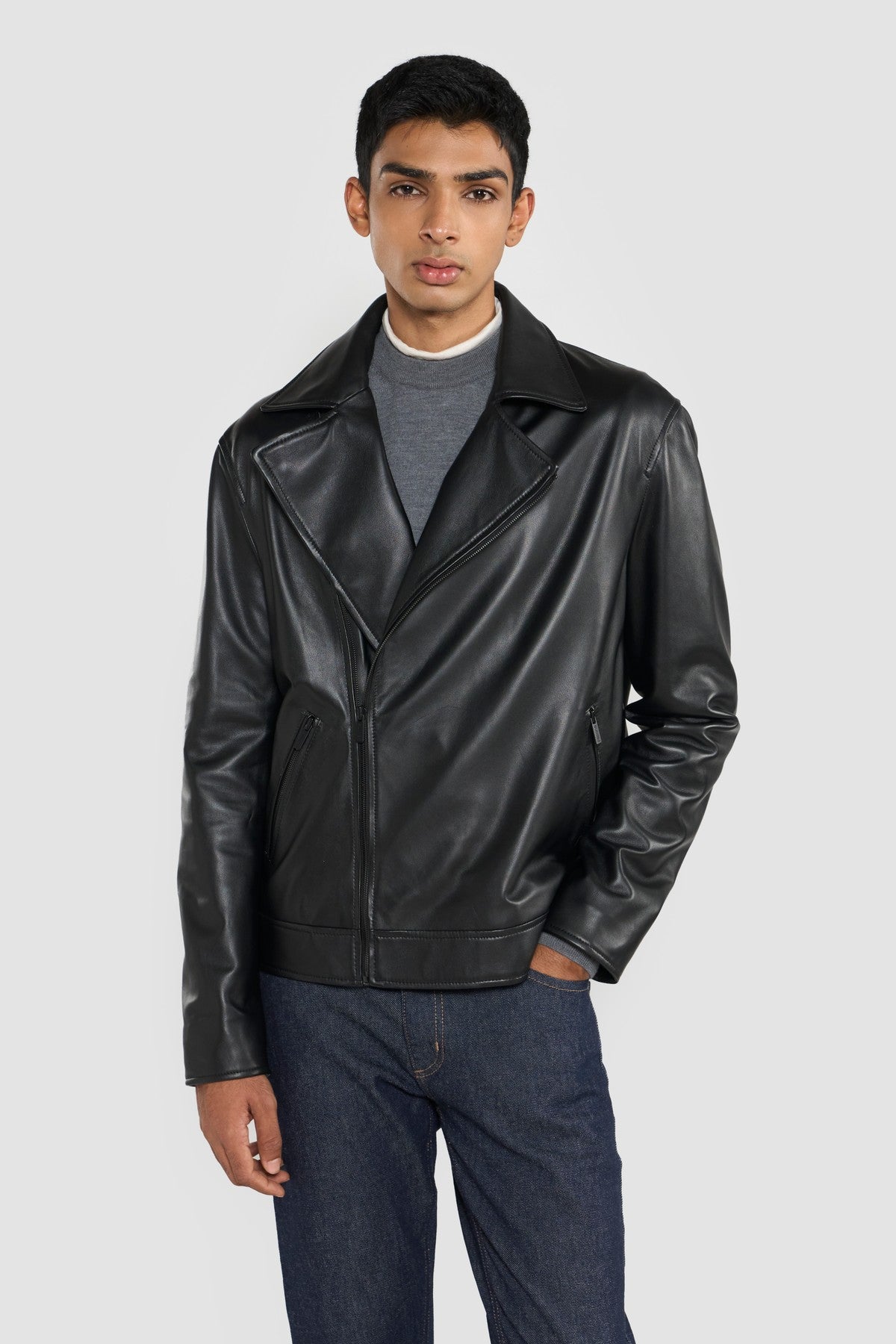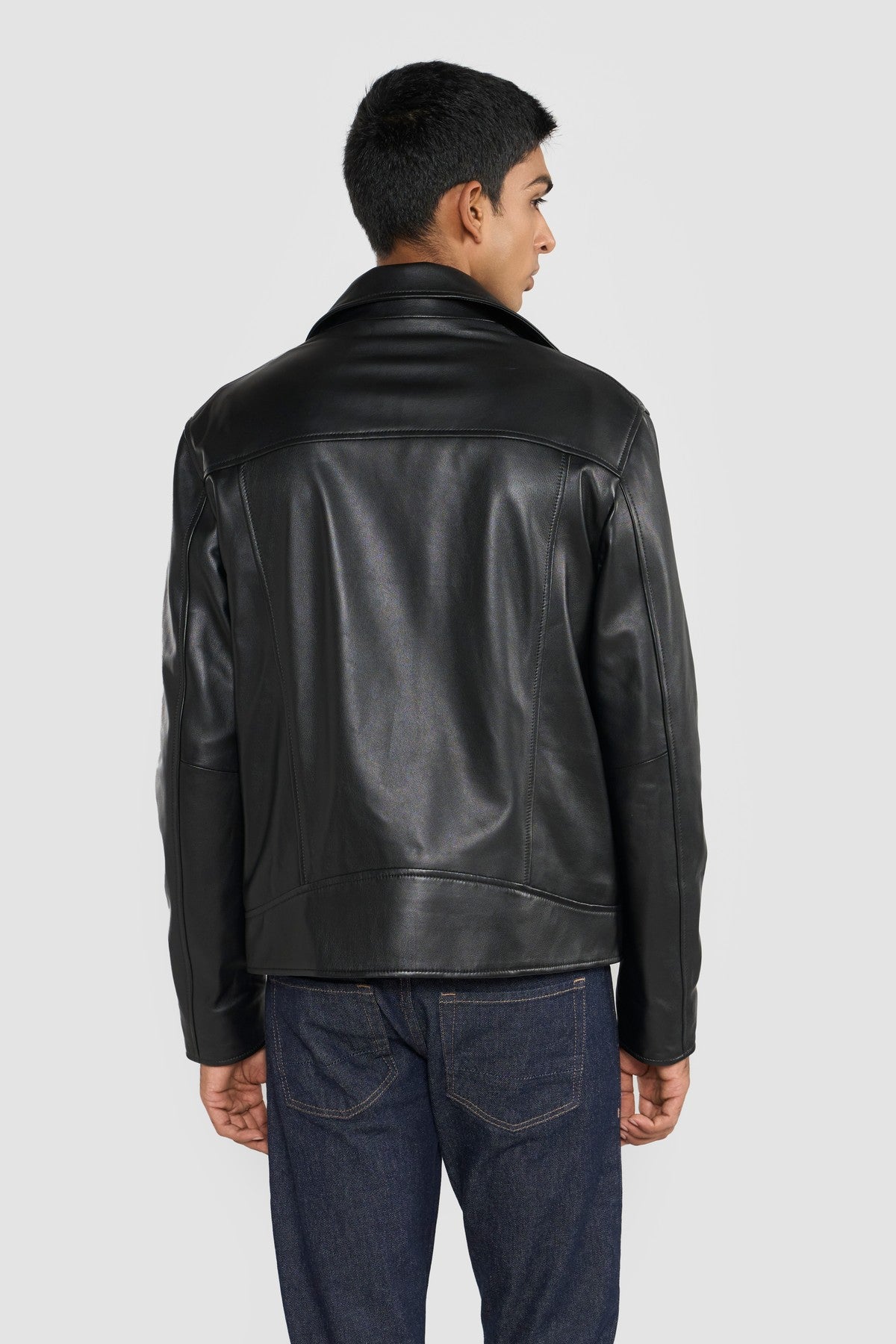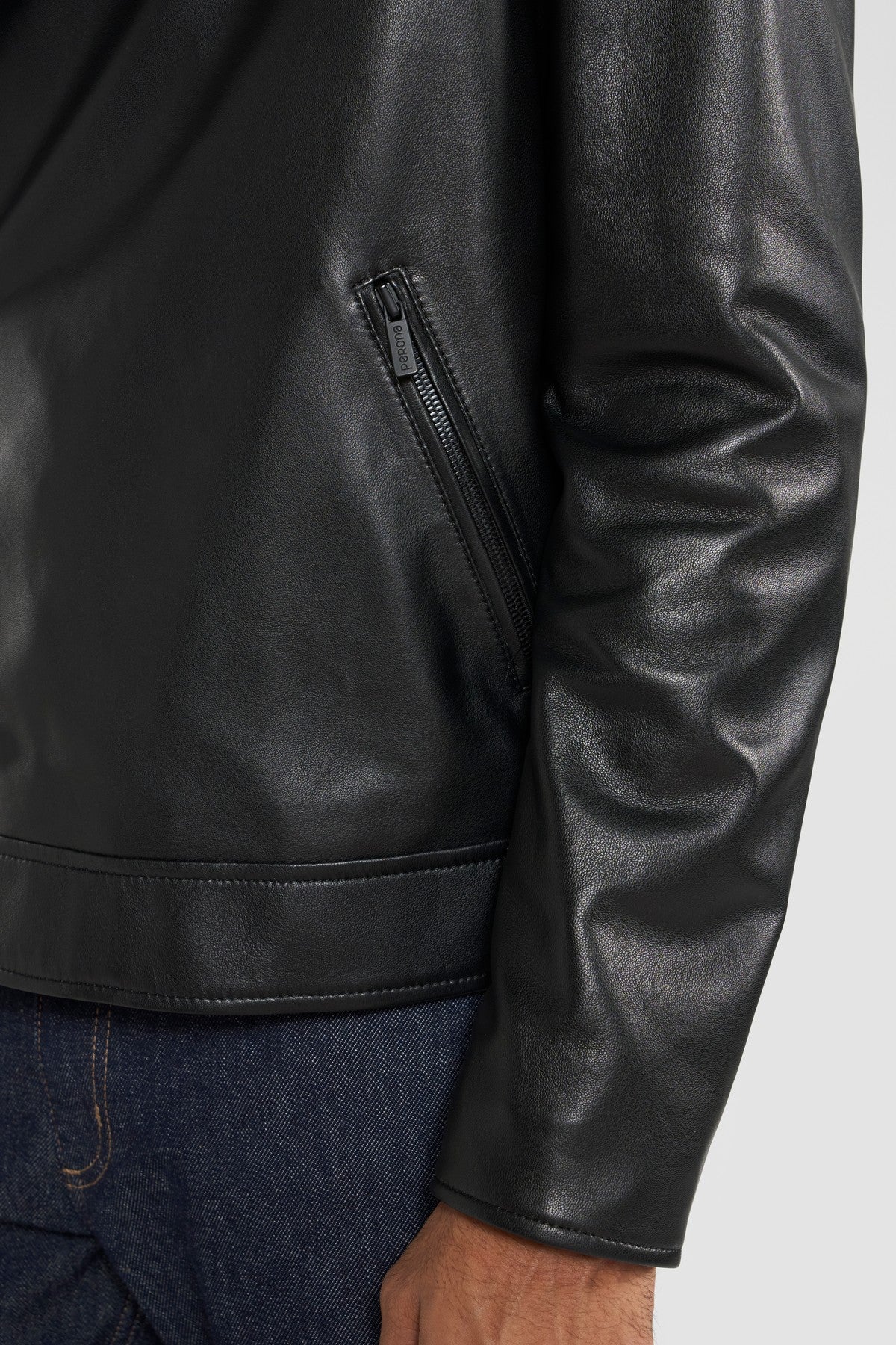 Refined materials and workmanship are paired with the Perona's modern and sleek biker jacket. The soft leather surface accentuated the depth of black colour. Featured withzipper closure and two side zipper pockets.