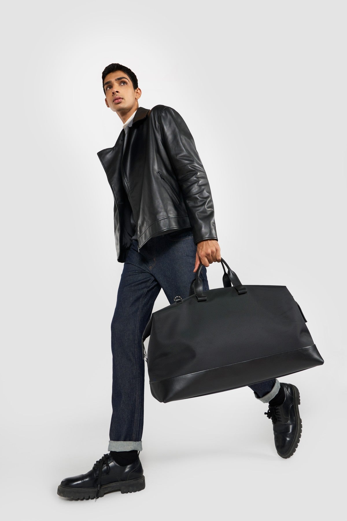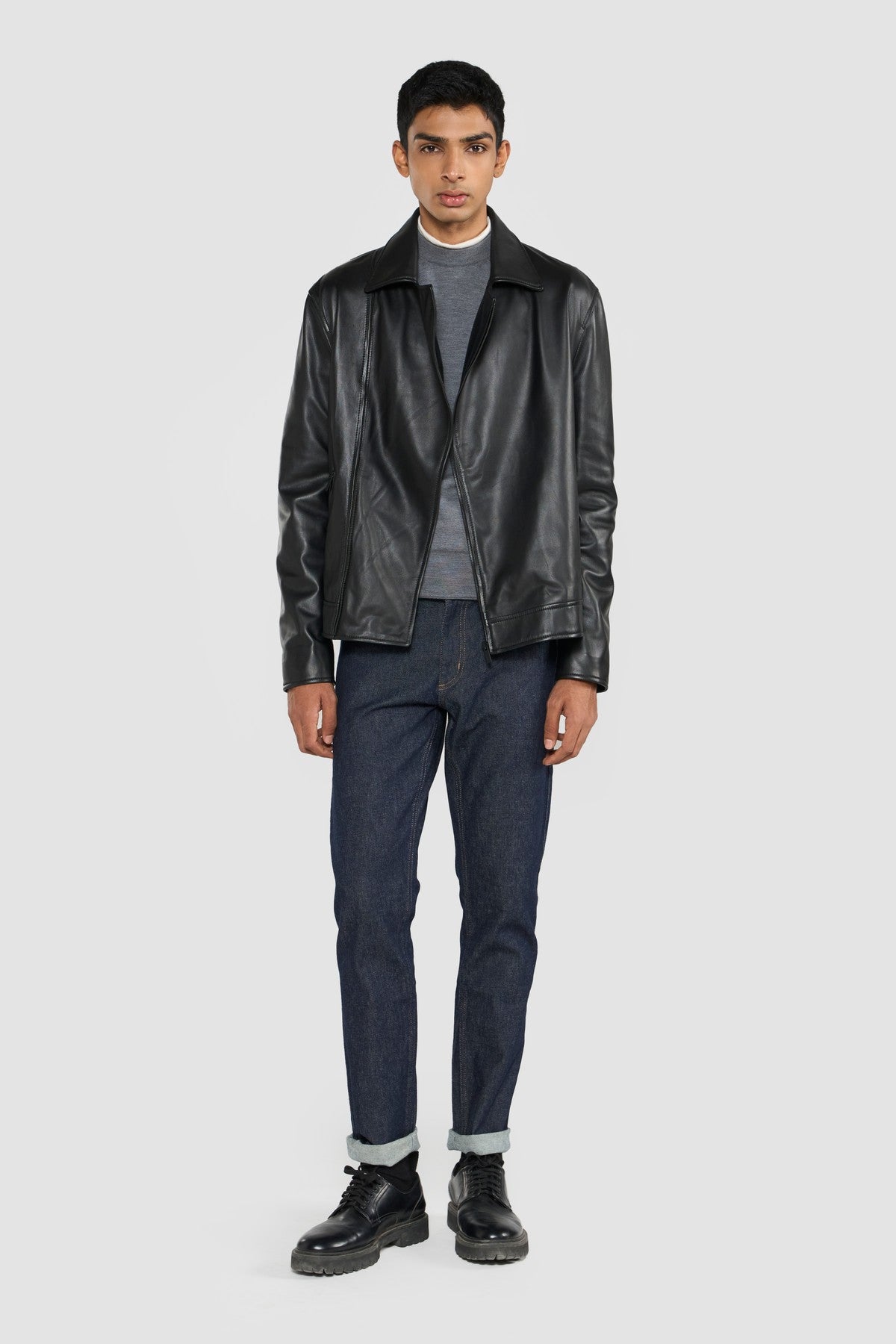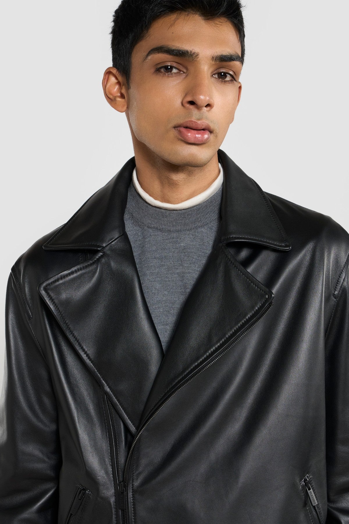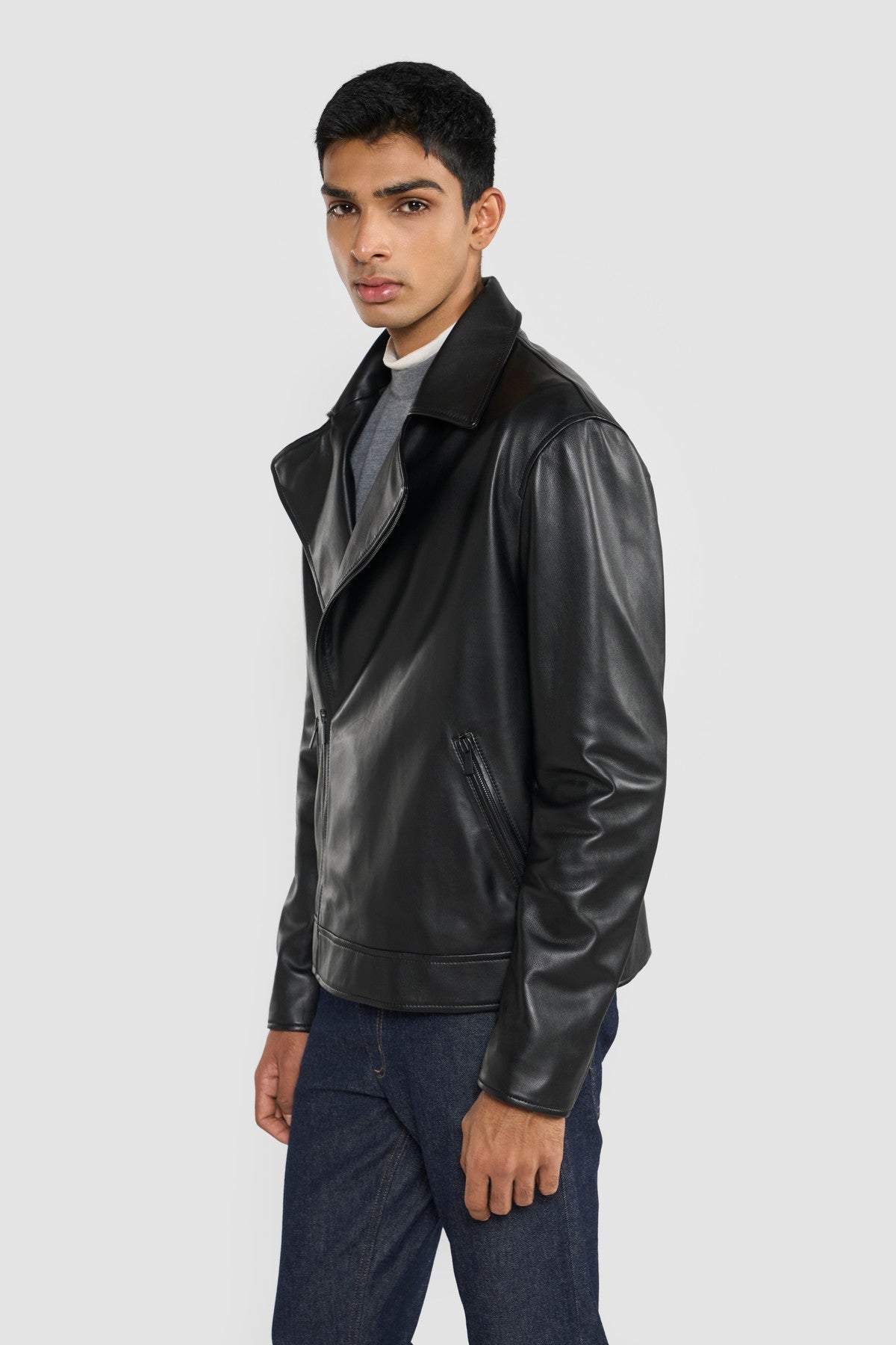 Refined materials and workmanship are paired with the Perona's modern and sleek biker jacket. The soft leather surface accentuated the depth of black colour. Featured withzipper closure and two side zipper pockets.