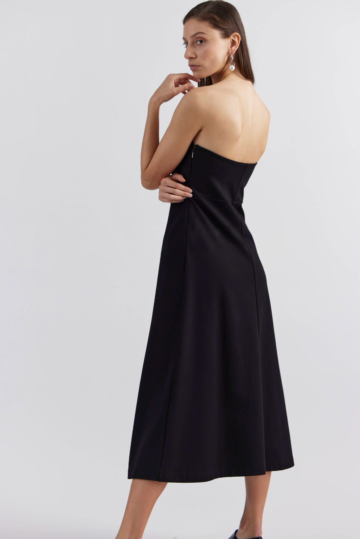 Crafted from a premium Japanese rayon blend ponte this black off shoulder midi dress is cut for a close fit. An elegant option for evening, it features a bandeau neckline, detachable minimal straps and shaping at the waist to highlight the silhouette. Rayon is a plant based material which consists of cellulose fiber, made from dissolving pulp along with high absorbent and breathability features.