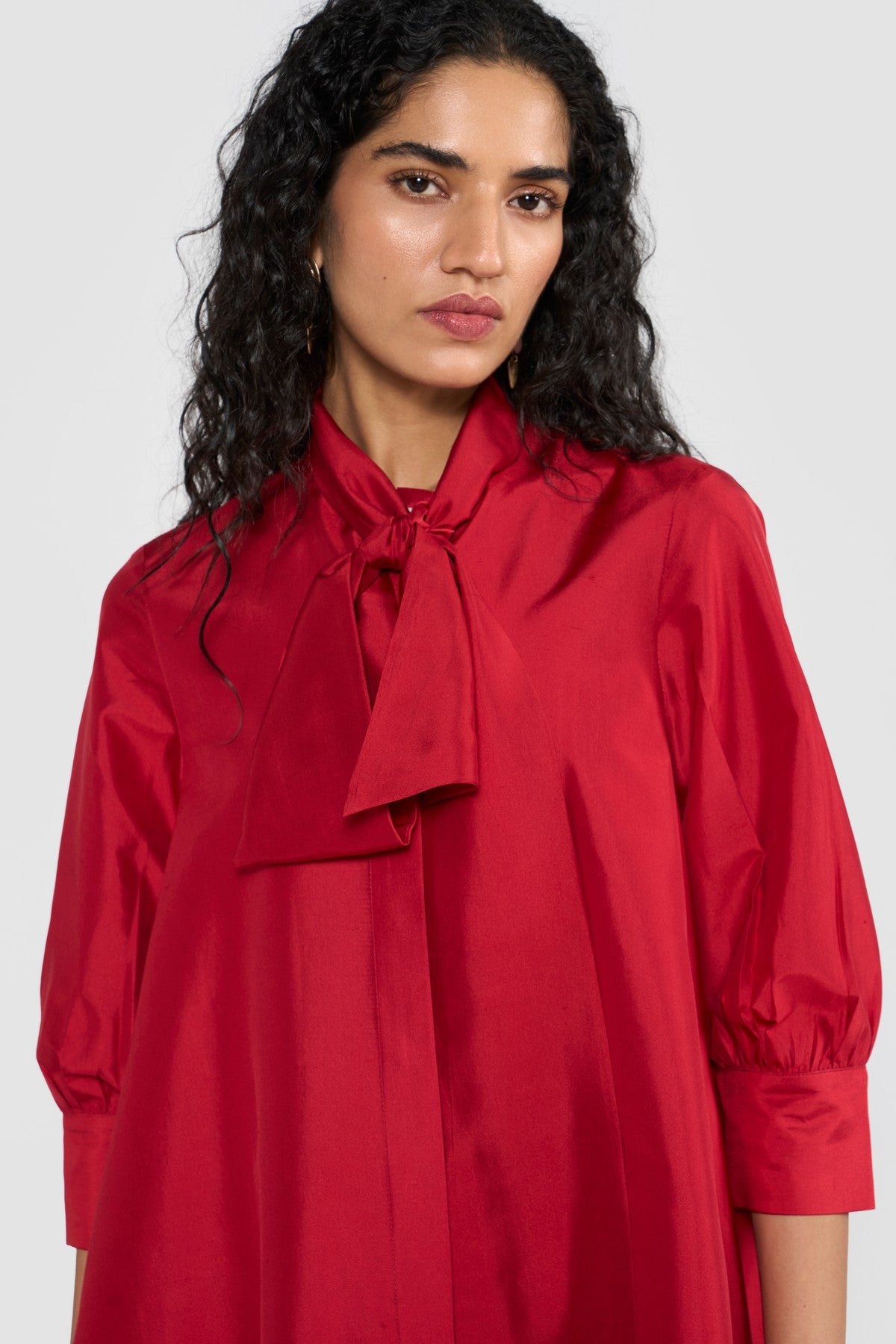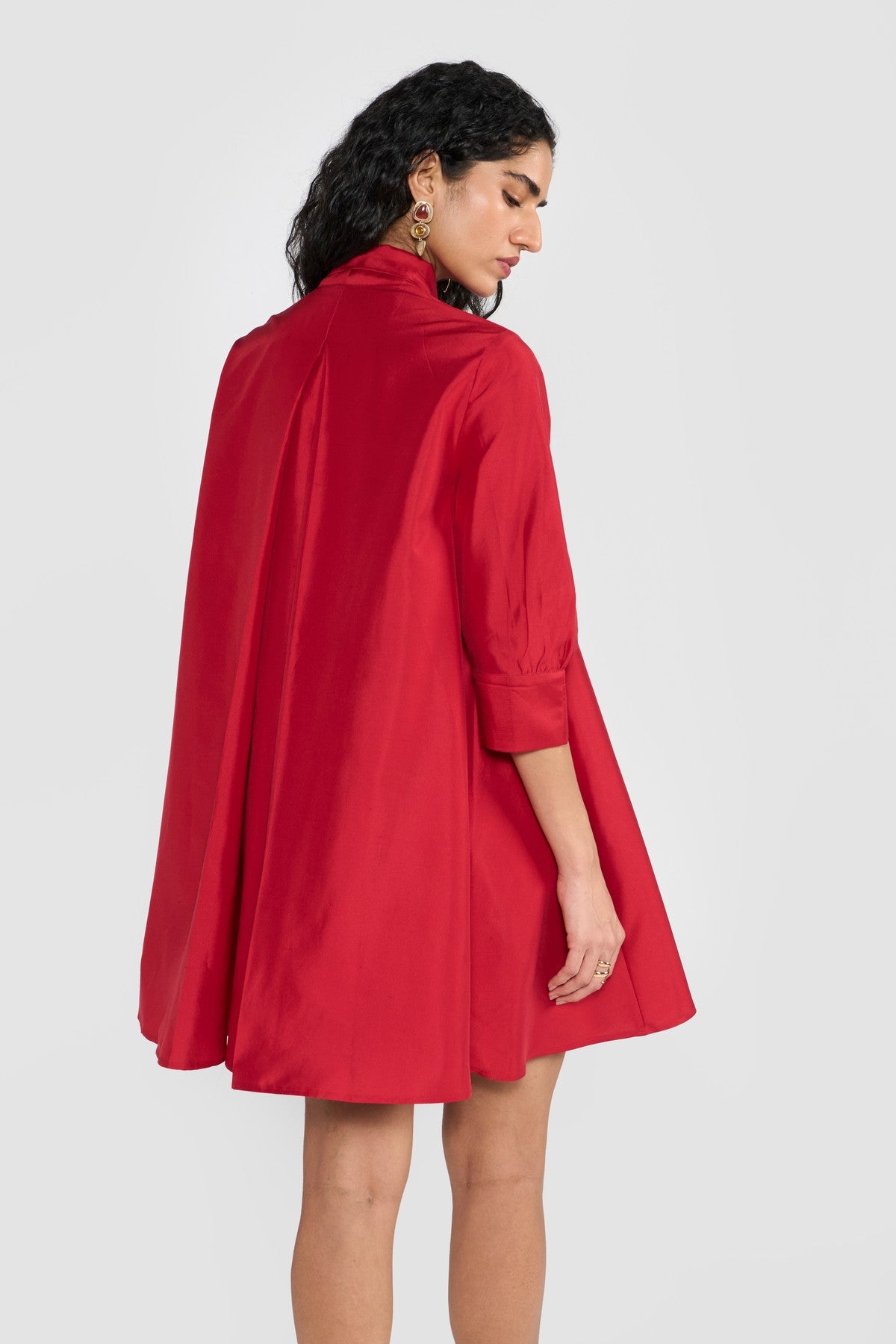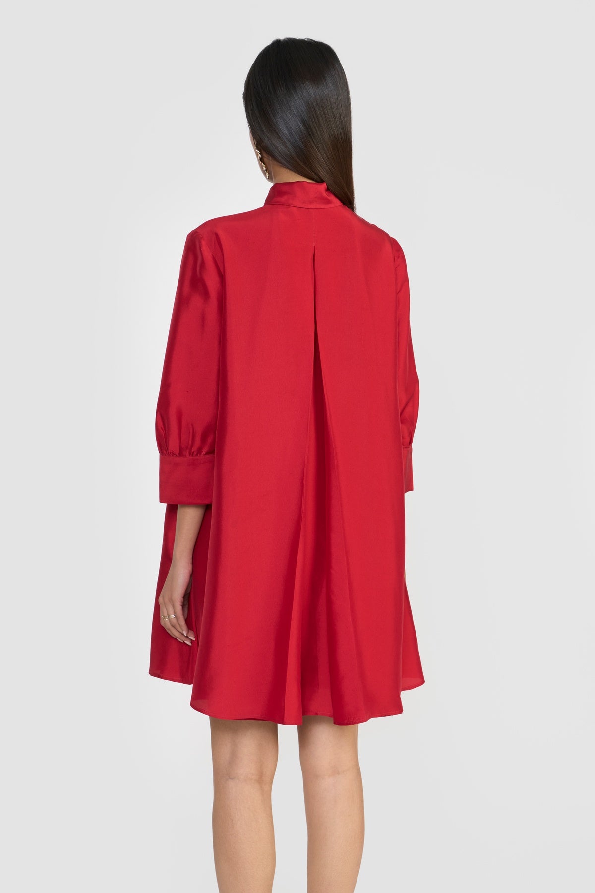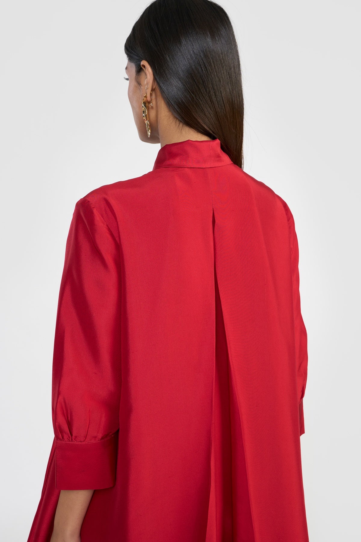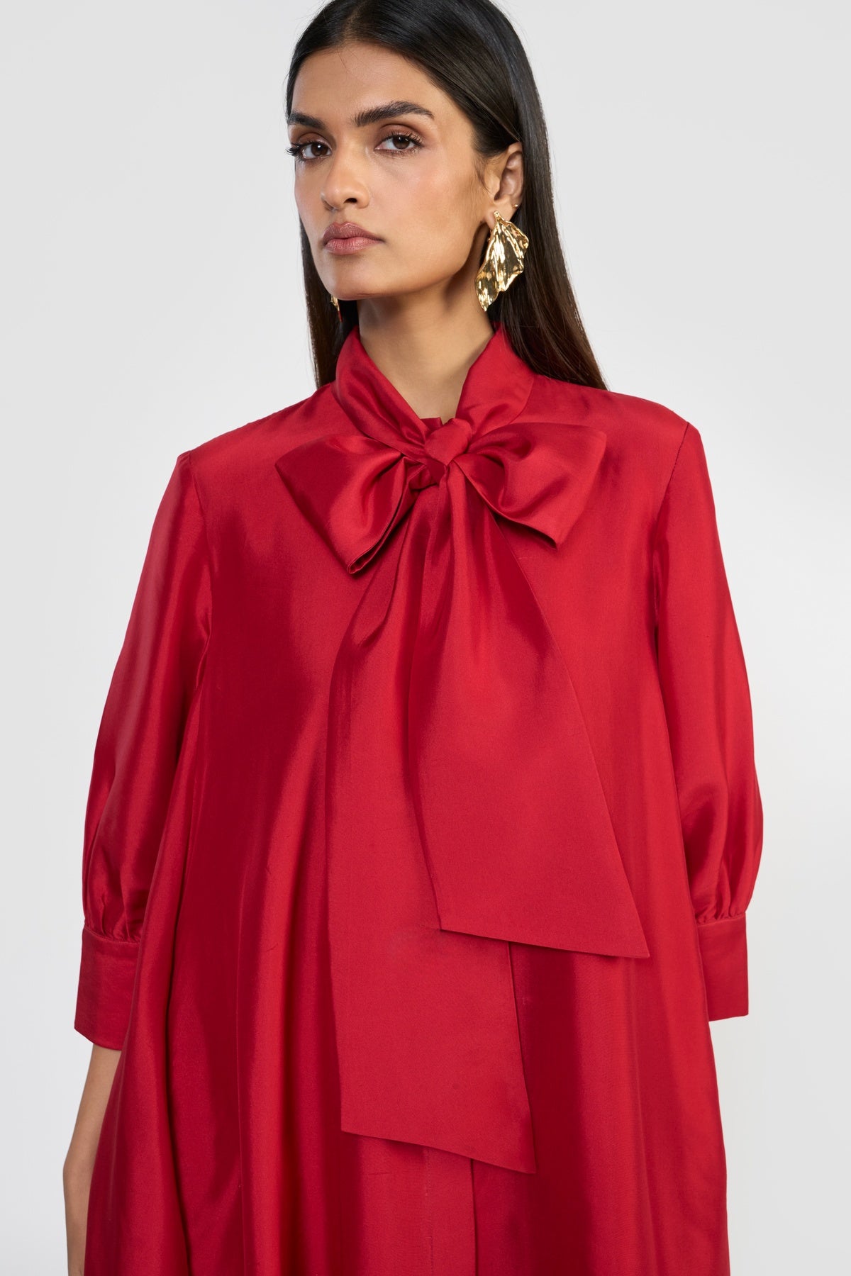 Crafted from premium silk taffeta and accented with an attached scarf collar, CELINE is designed for a relaxed, effortless fit. Its fluted hem creates a graceful A-line silhouette, complemented by a shirt collar, long sleeves, and a back box pleat for subtle volume and movement. Made from sustainably sourced viscose fibre derived from wood cellulose, this piece blends soft, structured textures with fluid silhouettes, offering a tactile expression of contemporary elegance.