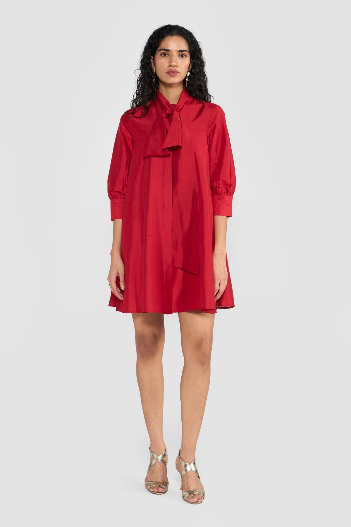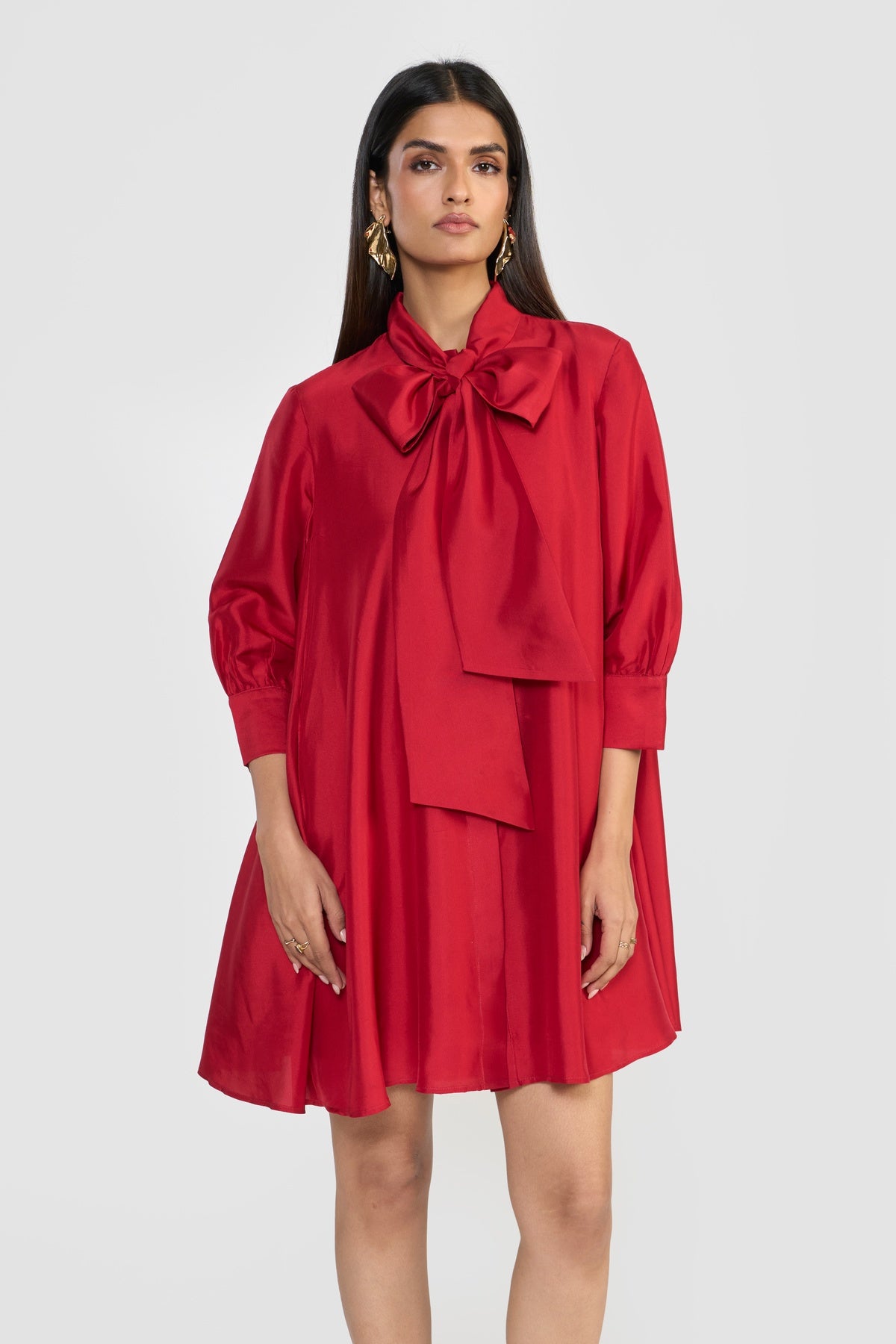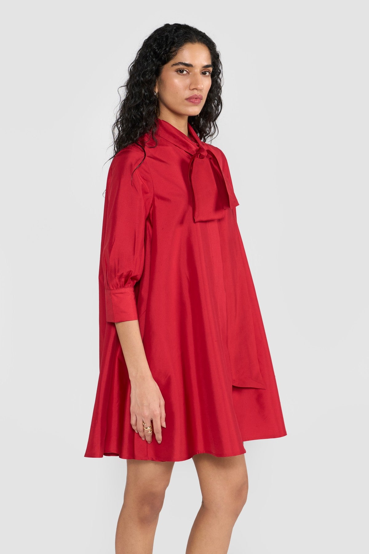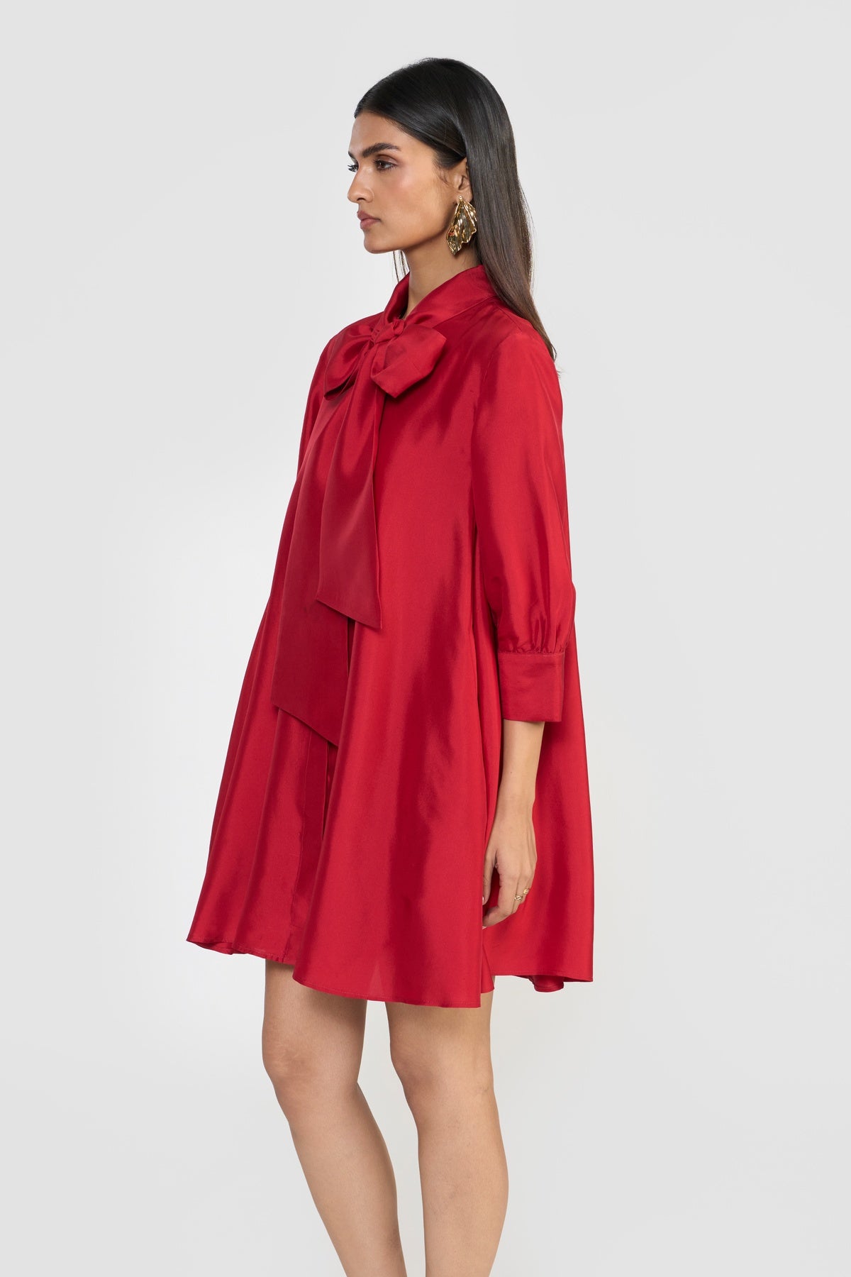 Crafted from premium silk taffeta and accented with an attached scarf collar, CELINE is designed for a relaxed, effortless fit. Its fluted hem creates a graceful A-line silhouette, complemented by a shirt collar, long sleeves, and a back box pleat for subtle volume and movement. Made from sustainably sourced viscose fibre derived from wood cellulose, this piece blends soft, structured textures with fluid silhouettes, offering a tactile expression of contemporary elegance.