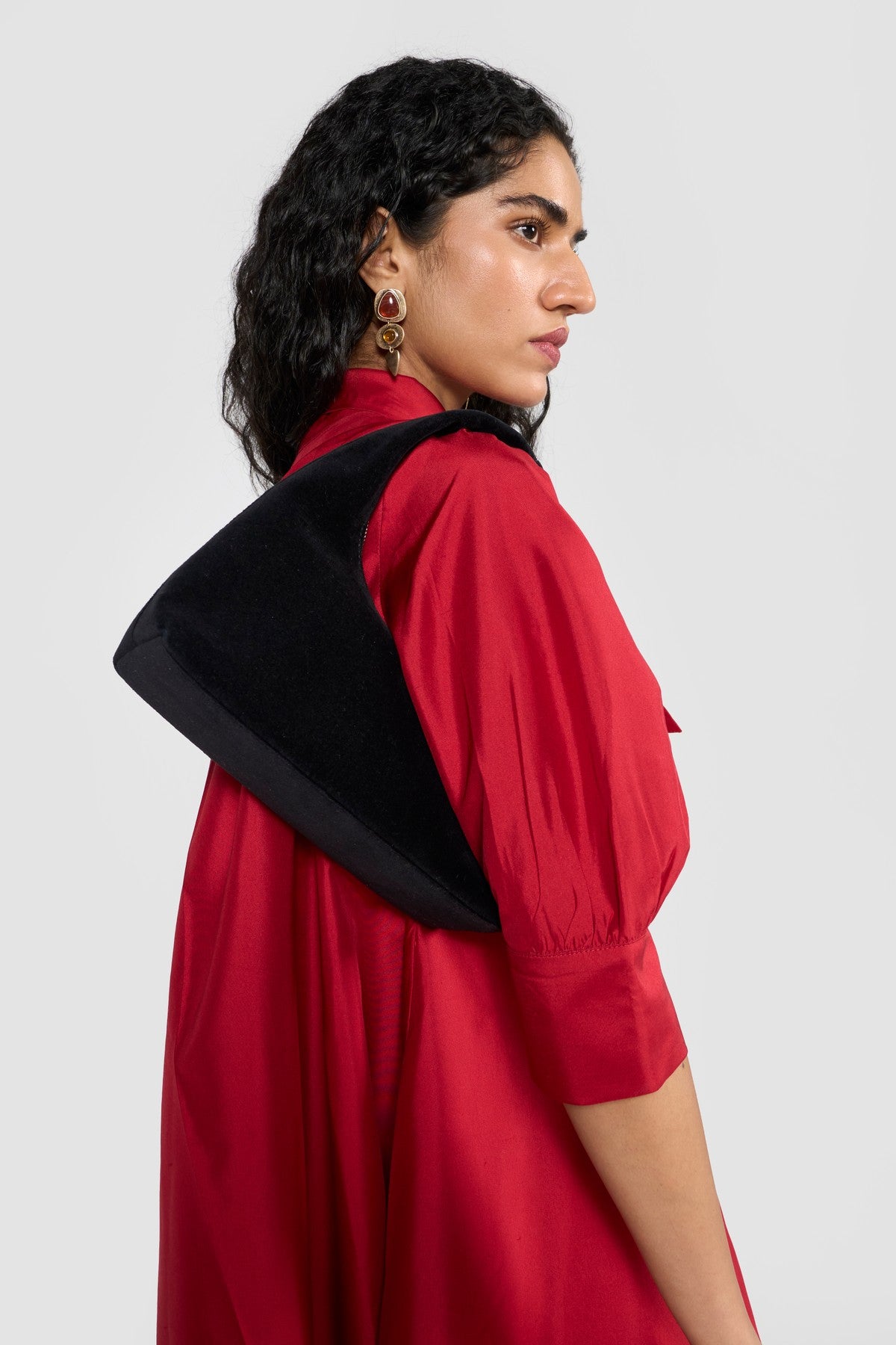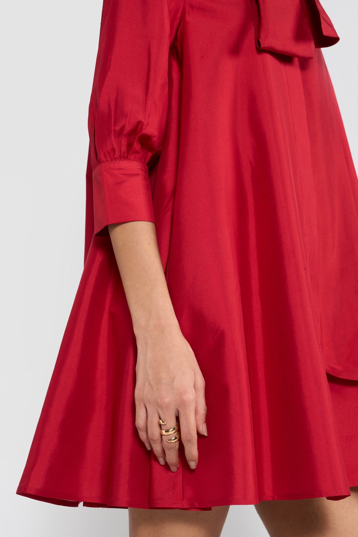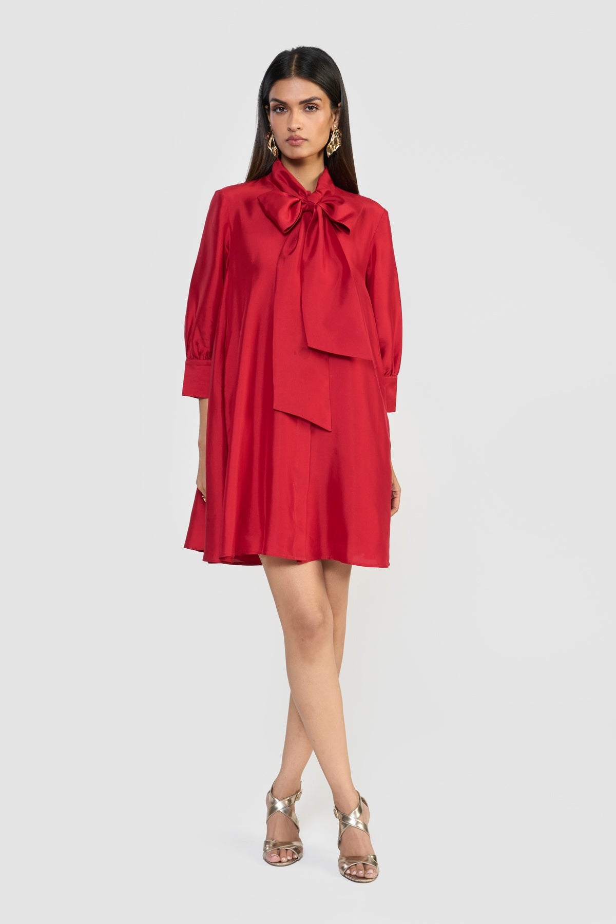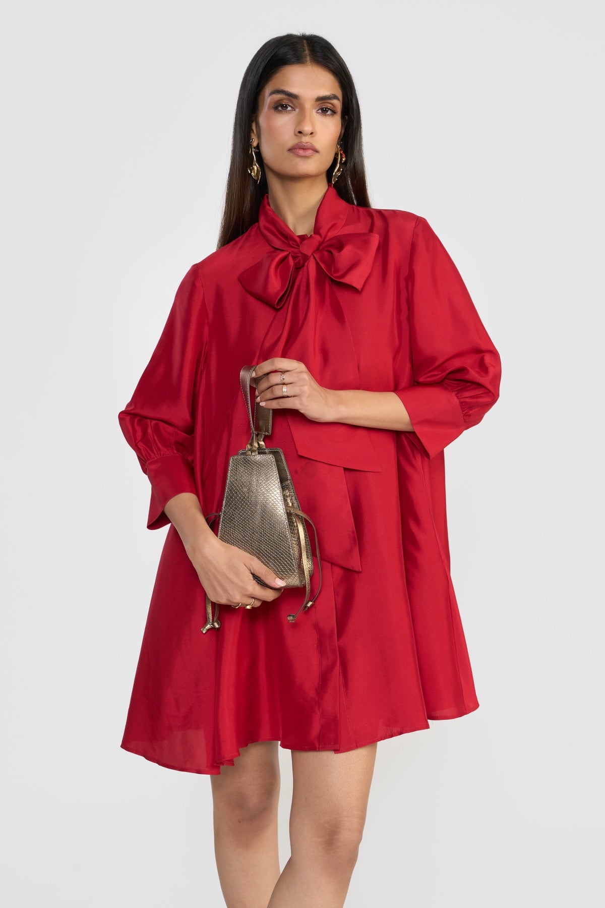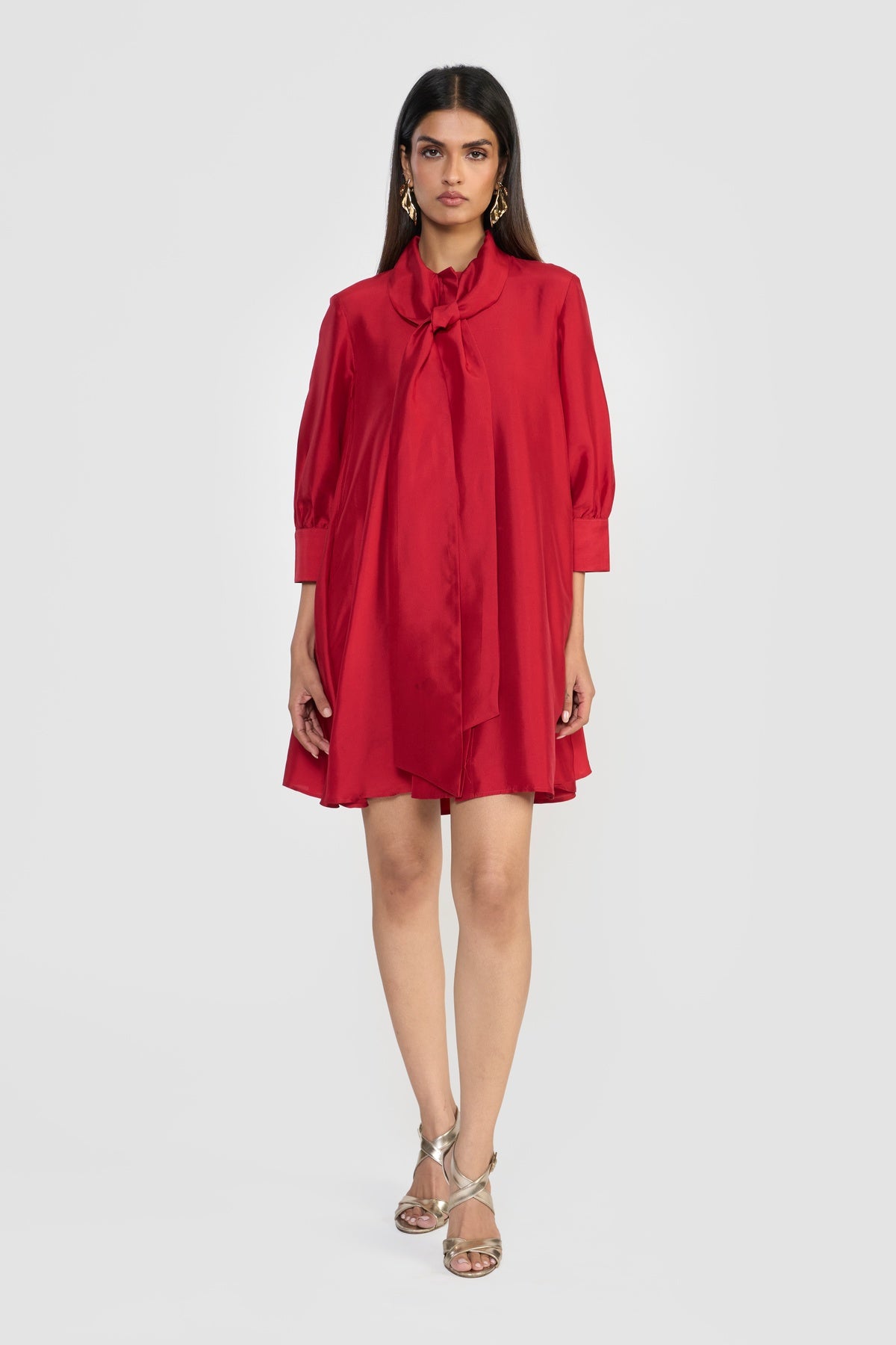 Crafted from premium silk taffeta and accented with an attached scarf collar, CELINE is designed for a relaxed, effortless fit. Its fluted hem creates a graceful A-line silhouette, complemented by a shirt collar, long sleeves, and a back box pleat for subtle volume and movement. Made from sustainably sourced viscose fibre derived from wood cellulose, this piece blends soft, structured textures with fluid silhouettes, offering a tactile expression of contemporary elegance.