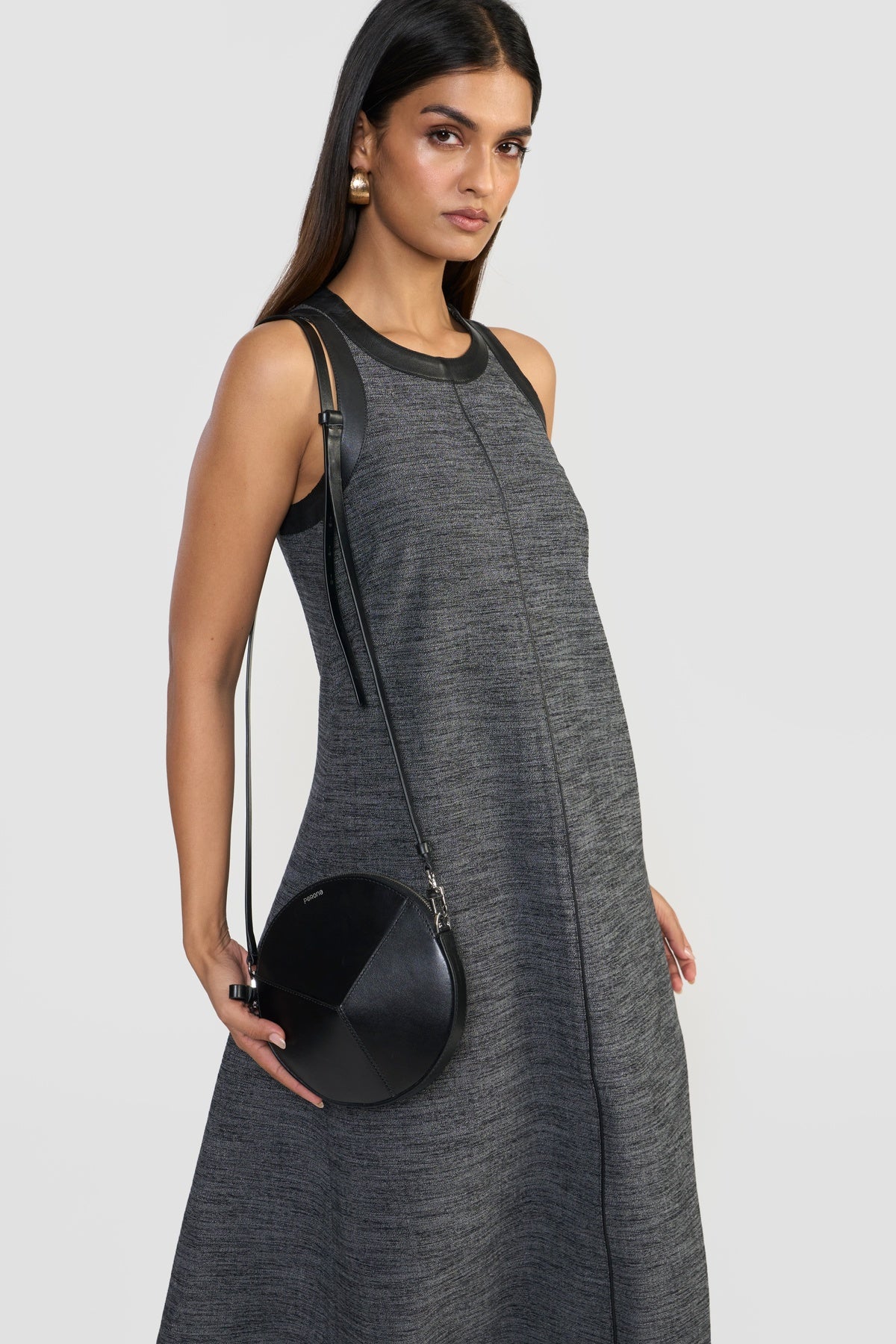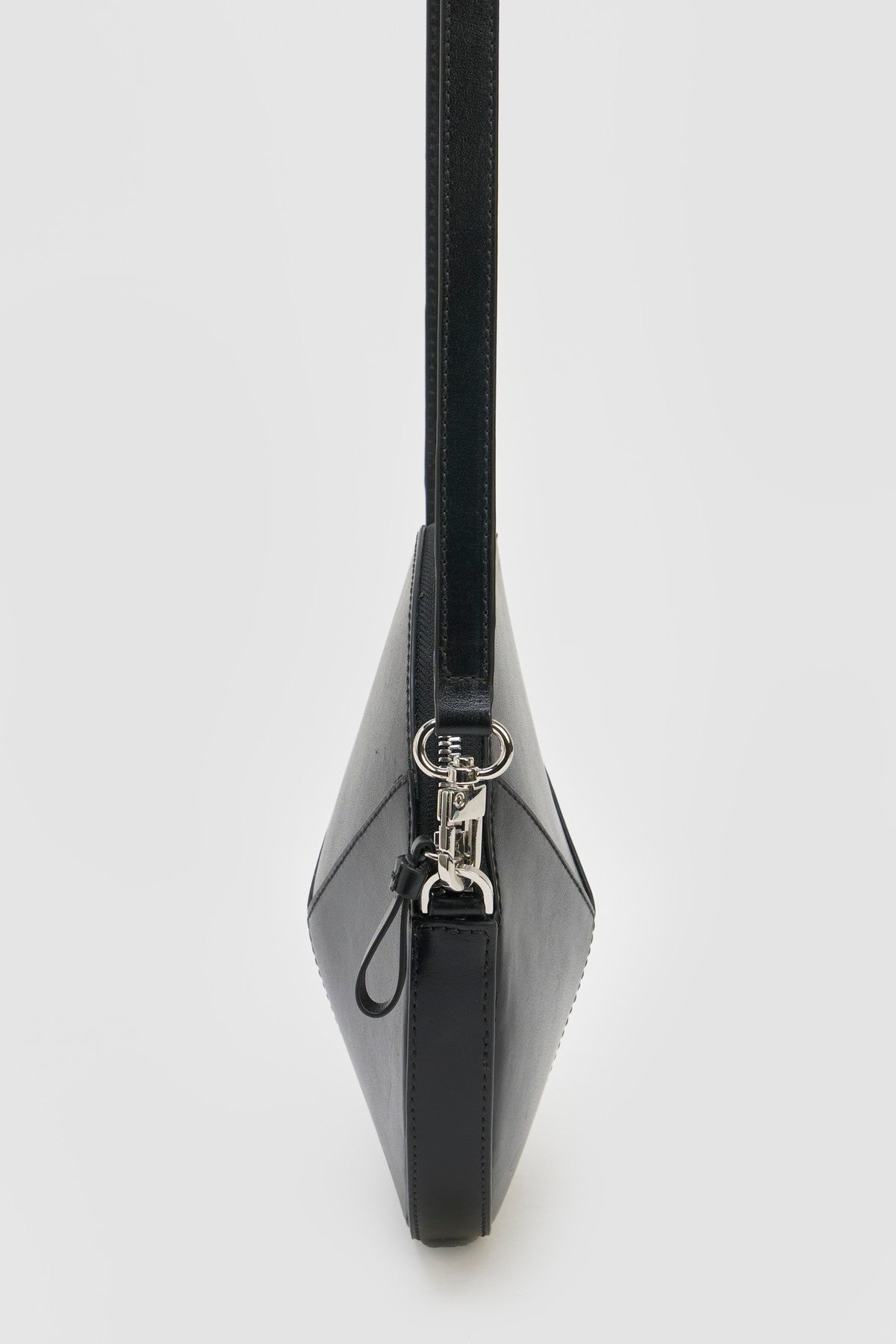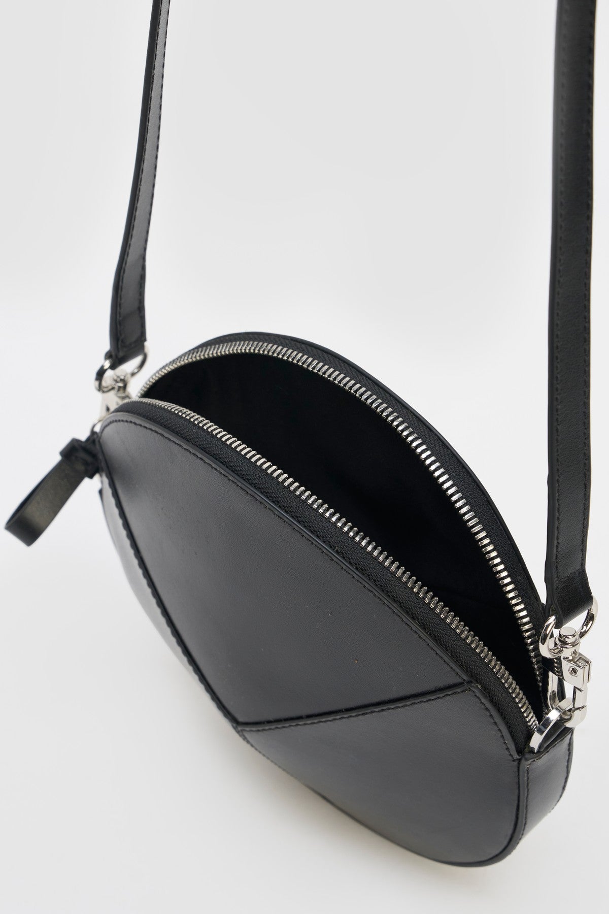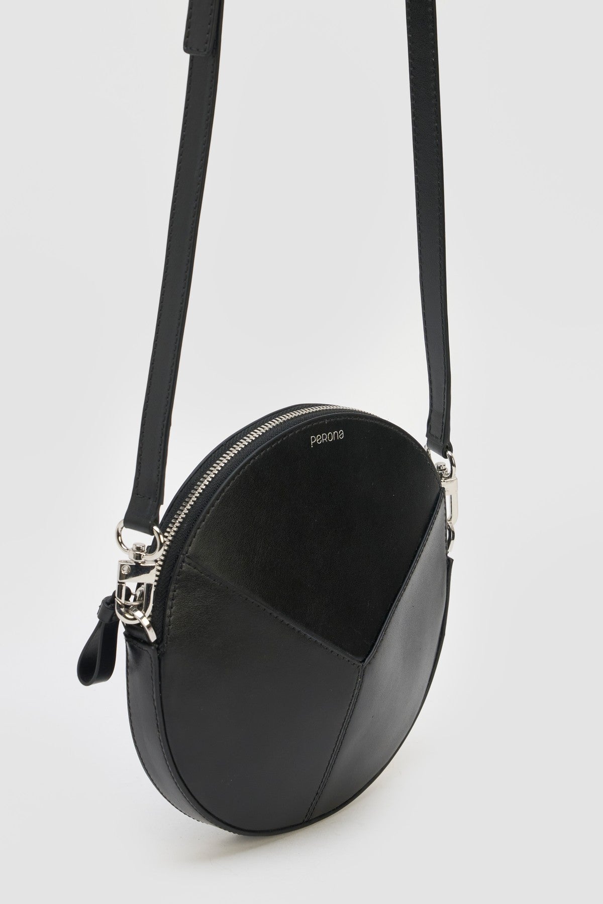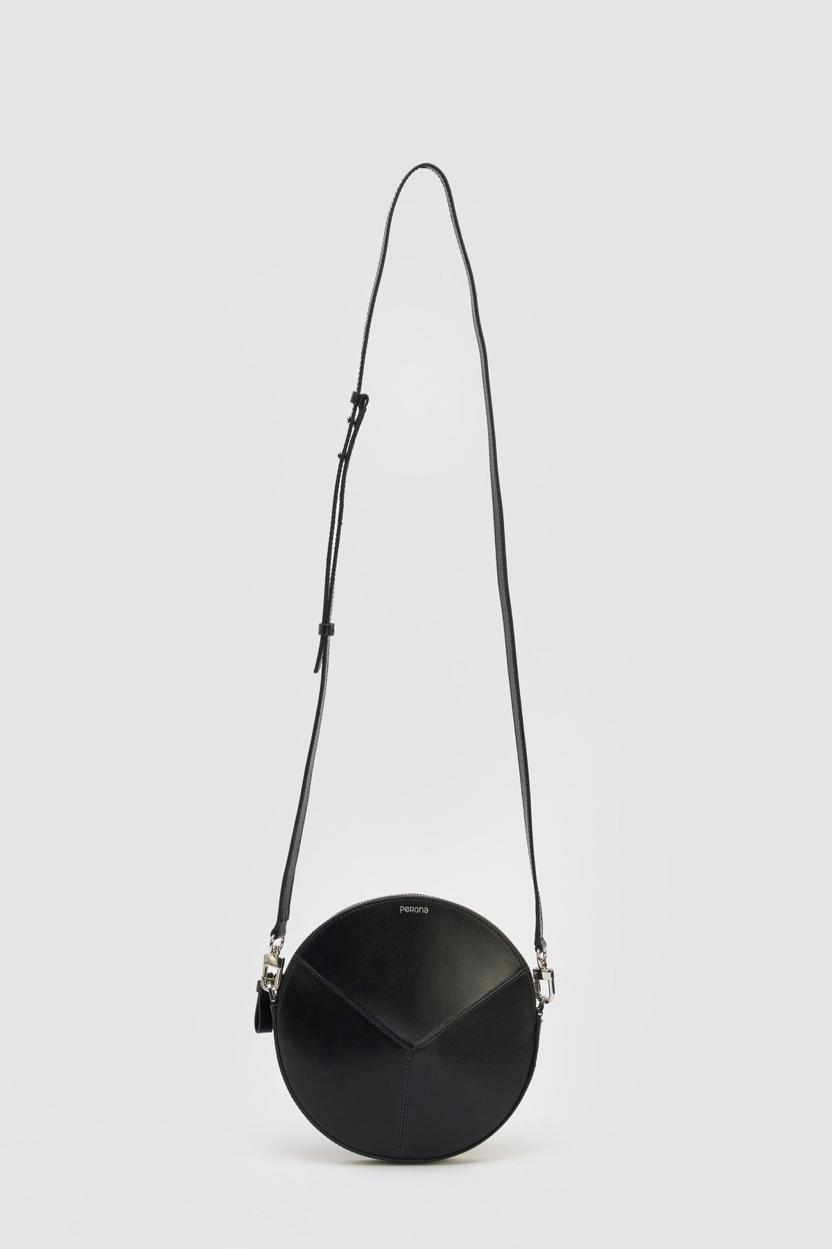 Perona’s design reveals itself through a precise circular silhouette, accentuated by sharp, angular paneling that extends into a defined geometric contour. This interplay between curve and line gives the bag its sculptural presence — soft in silhouette yet architectural in detail.Geometry refined into elegance, it finds harmony between roundness and structure. Finished with a sleek zip-top closure and silver-tone hardware, it balances secure functionality with understated elegance. The adjustable strap offers versatile, hands-free wear, while the compact interior is thoughtfully sized for essentials.