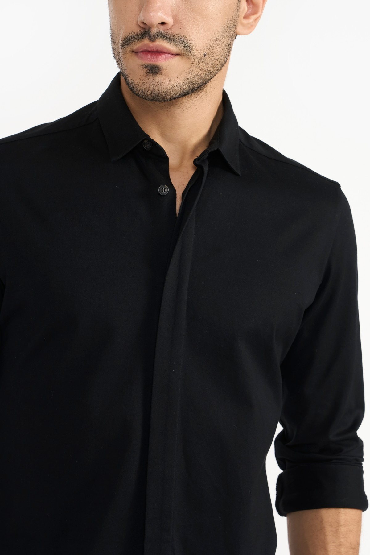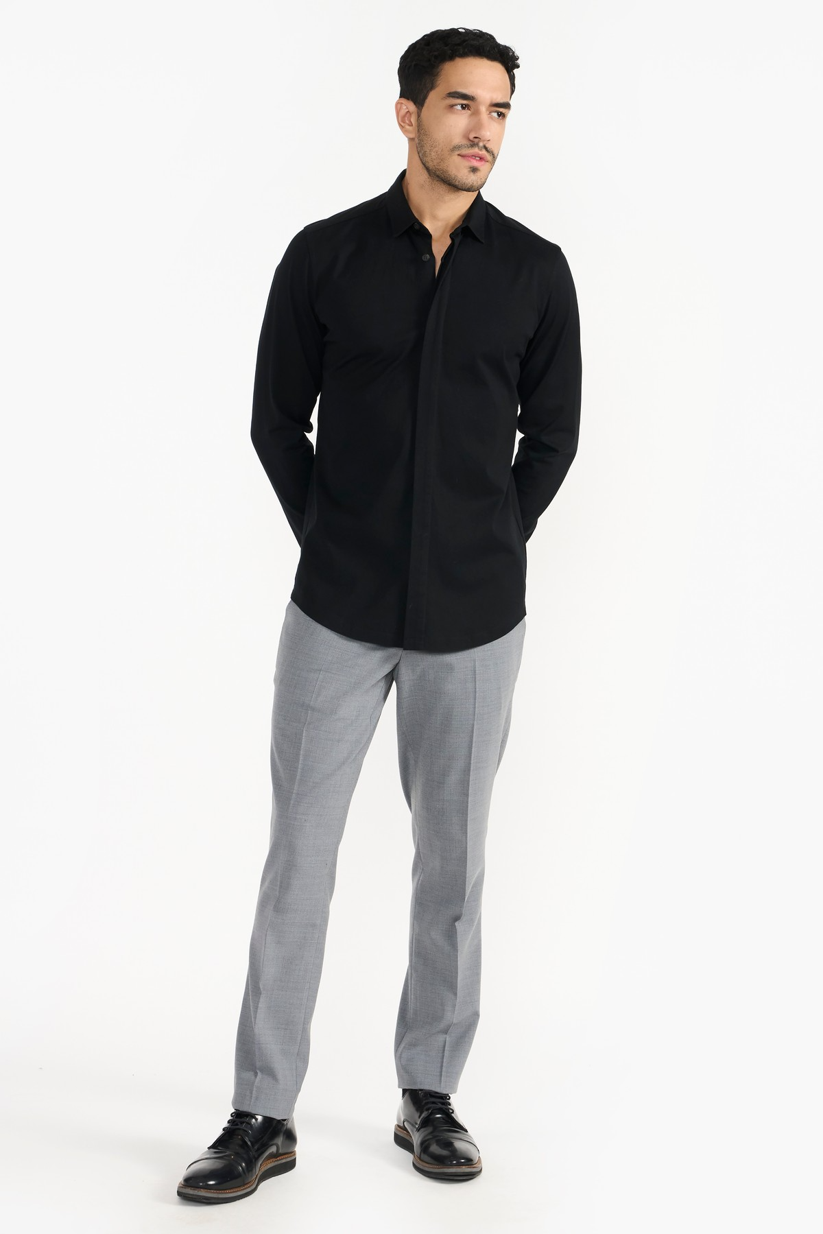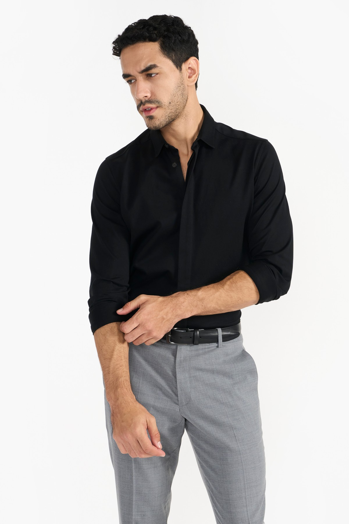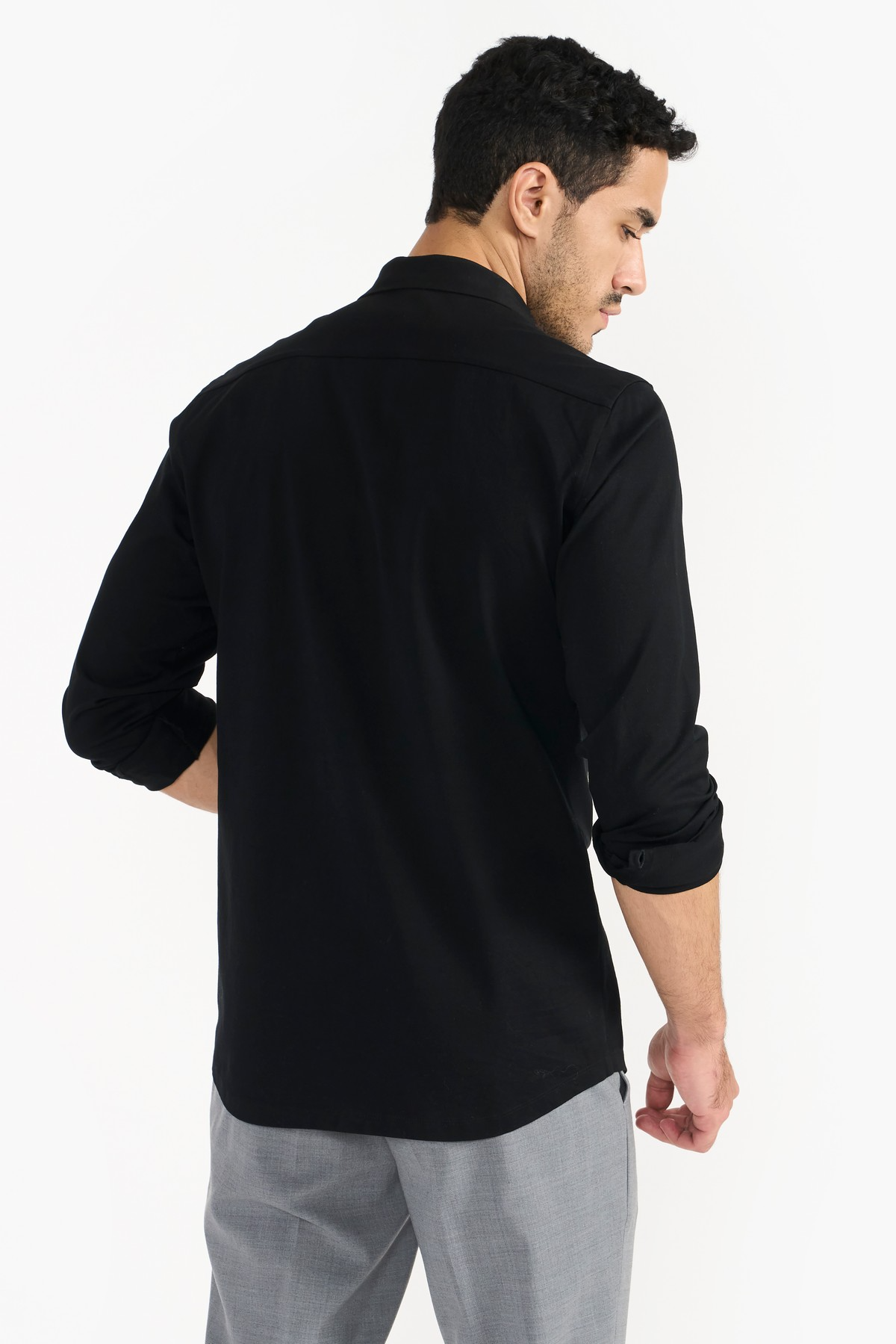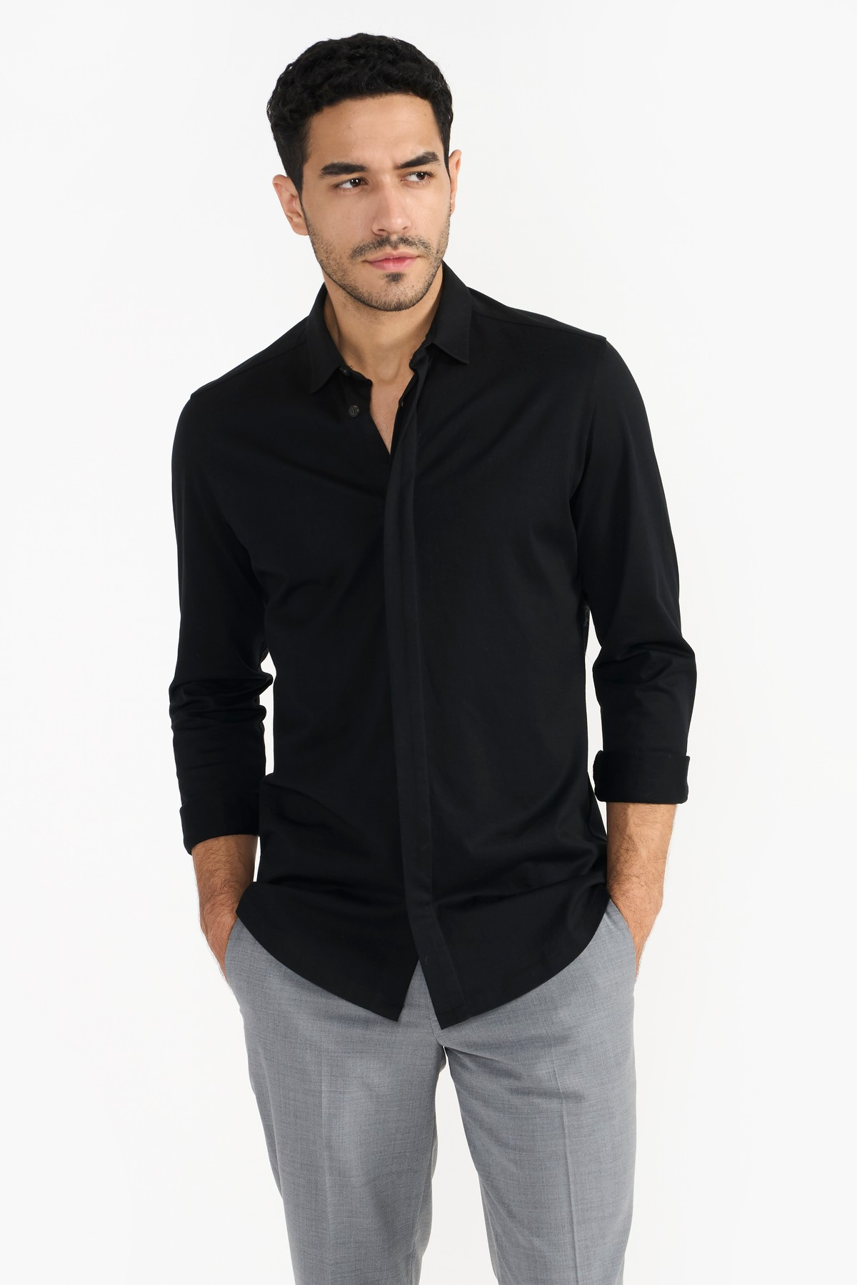 Rendered in sophisticated fine Italian light weight organic cotton fabric. Regular fit, concealed placket and gun metal finish snap-stud fastenings add defining details. An iconic wardrobe essential.