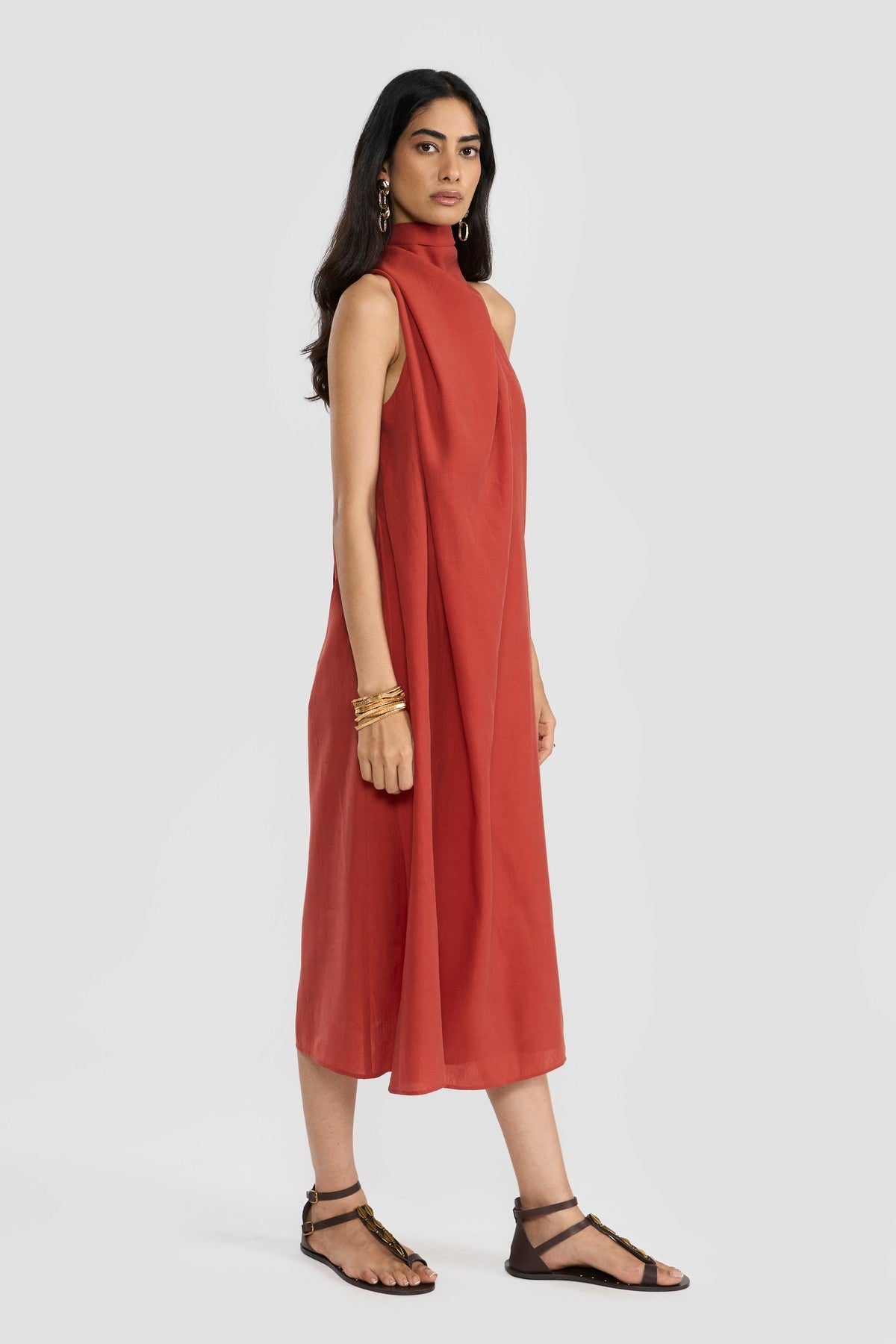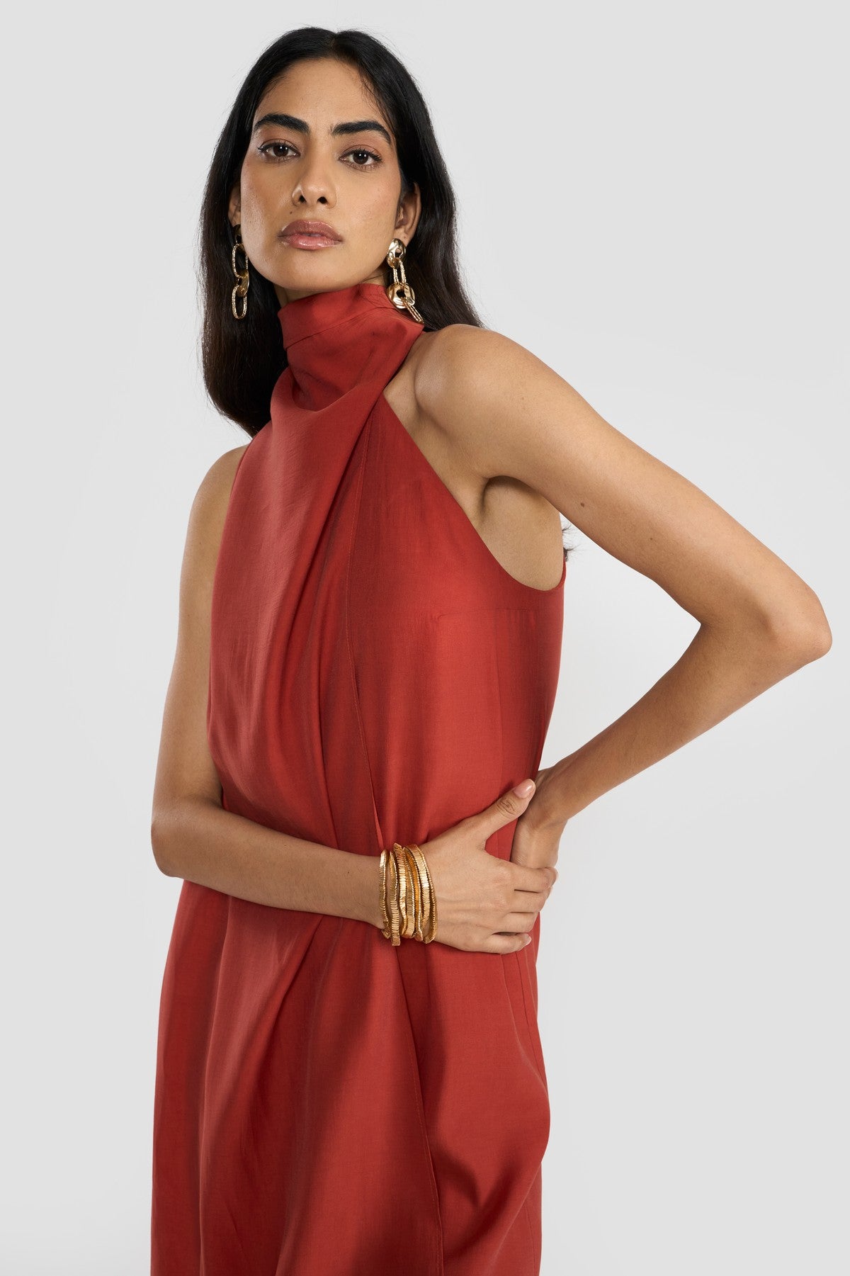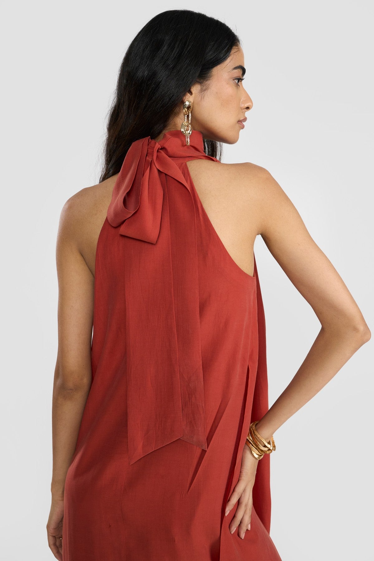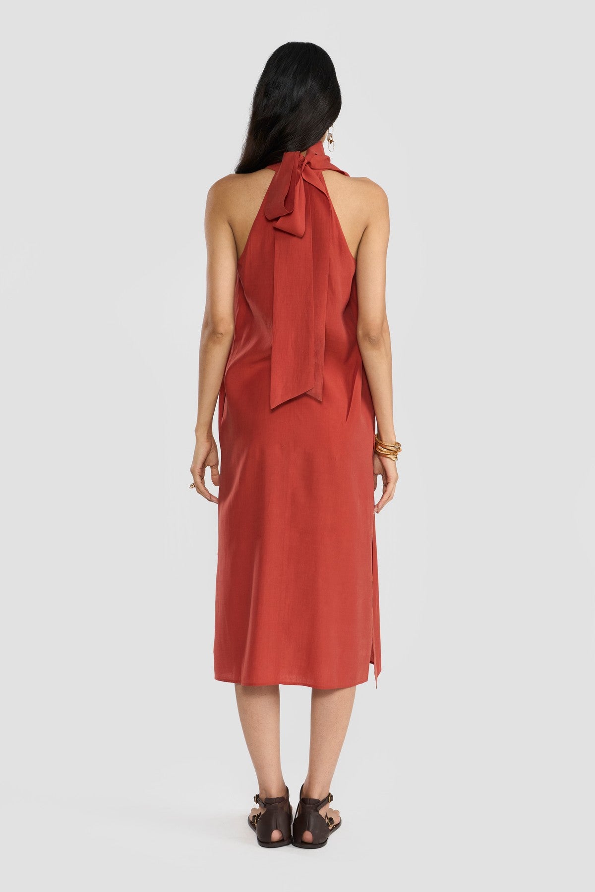 Designed for warm-weather sophistication, this rust-colored dress is crafted from soft, breathable lyocell, known for its silky texture and sustainable origin. The fluid drape of the fabric enhances the elegance of its halter neckline, creating a flattering, elongated silhouette. A double front layer adds depth and dimension to the design, secured delicately with a tie for a touch of understated femininity. The rich rust hue brings warmth and character, making it a standout piece for both day and evening occasions. Lightweight, comfortable, and consciously made, this dress offers modern elegance with a mindful edge.