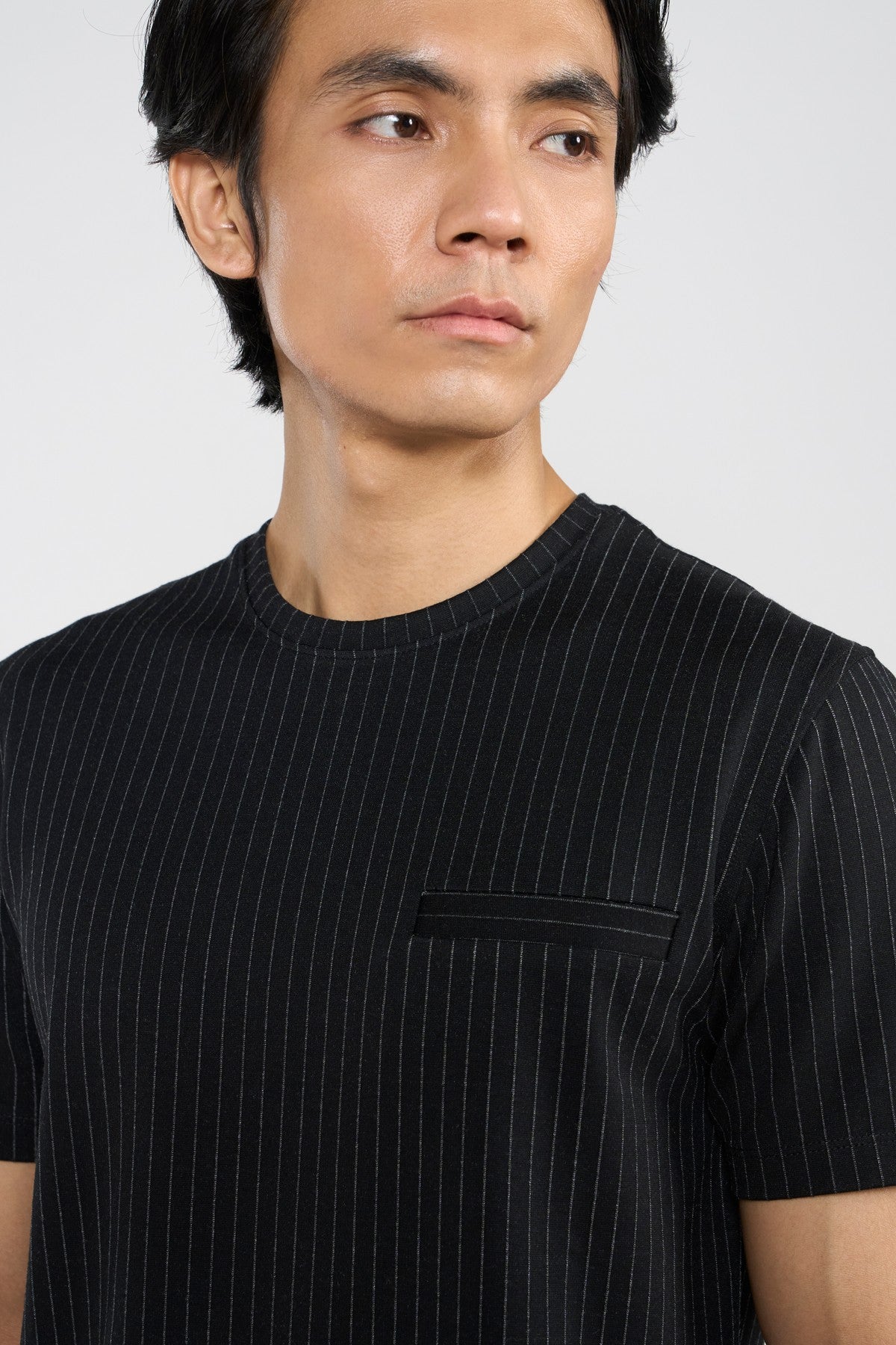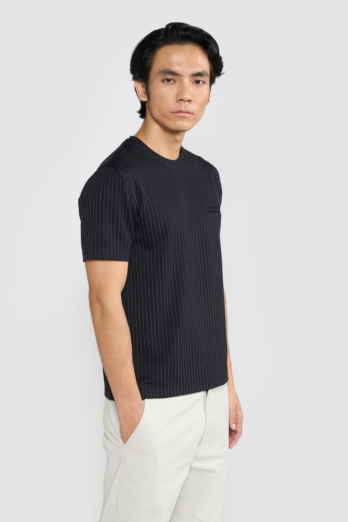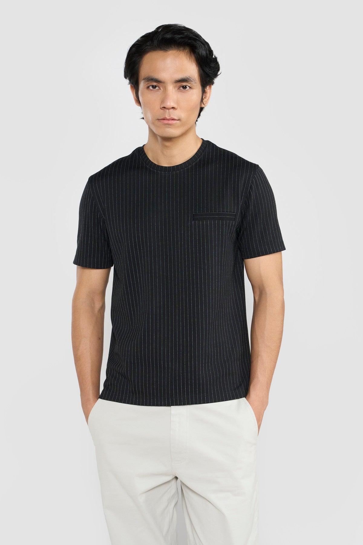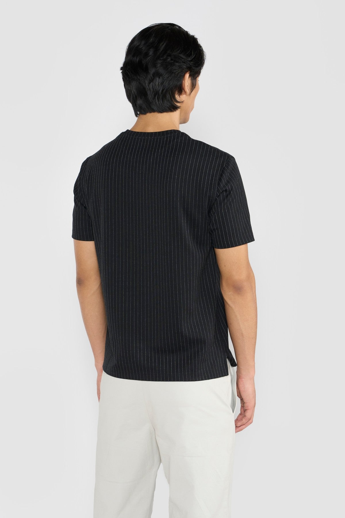 Crafted from a premium Italian viscose-blend jersey with added stretch, this short-sleeved t-shirt offers a smooth, lightweight feel against the skin. The black and white macro-striped pattern features thin black stripes spaced generously for a bold, modern look. Finished with a classic round neckline and a relaxed silhouette, it’s an easy, versatile layer designed for year-round wear.Relaxed fit