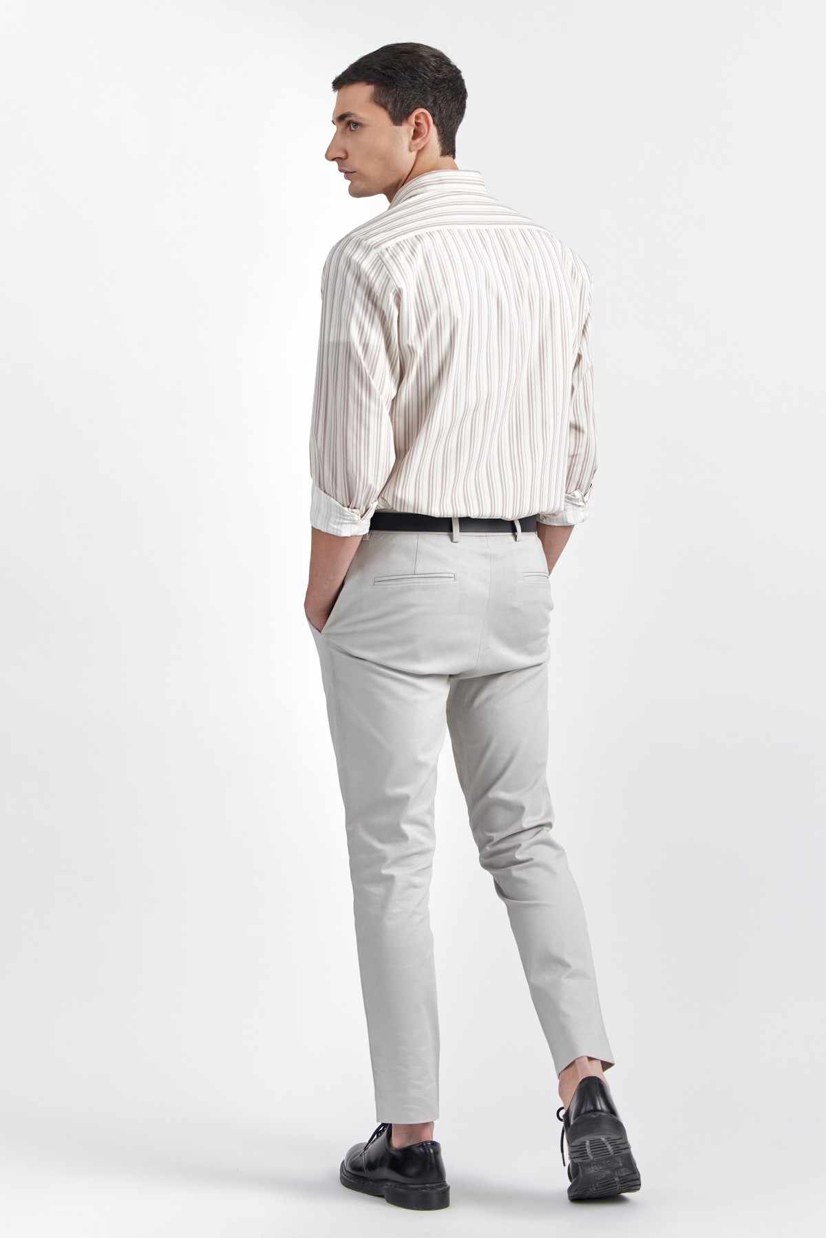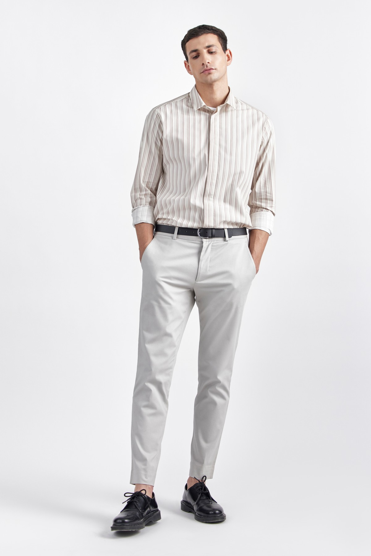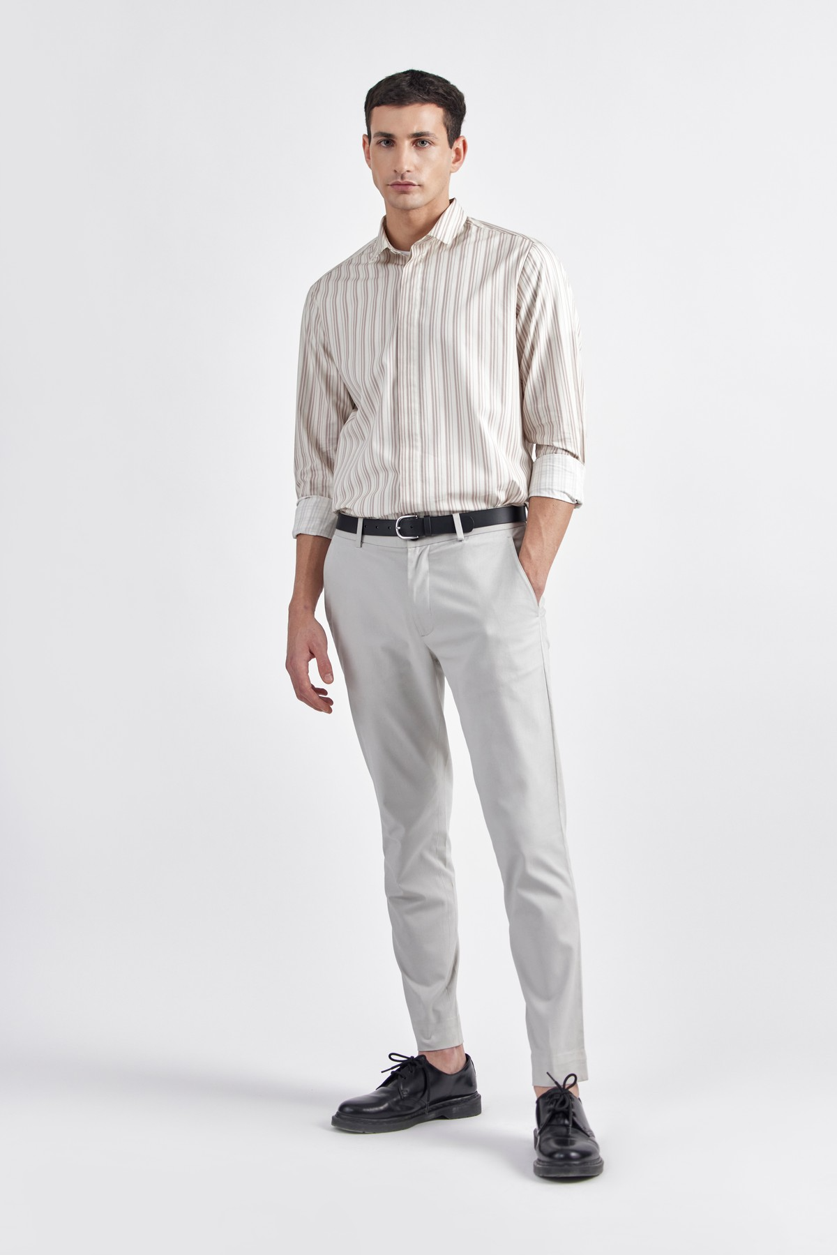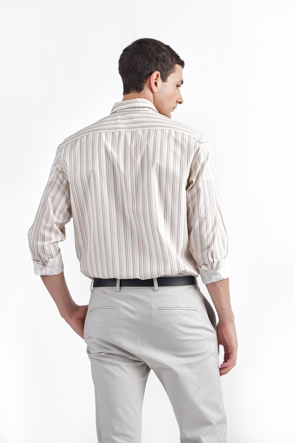 Crafted in premium Italian striped print cotton, exclusively printed in Italy with innate performance properties ensuring proper thermo regulation and maximum comfort. Cut with extra room for movement, pointed shirt collar, full sleeves and button closure. NAME is an elevated essential accentuated with tonal buttons, concealed placket and relaxed fit.