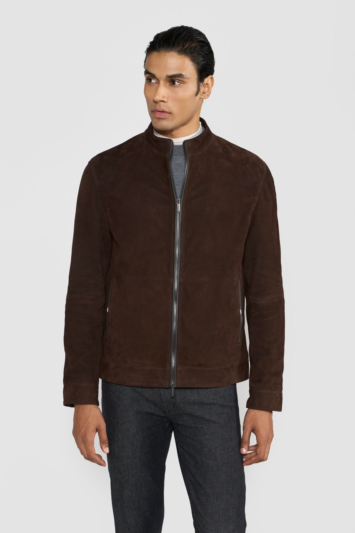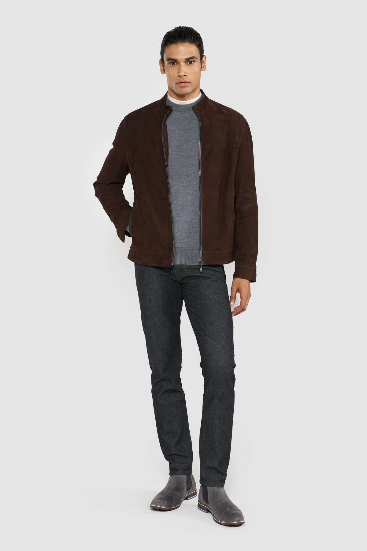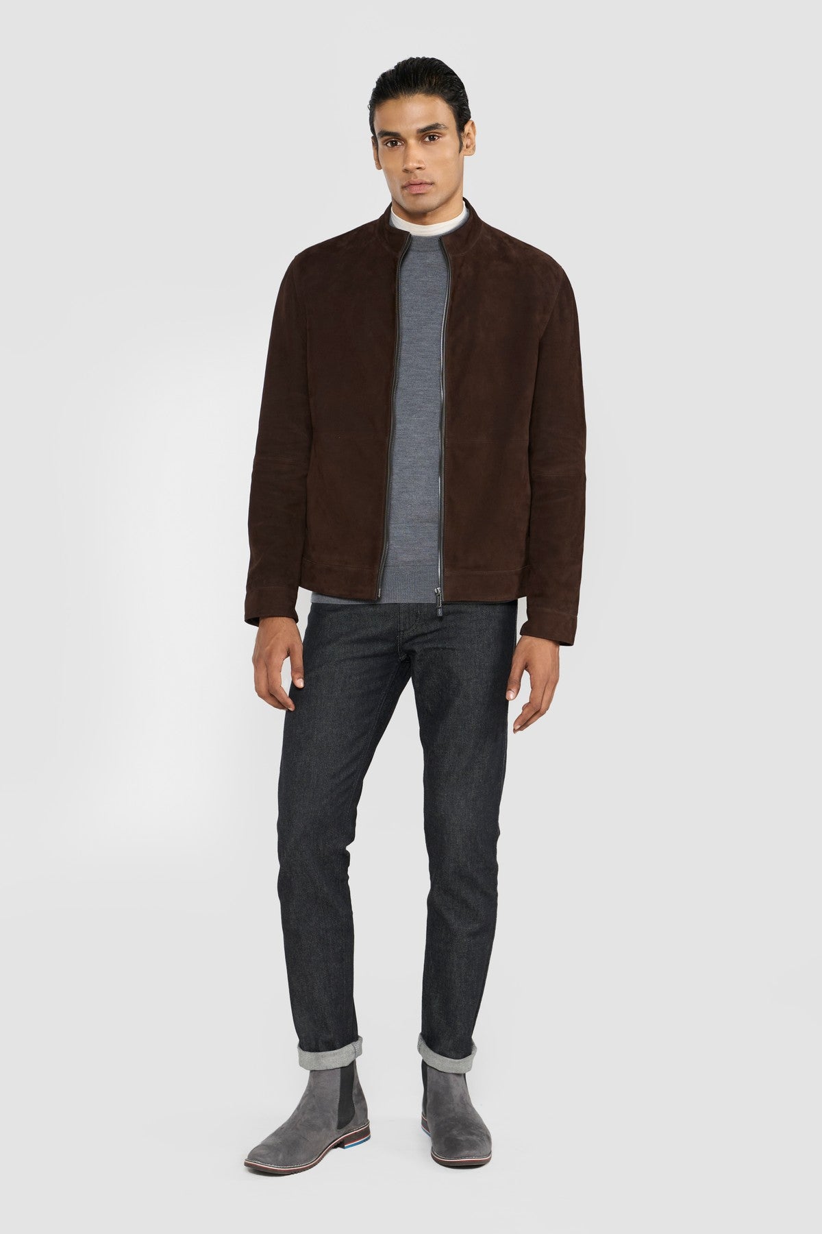 This stand collar jacket is designed with two functional bone pockets and button down cuff opening. Sleek design and relaxed fit through the body with plenty of room for underlayers. Accentuated with tonal lamb nappa trims. Crafted from LWG certified premium nappa leather. A stylish yet practical addition to your winter outfits.