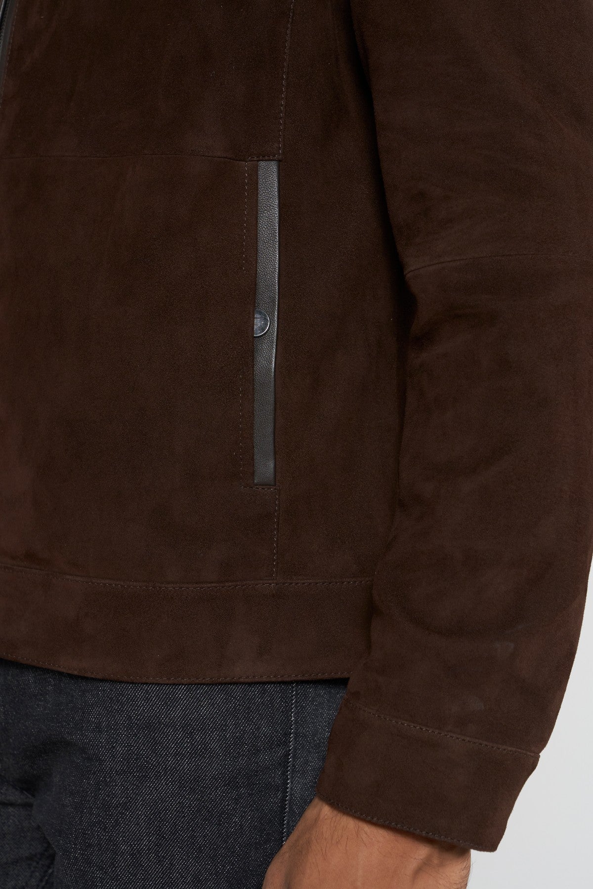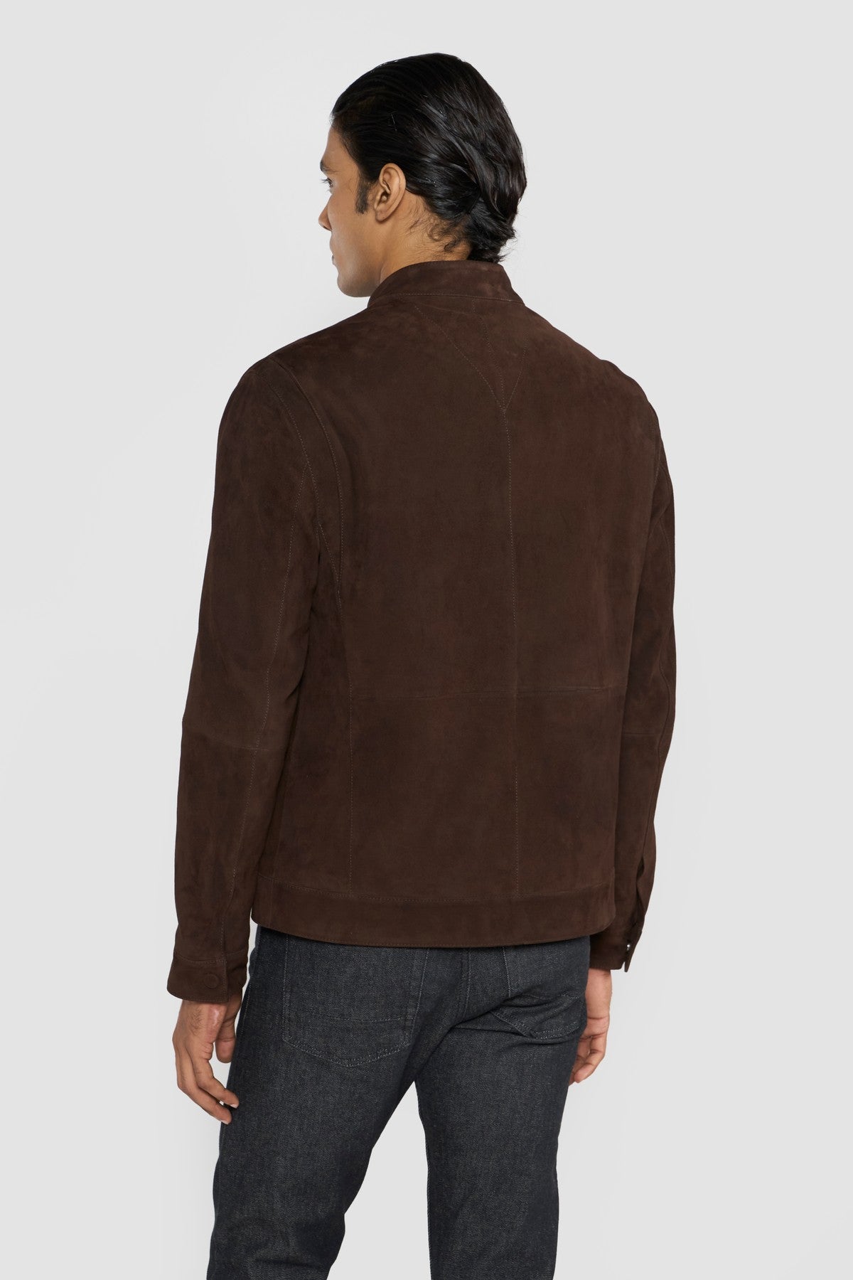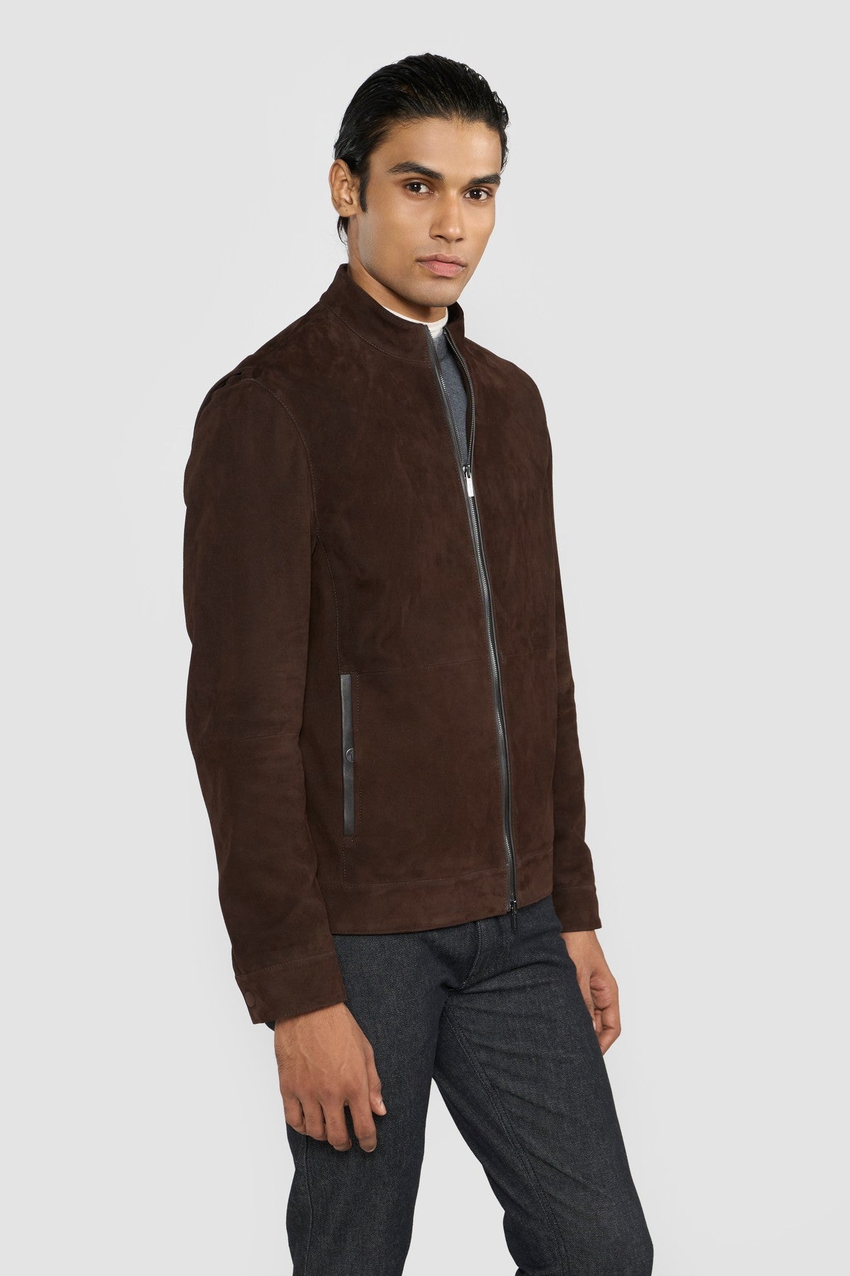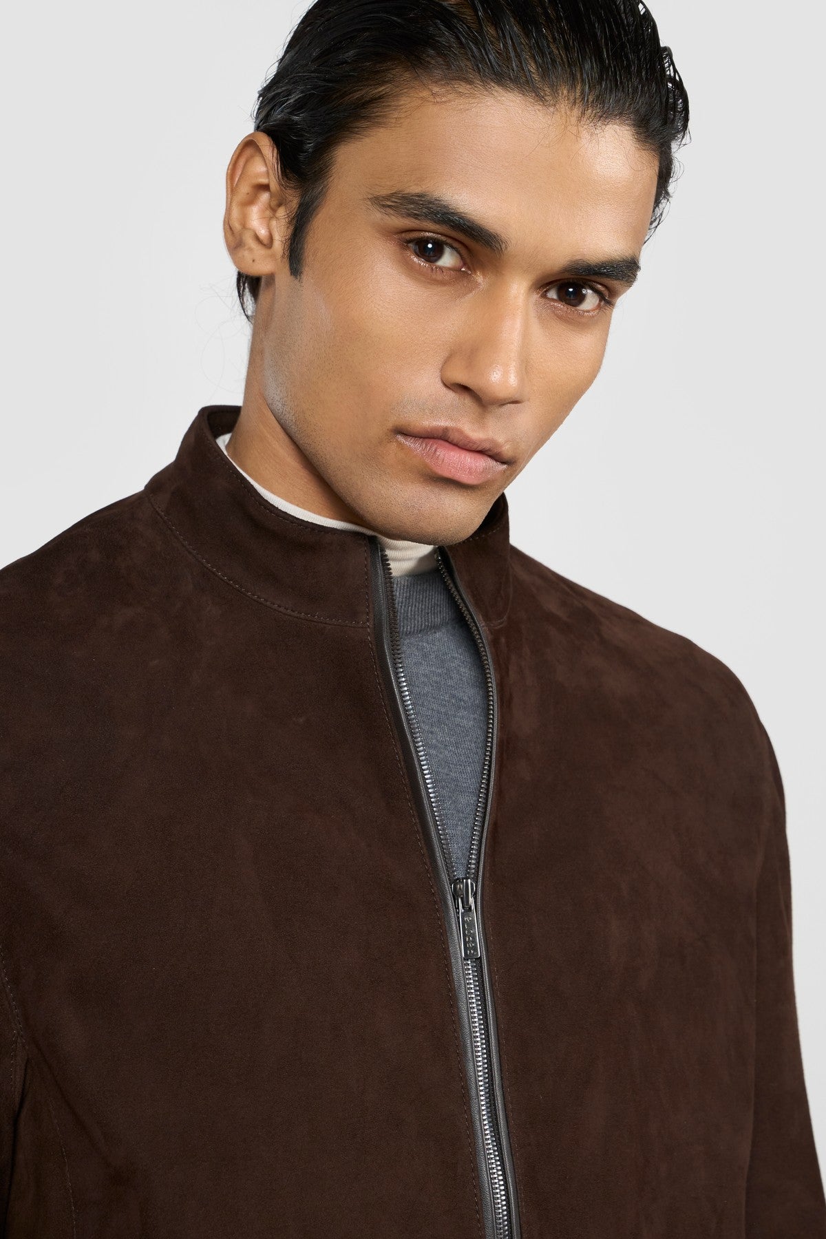 This stand collar jacket is designed with two functional bone pockets and button down cuff opening. Sleek design and relaxed fit through the body with plenty of room for underlayers. Accentuated with tonal lamb nappa trims. Crafted from LWG certified premium nappa leather. A stylish yet practical addition to your winter outfits.