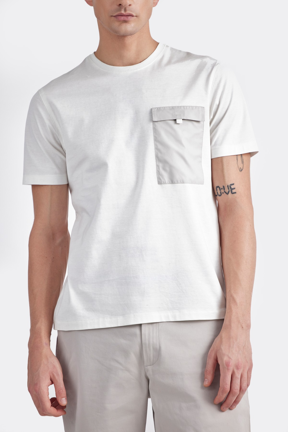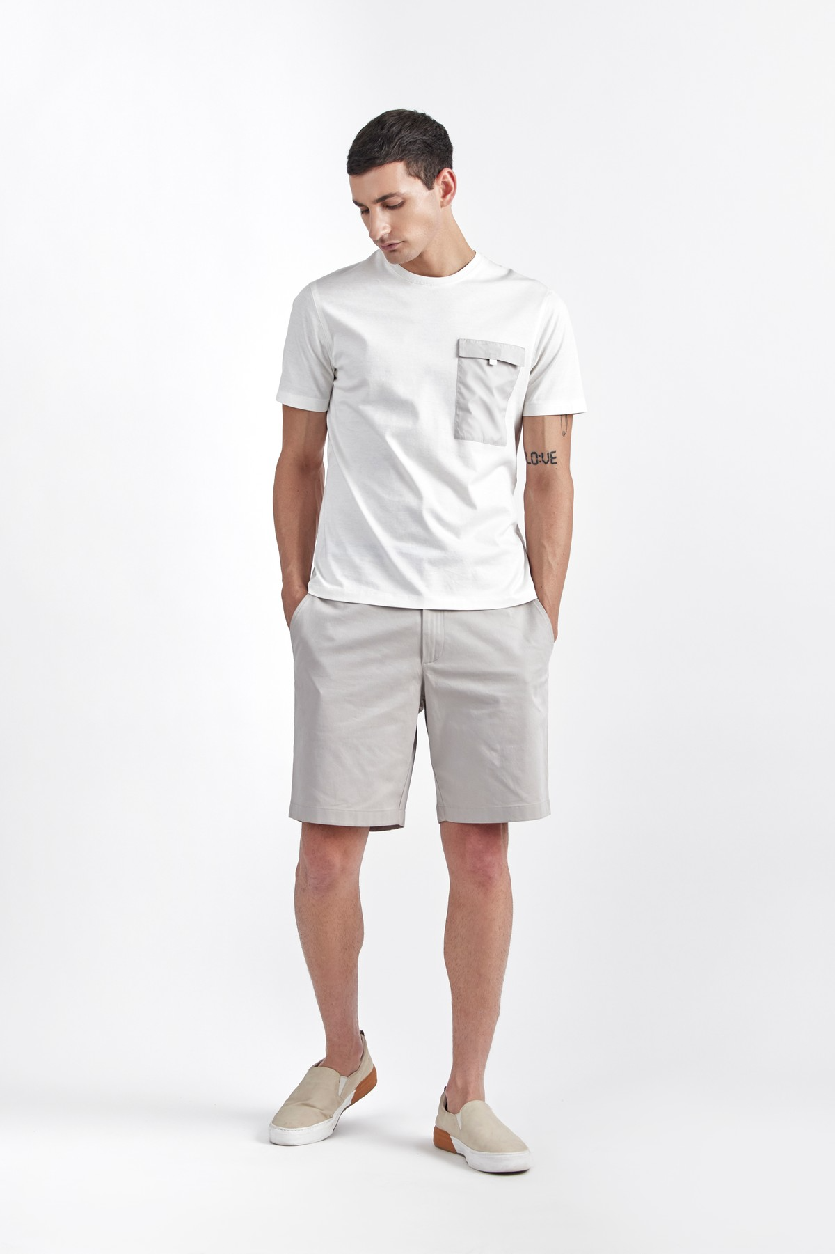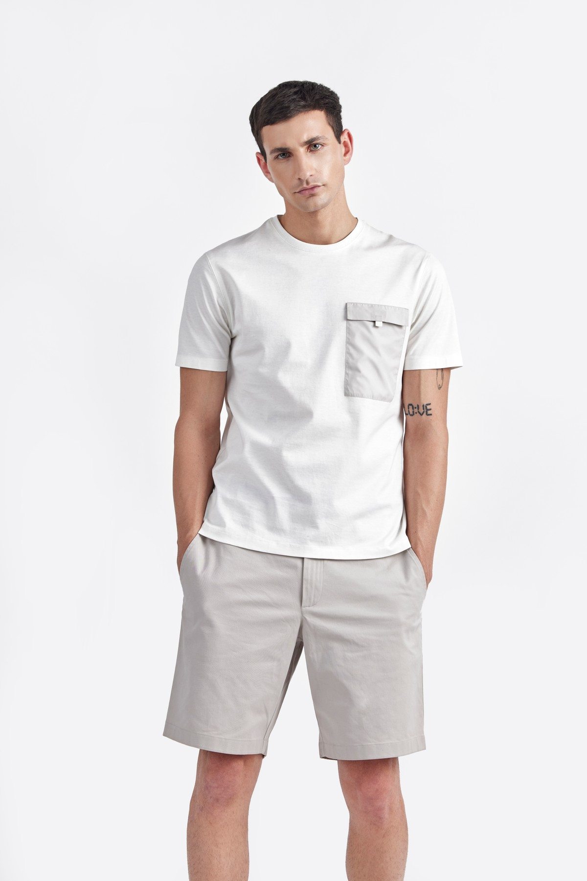 Crafted in combination with sustainably sourced premium Italian light weight cotton fabric and water proof technical fabric accent on the pocket, which renders an ultimate comfort. Enduring relaxed fit style featured with polo neck, chest pocket and short sleeves. An athleisure style with discrete minimal aesthetics.
