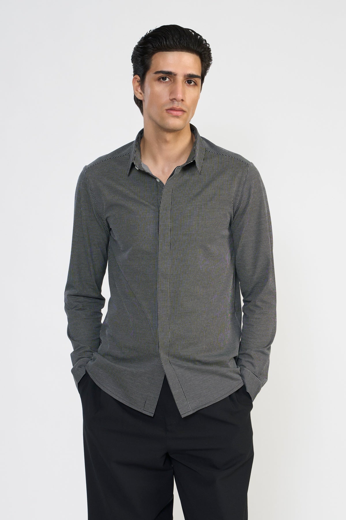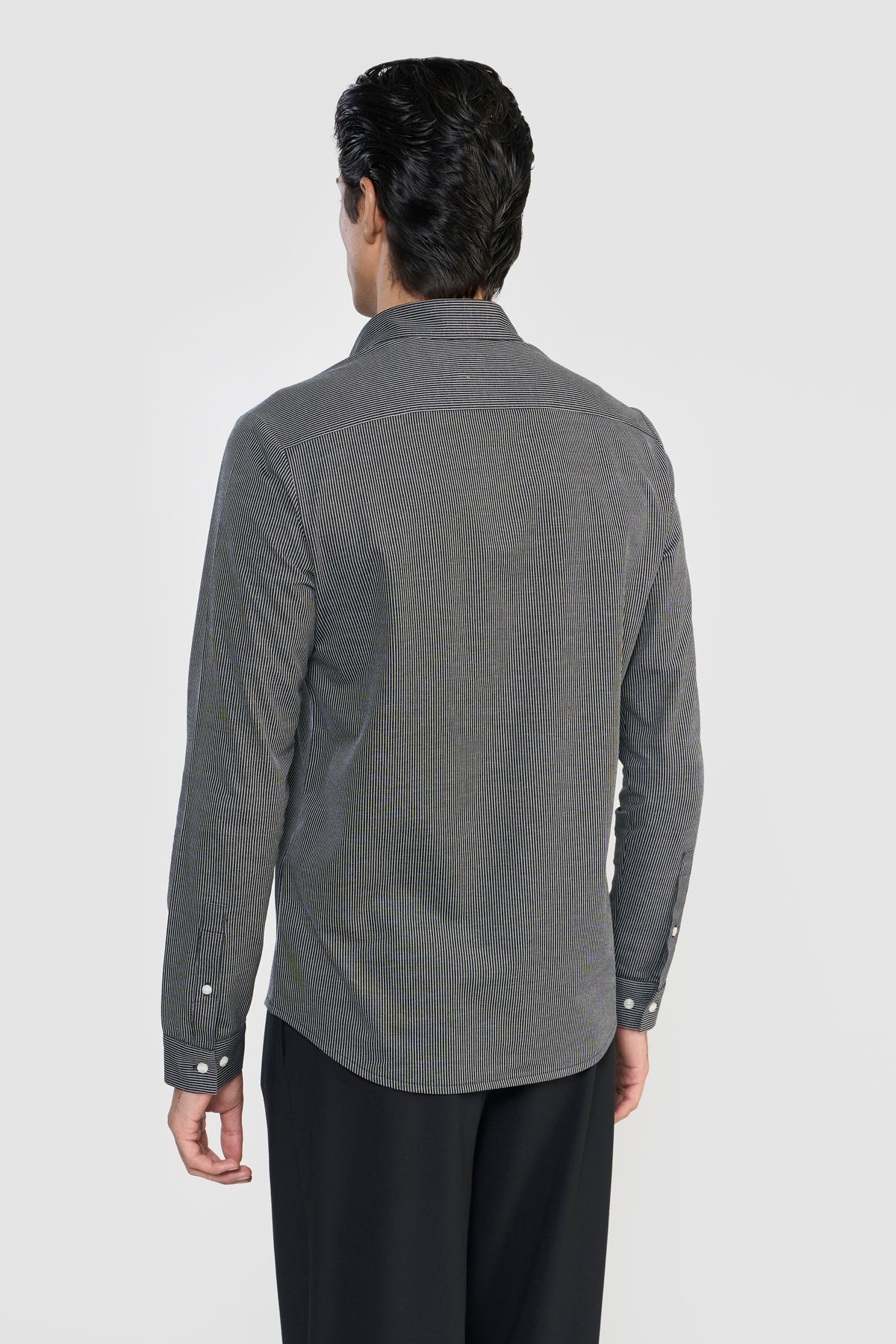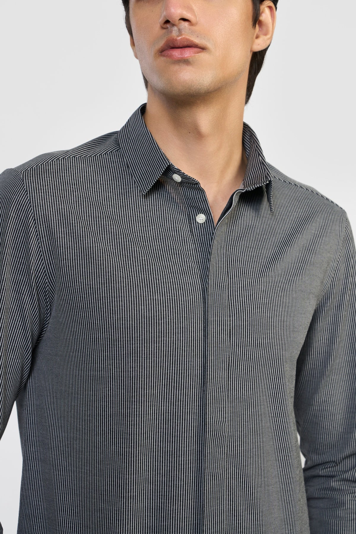 In warmer weather, the full-sleeve shirt with white stripe on black background in cotton polyester blend looks fresh and effortless. Features shirt collar, contrast button closure and full sleeves. Regular yet close fitting lines to the body through the chest and shoulder add contemporary edge to this iconic essential. This airy, inherently breathable fabric seamlessly bridges casual styles with timeless classics. The crisp natural material and elegant stripe pattern in shades of blue set the tone for the rest of your look. A spread collar tops off the full-sleeve shirt.
