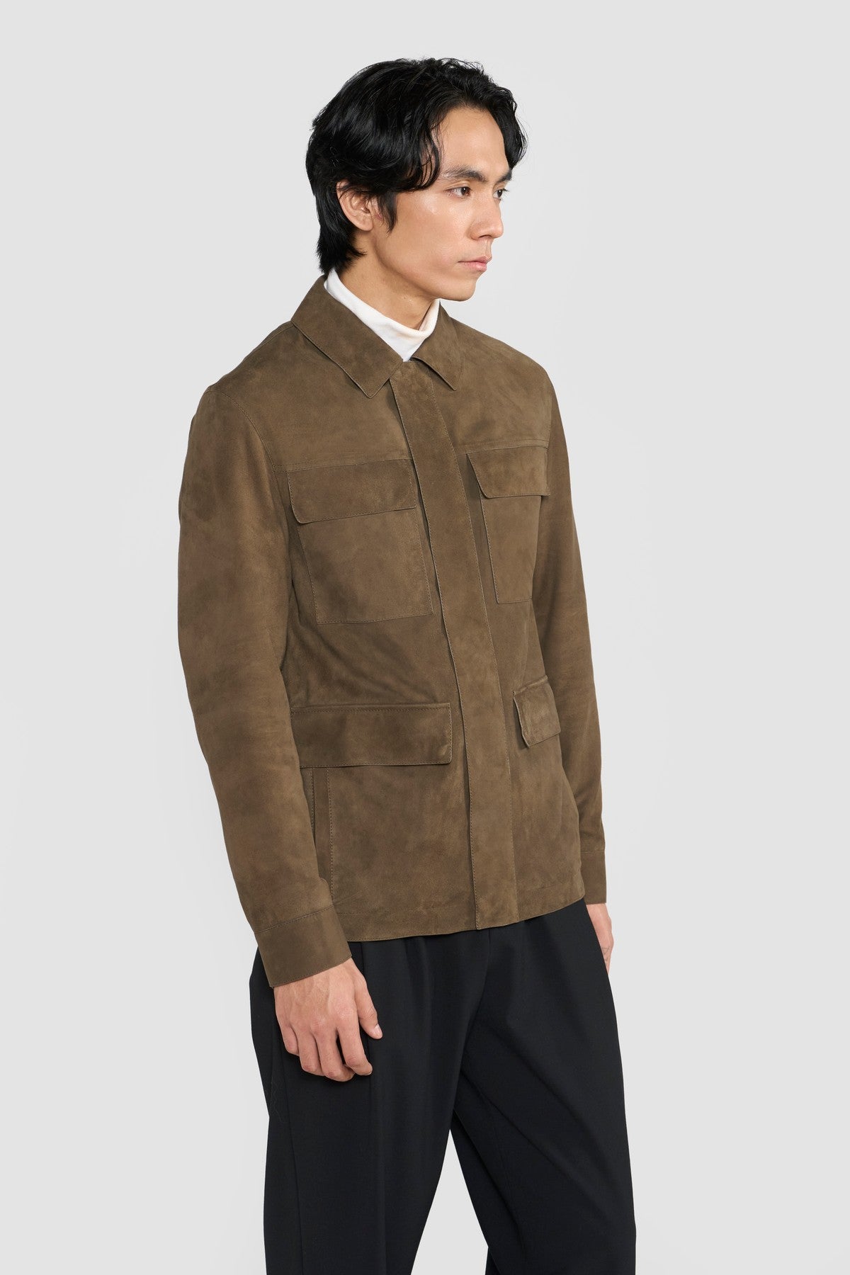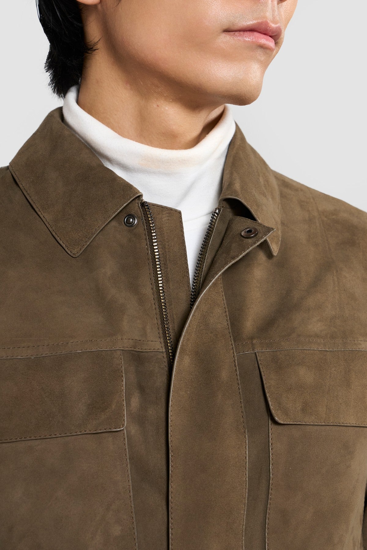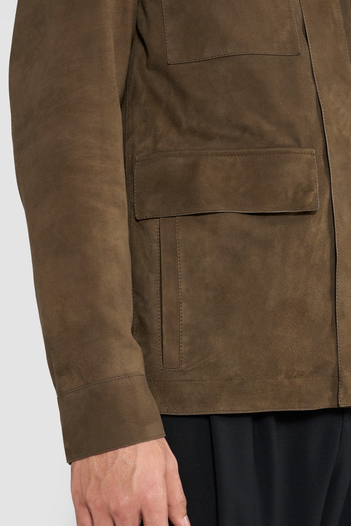 This field jacket is a luxurious yet sporty addition to your winter wardrobe. Features concealed front zipper opening secured with snap closure, six pockets, stand collar and adjustable cuff opening. Crafted from LWG certified soft and supple suede leather.
