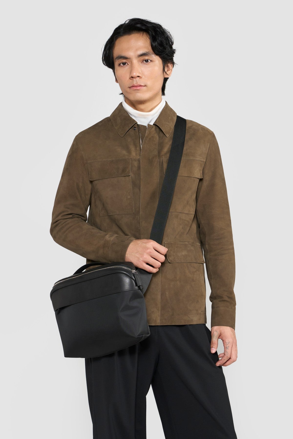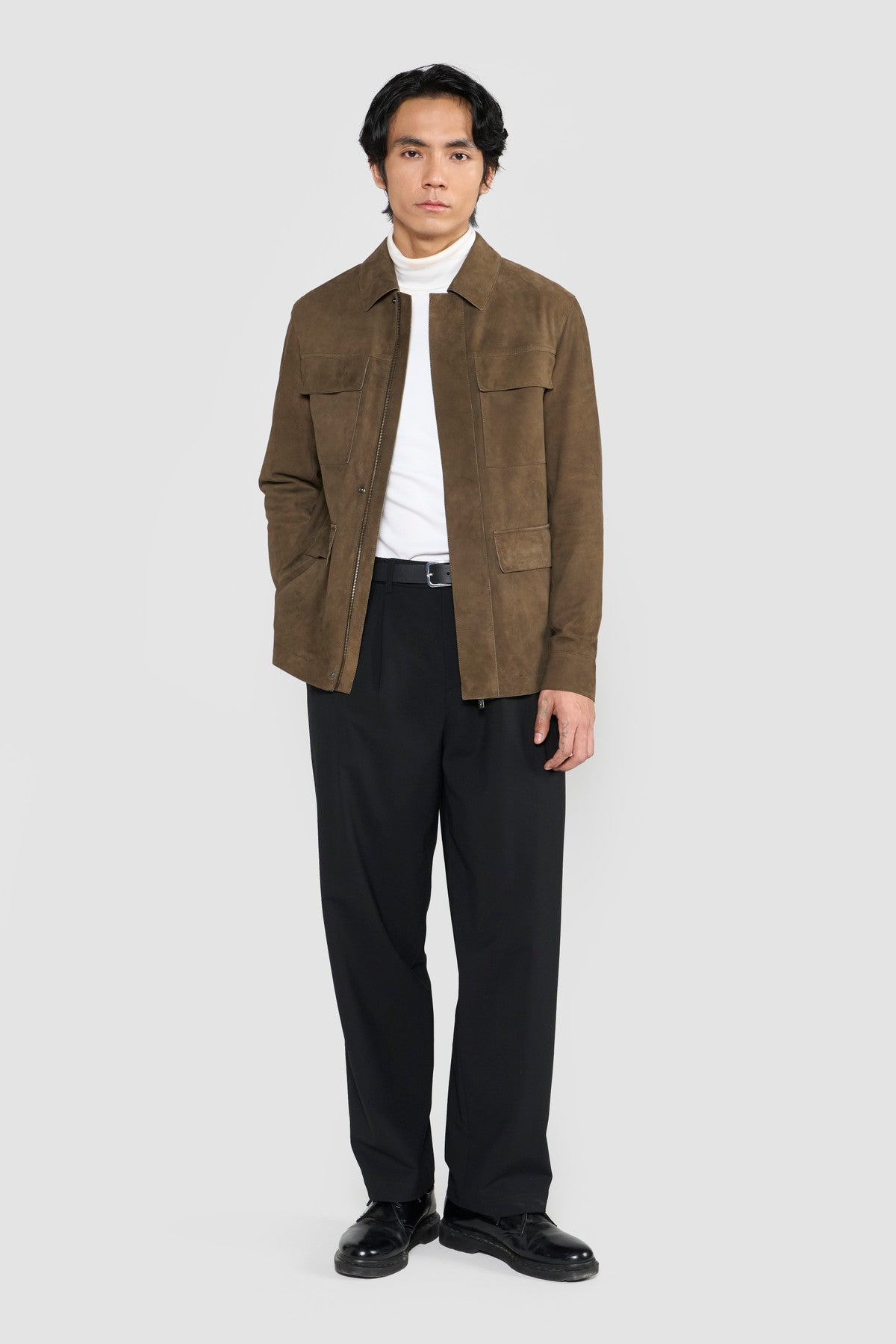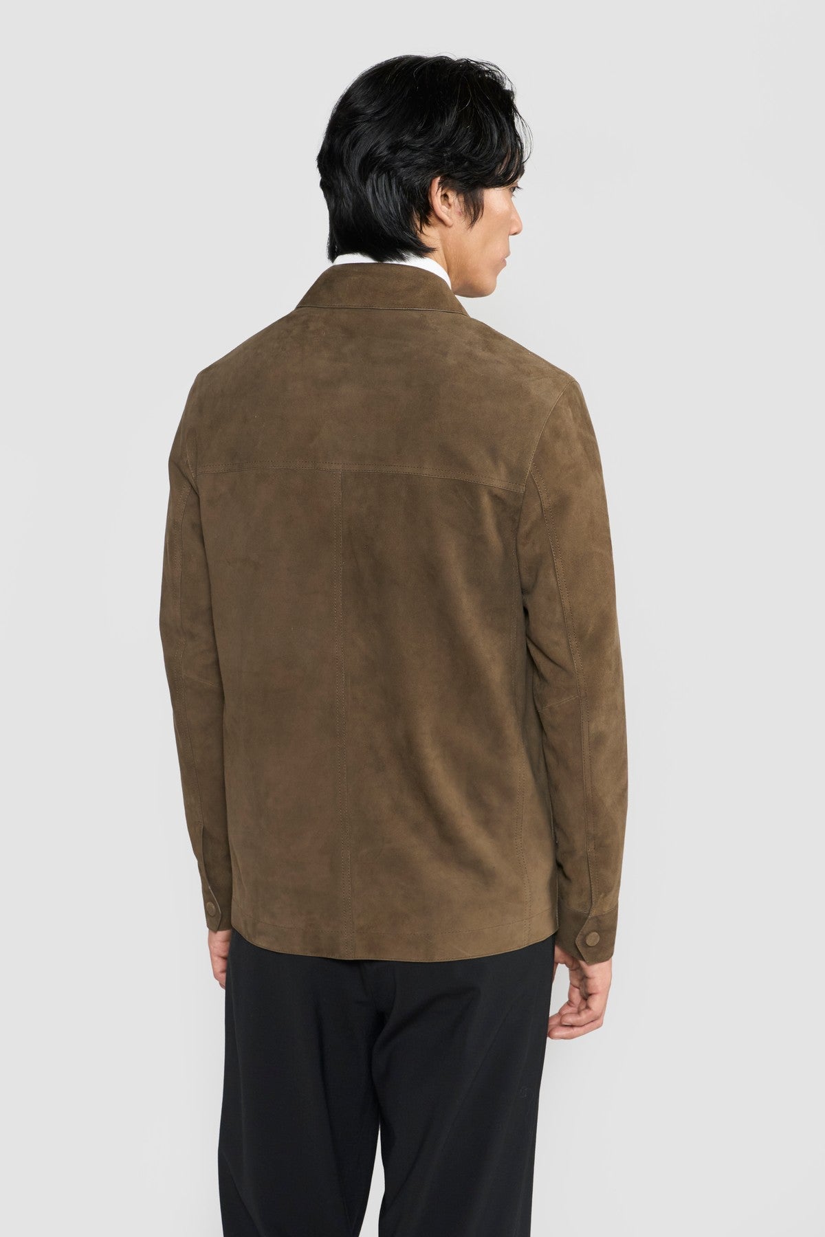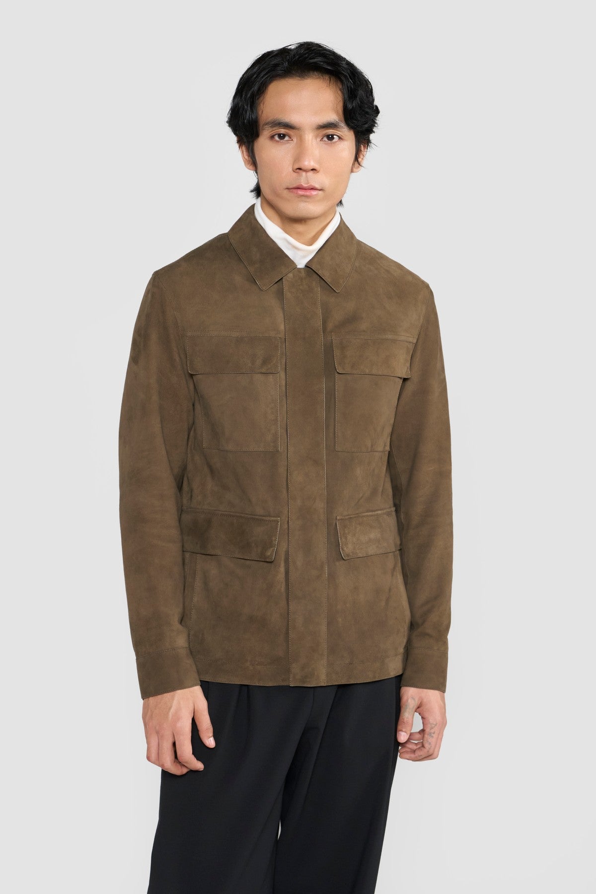 This field jacket is a luxurious yet sporty addition to your winter wardrobe. Features concealed front zipper opening secured with snap closure, six pockets, stand collar and adjustable cuff opening. Crafted from LWG certified soft and supple suede leather.