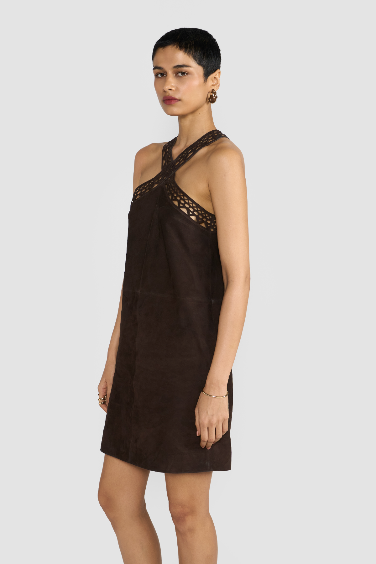 Elevate your style with Perona’s ETHEL suede leather dress, designed to make a bold yet elegant statement. Featuring a chic halter neckline, the dress is beautifully accentuated with cut-out detailing, adding a touch of sophistication and allure. The soft suede texture gives it a luxurious feel, while the relaxed silhouette enhances your natural shape.A back zipper closure ensures a seamless fit, making it both stylish and easy to wear. Perfect for evenings out, cocktail parties, or any special occasion, this dress blends modern edge with timeless charm.