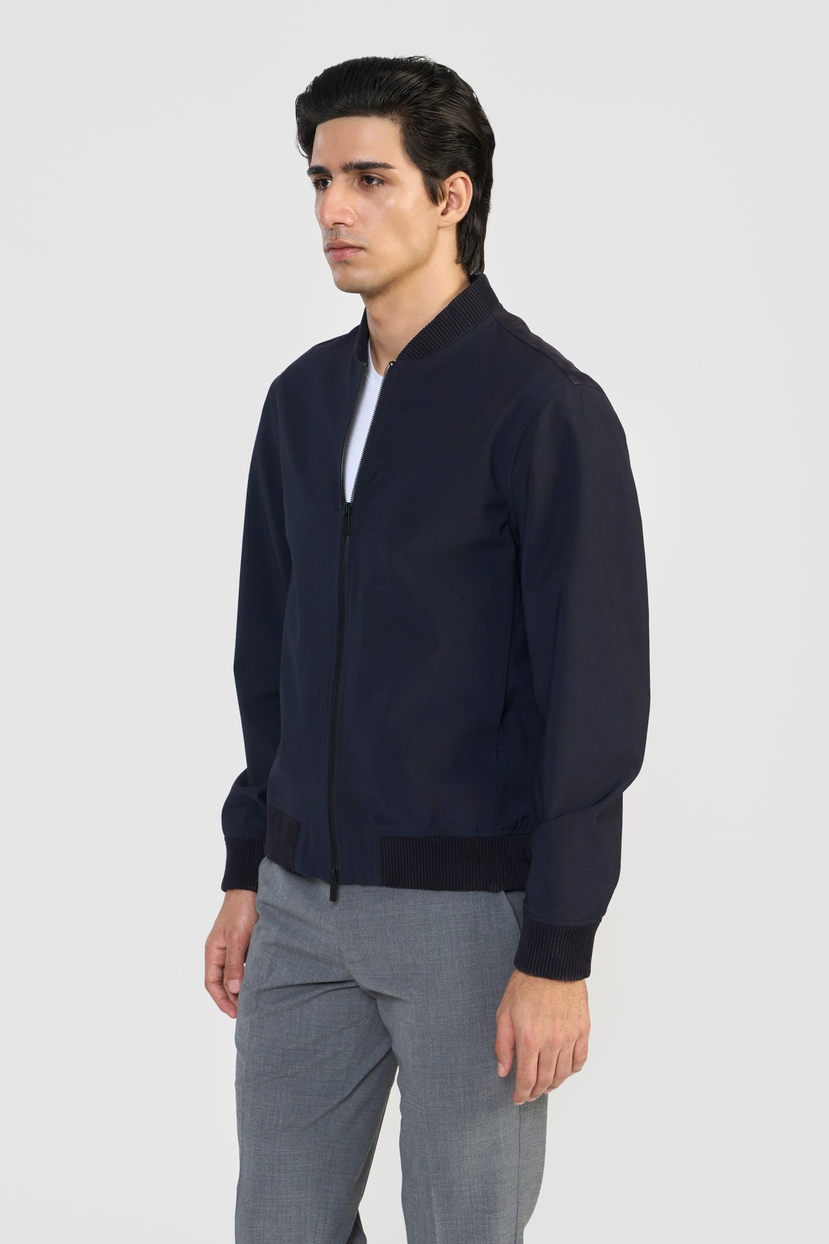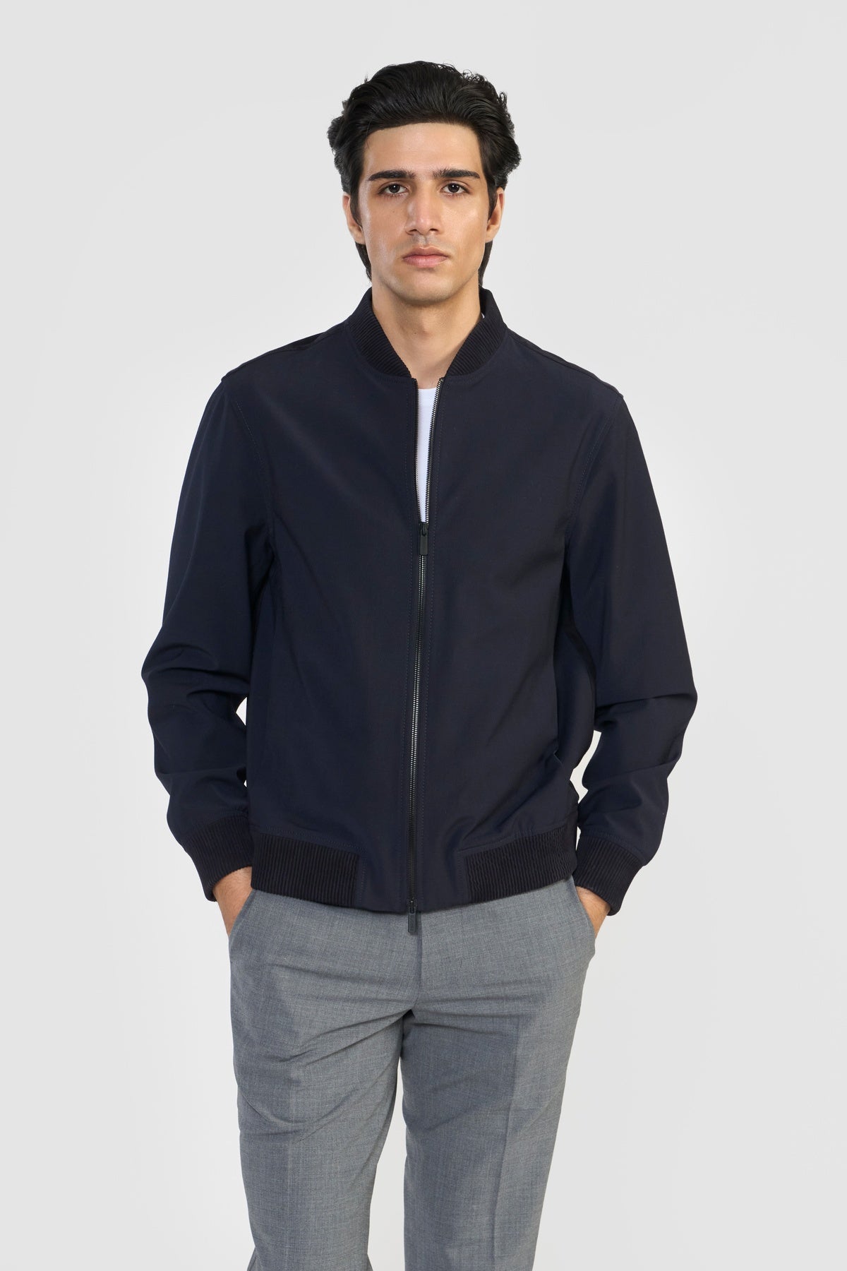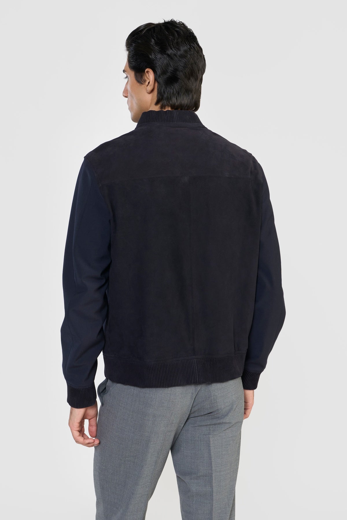 Statement bomber jacket, FLETCHER, in ultra-soft LWG certified premium suede leather and Italian PFC water repellent technical fabric with sleek, contemporary lines. The easy front zipper closure, side functional bone pockets, leather ribbed cuff, collar and bottom hem elevates its effortless design and minimal accent. Each piece embodies our dedication to craftsmanship and textile innovation. Designed for modern living, these styles provide warmth without weight, making them perfect for layering. They bring subtle texture and refined structure to contemporary wardrobes—seamlessly suited for business, travel, and everyday wear.