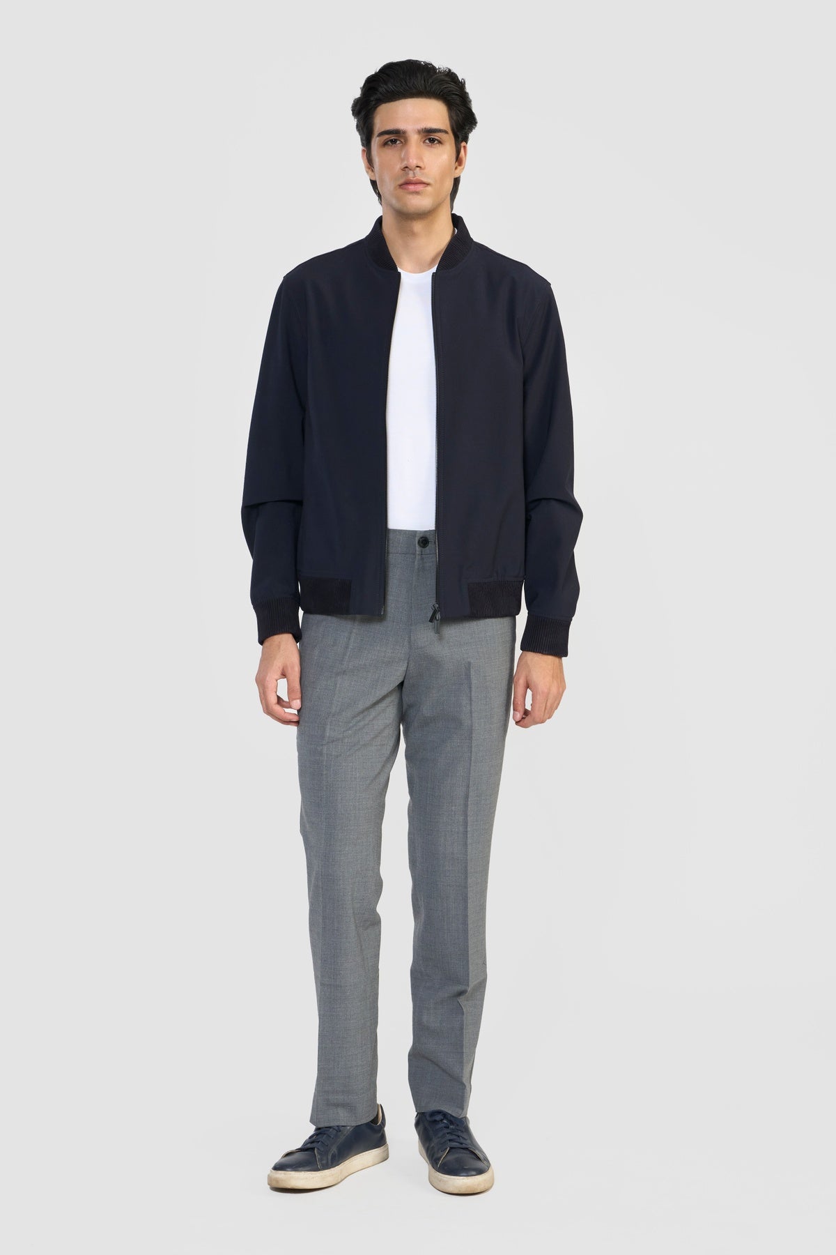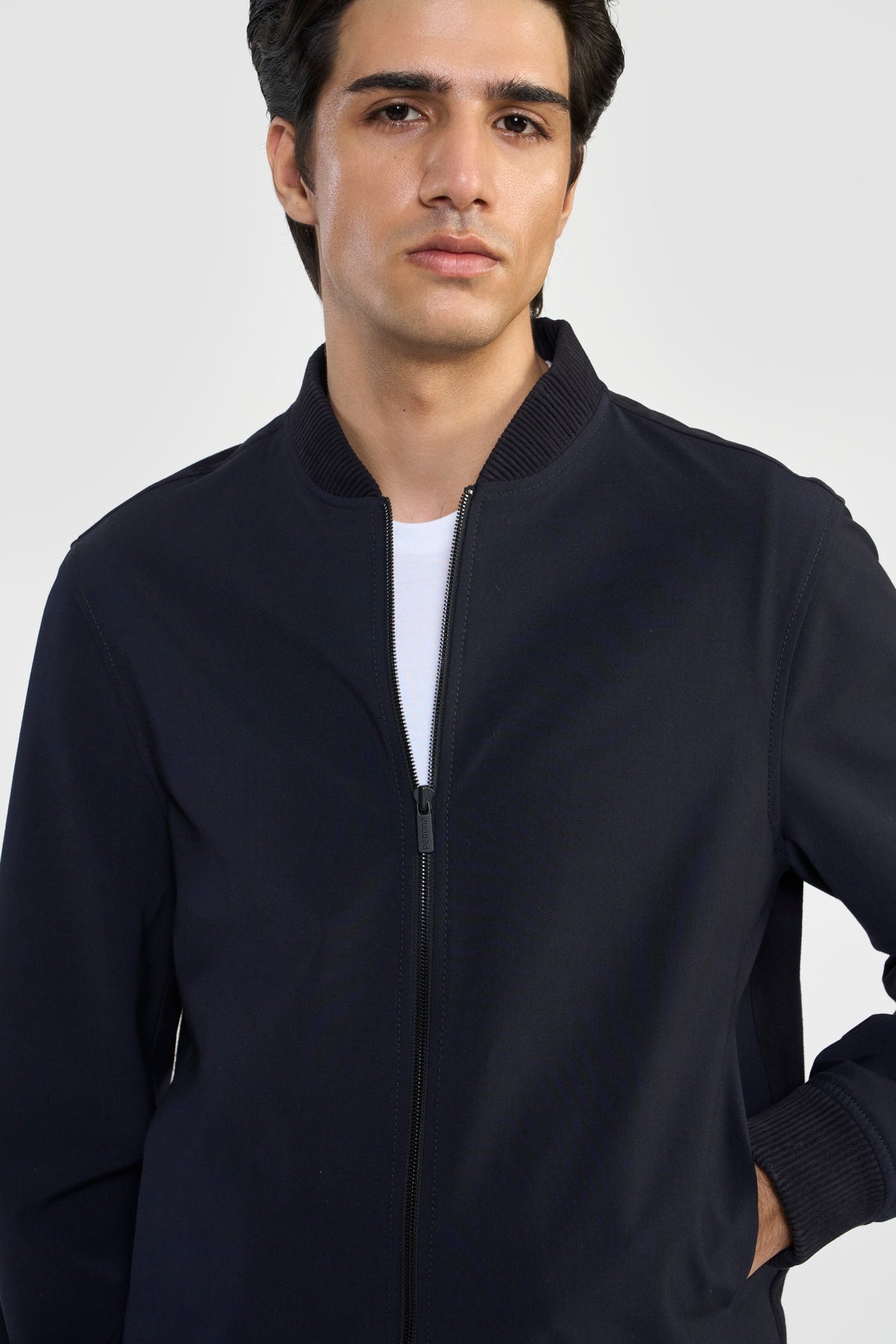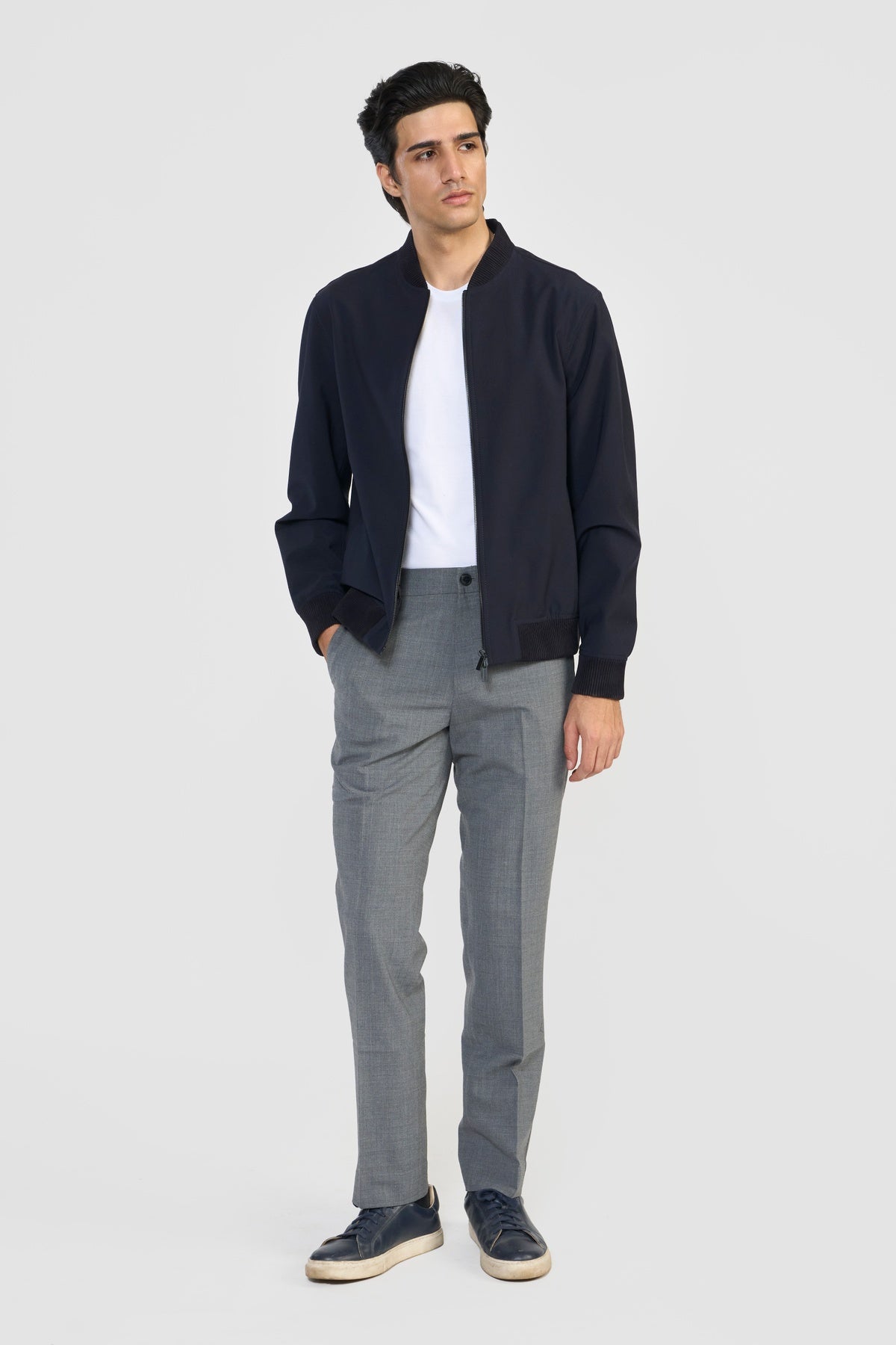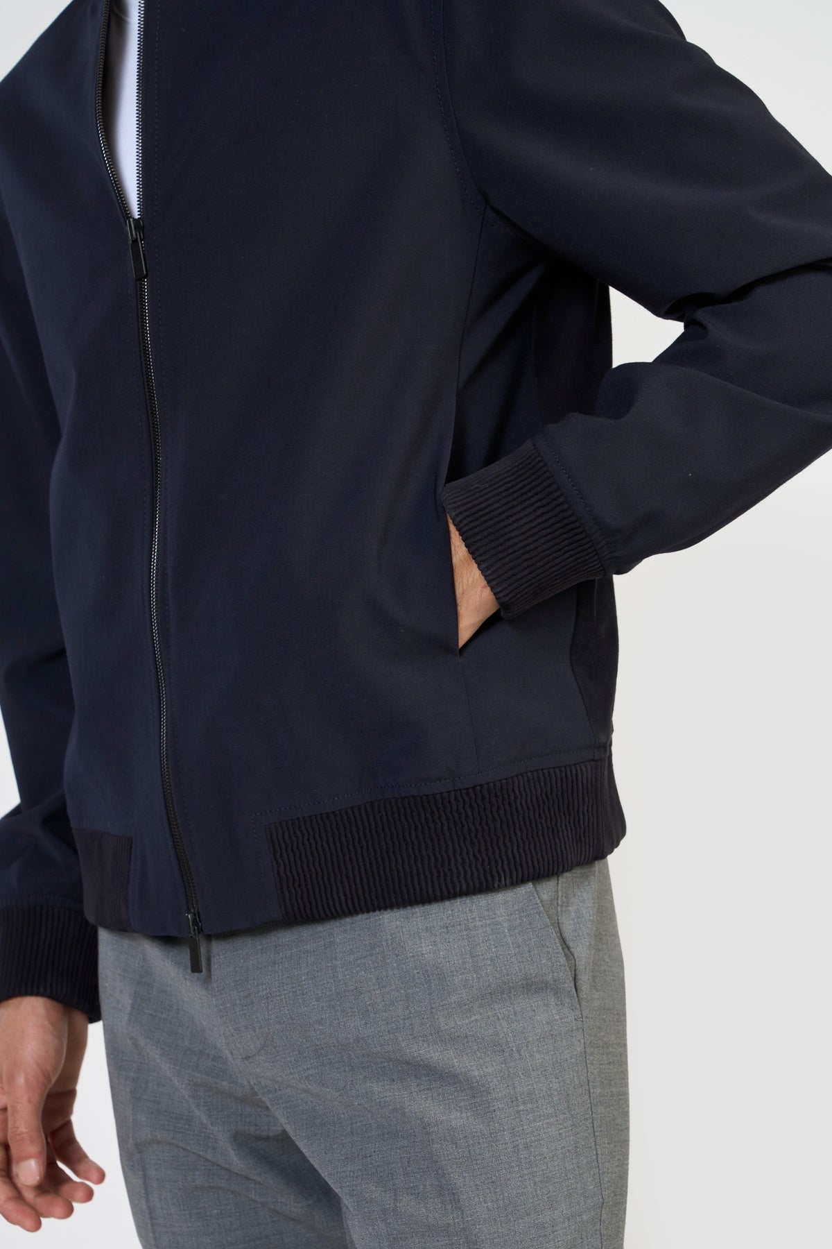 Statement bomber jacket, FLETCHER, in ultra-soft LWG certified premium suede leather and Italian PFC water repellent technical fabric with sleek, contemporary lines. The easy front zipper closure, side functional bone pockets, leather ribbed cuff, collar and bottom hem elevates its effortless design and minimal accent. Each piece embodies our dedication to craftsmanship and textile innovation. Designed for modern living, these styles provide warmth without weight, making them perfect for layering. They bring subtle texture and refined structure to contemporary wardrobes—seamlessly suited for business, travel, and everyday wear.