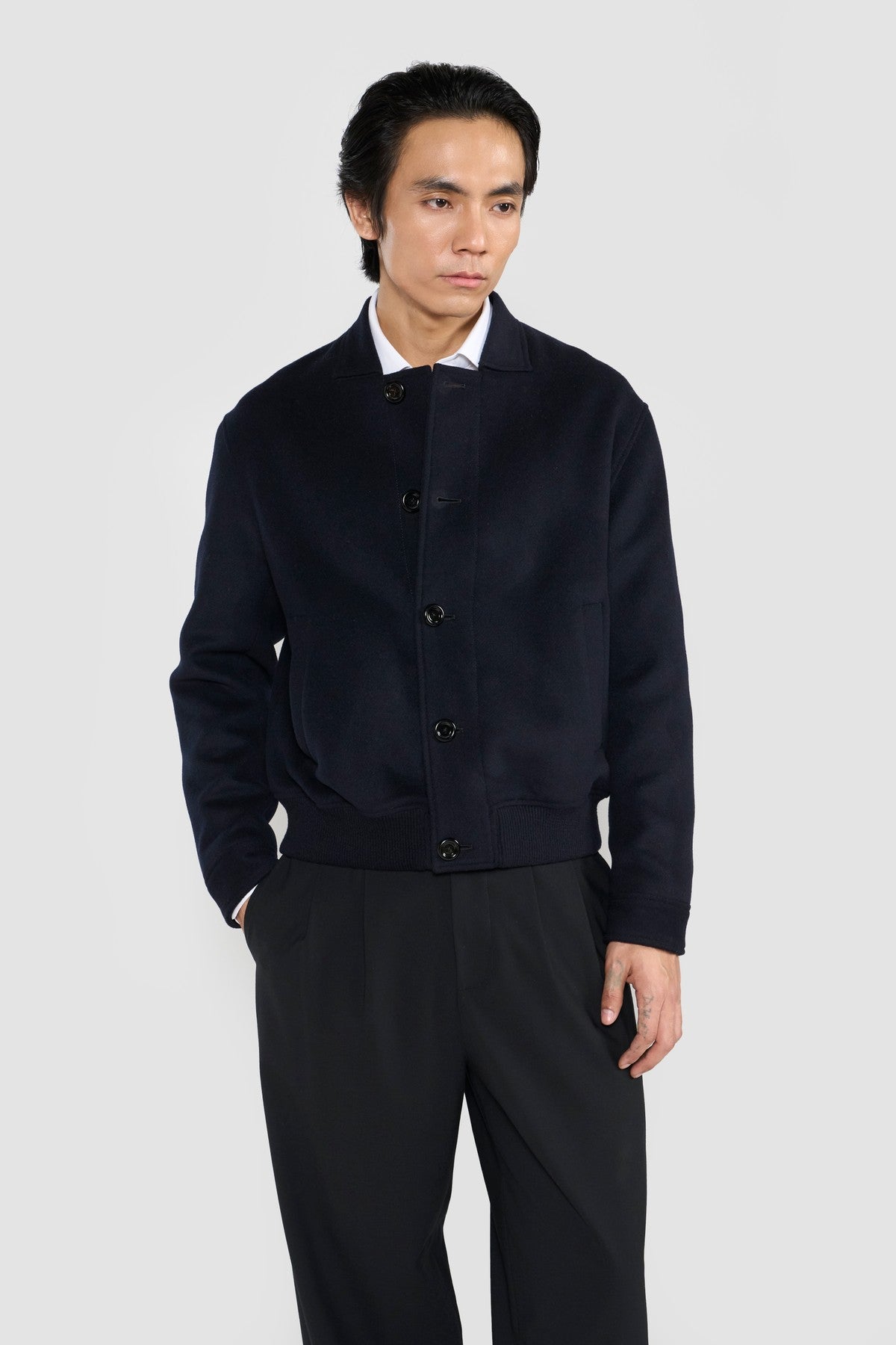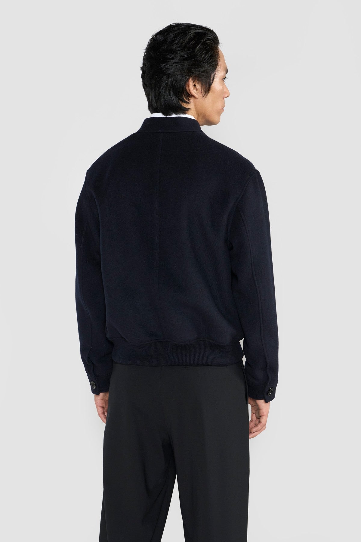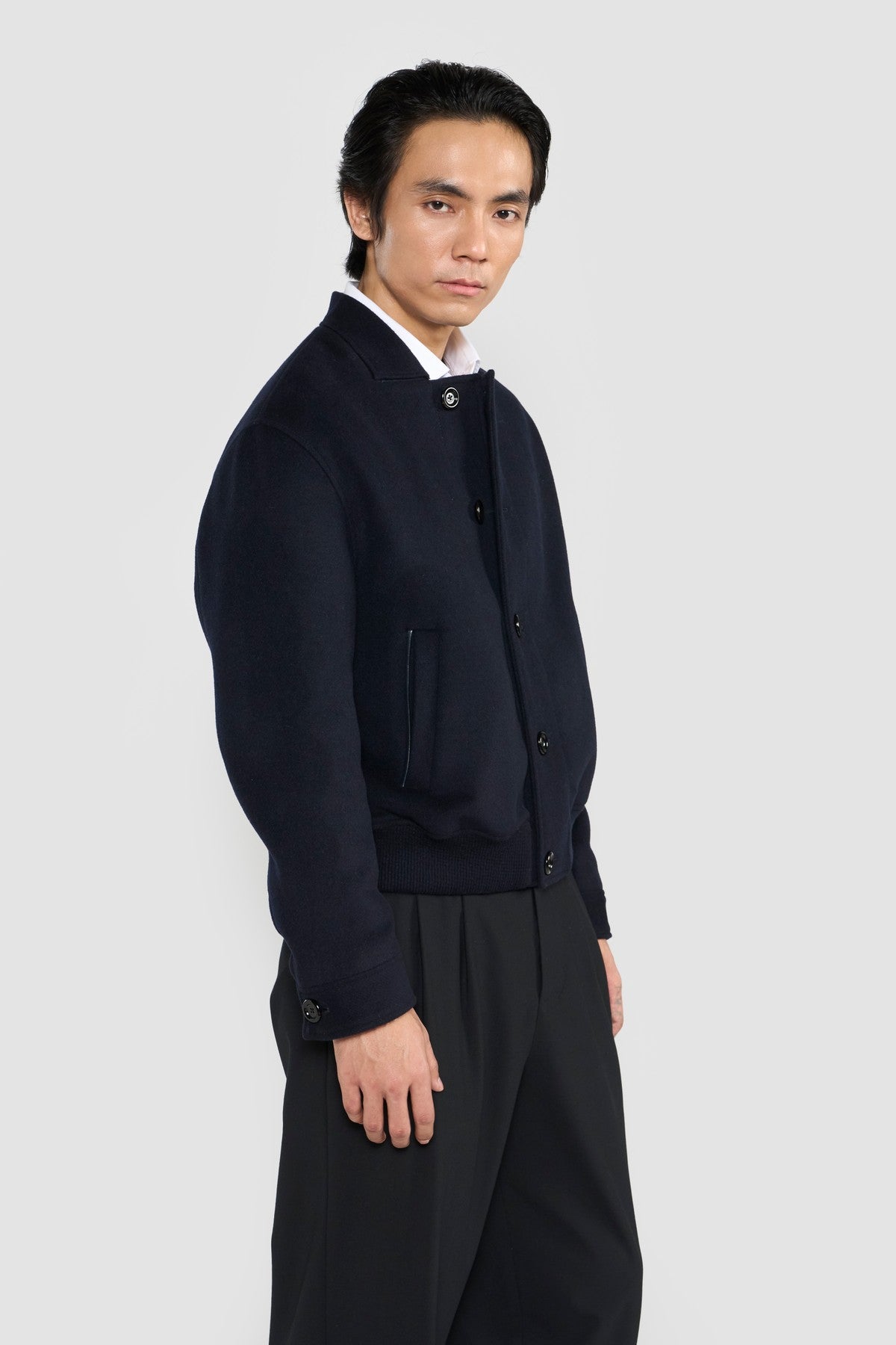 Cut in a relaxed silhouette, the jacket features LWG-certified leather trims for a sophisticated contrast. Thoughtful details include a grown-on slant collar, button-front closure, and bone double welt pockets highlighted with slim leather piping. Finished with an exclusive wool ribbed hem and adjustable cuffs, this modern essential offers timeless style, conscious craftsmanship, and everyday versatility.Relaxed Fit