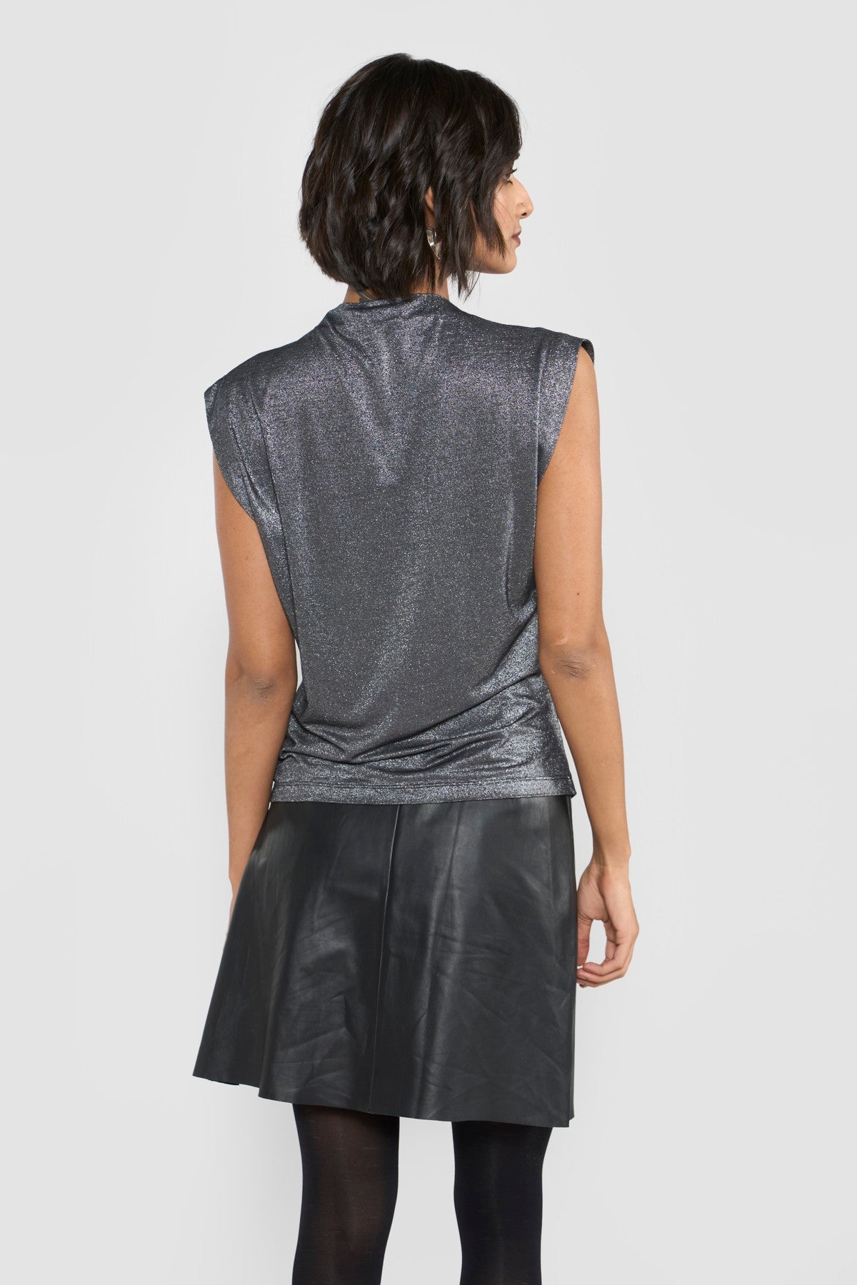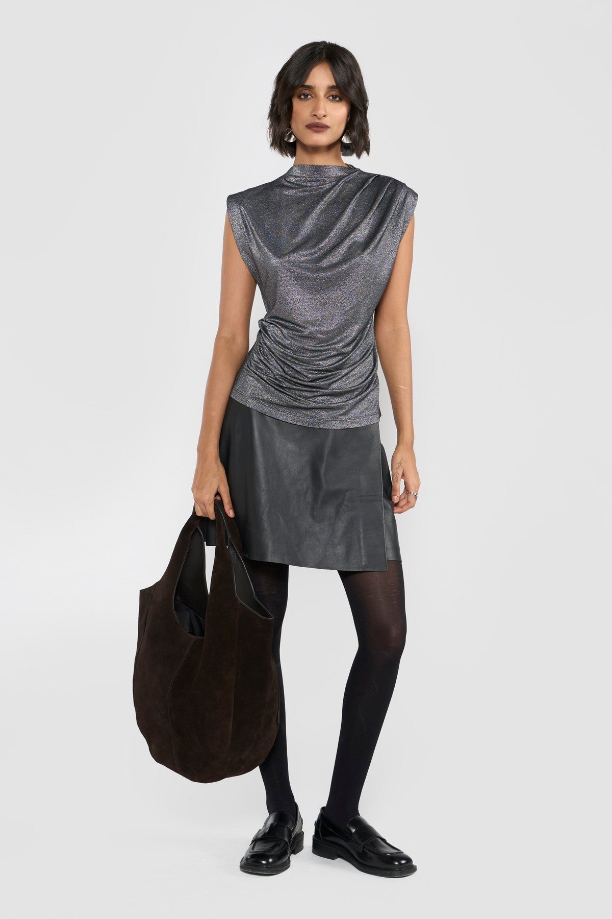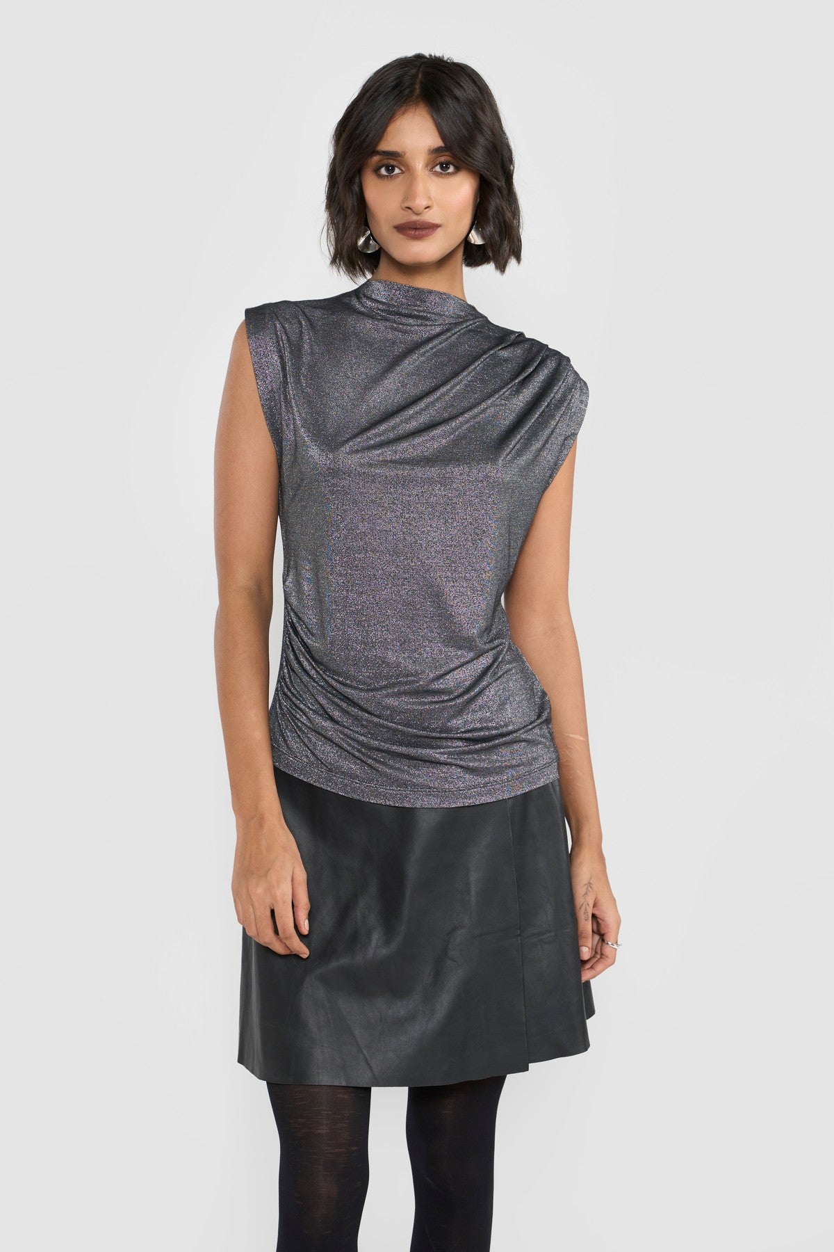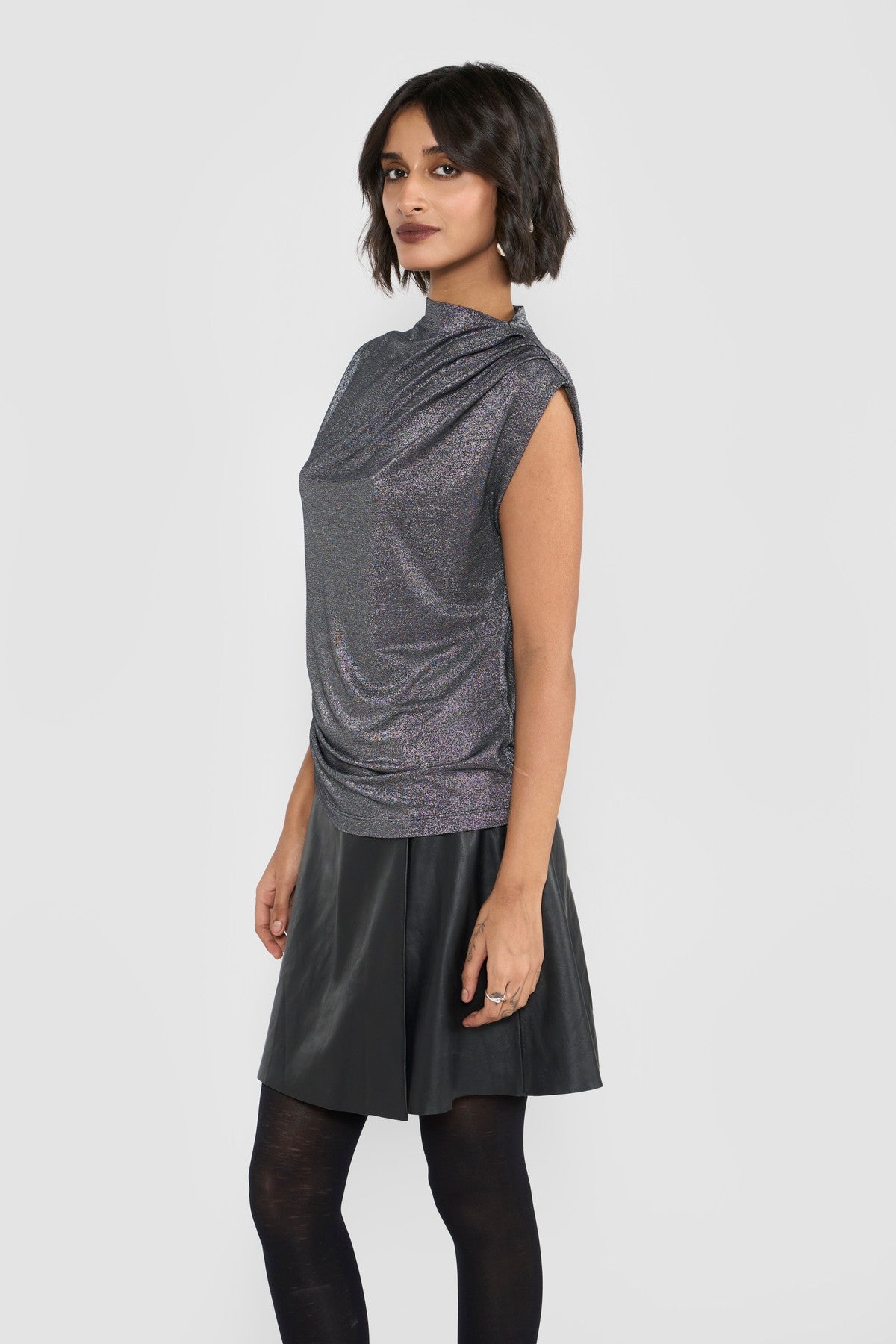 Crafted from a premium viscose-blend stretch fabric with a subtle metallic silver finish, this top exudes effortless sophistication. The soft cowl neckline and gently extended sleeves create a fluid, sculptural silhouette. Its refined sheen enhances the contemporary appeal, while delicate gathers lend quiet movement and depth.