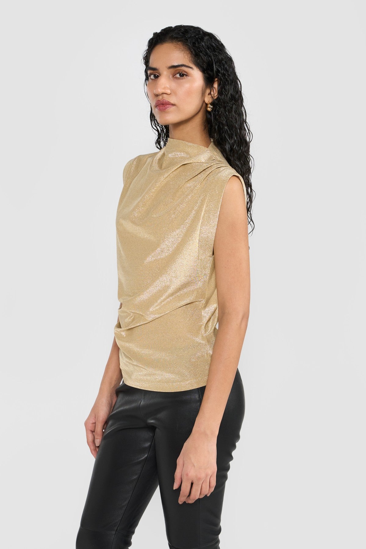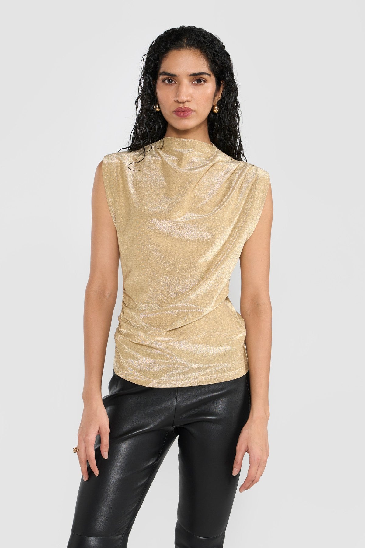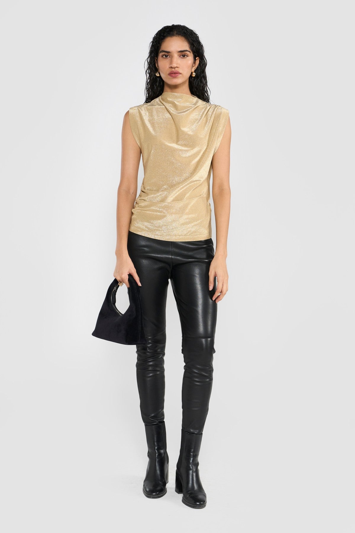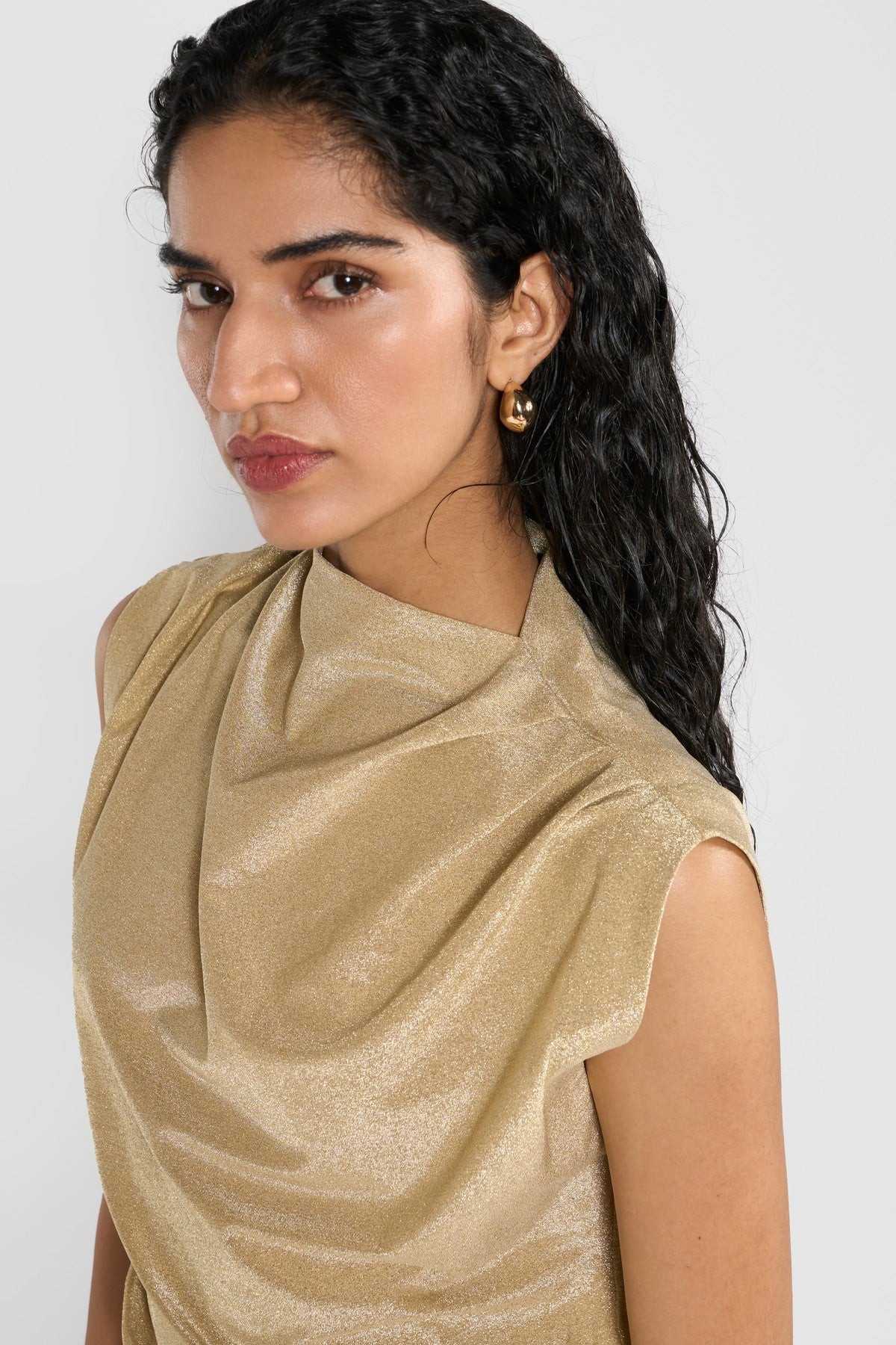 Crafted from a premium nylon-blend stretch fabric with a lustrous surface, this top reflects effortless sophistication. The soft cowl neckline and gently extended sleeves create a fluid, sculptural silhouette. Subtle sheen enhances its contemporary appeal, while delicate gathers add quiet movement and depth.