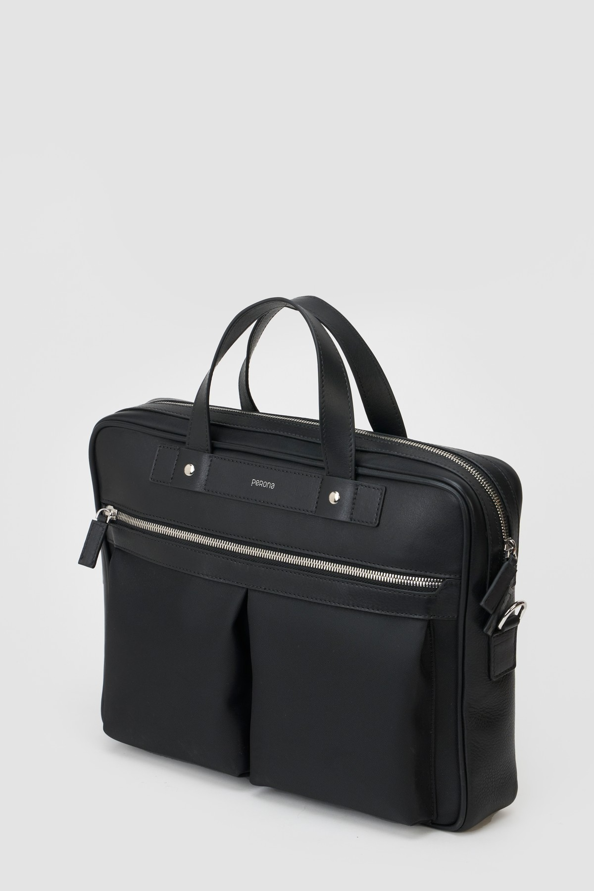 This structured black briefcase embodies a seamless balance of functionality and contemporary design. Crafted from premium PU-coated nylon with a twill texture, paired with smooth leather trims, it presents a sleek silhouette highlighted by minimal detailing and metallic hardware. Designed with a dedicated laptop compartment and two slip-in sections keep essentials neatly organized, secured by a sturdy zipper closure. A front zipper pocket with dual compartments offers quick access on the go. Designed for versatility, it is fitted with dual top handles and a detachable, adjustable shoulder strap—making it equally suited for daily commutes and business travel.