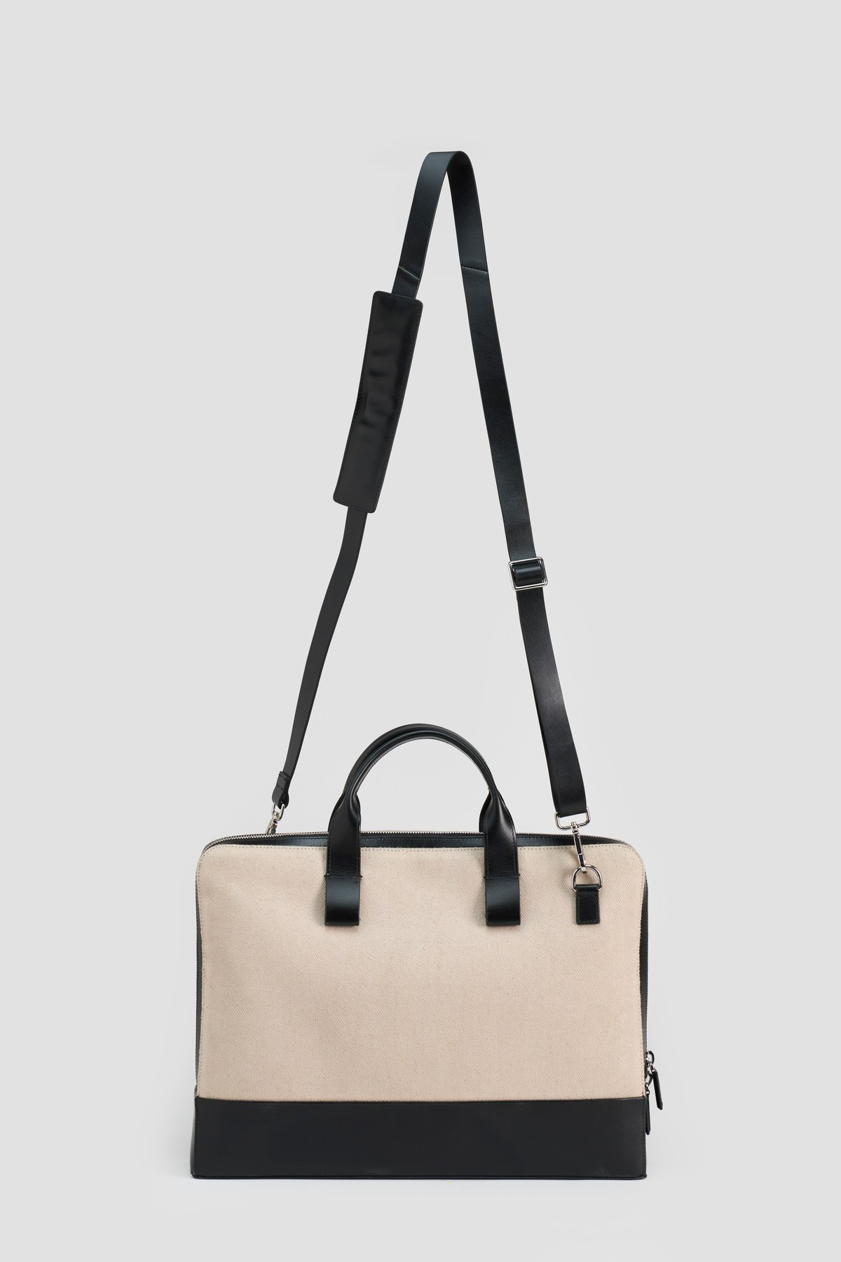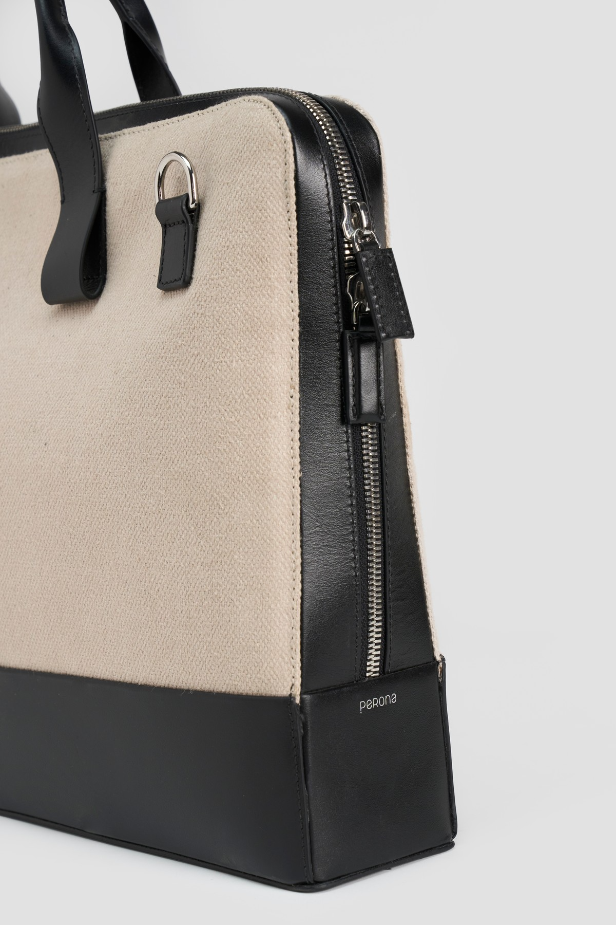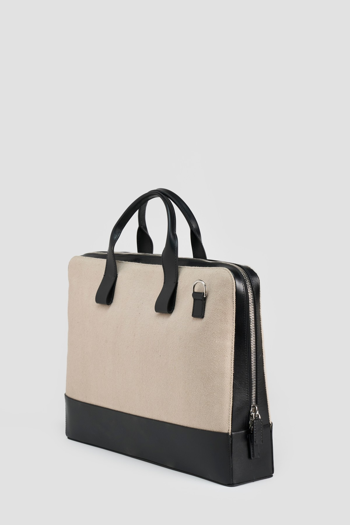 Engineered for durability and elevated style, this men's laptop bag is crafted from a resilient blend of linen and premium Italian leather. Designed to withstand daily wear, its shock-resistant structure ensures your tech stays protected without compromising on aesthetics. Featuring adjustable shoulder straps and sturdy handheld handles, it offers versatile carrying options to suit your routine. The sleek, functional silhouette includes a well-organized interior with dedicated compartments for your laptop, documents, and essentials — making it an ideal companion for work, travel, or everyday commutes.Dimensions- 42cm : 31cm : 8.5cm