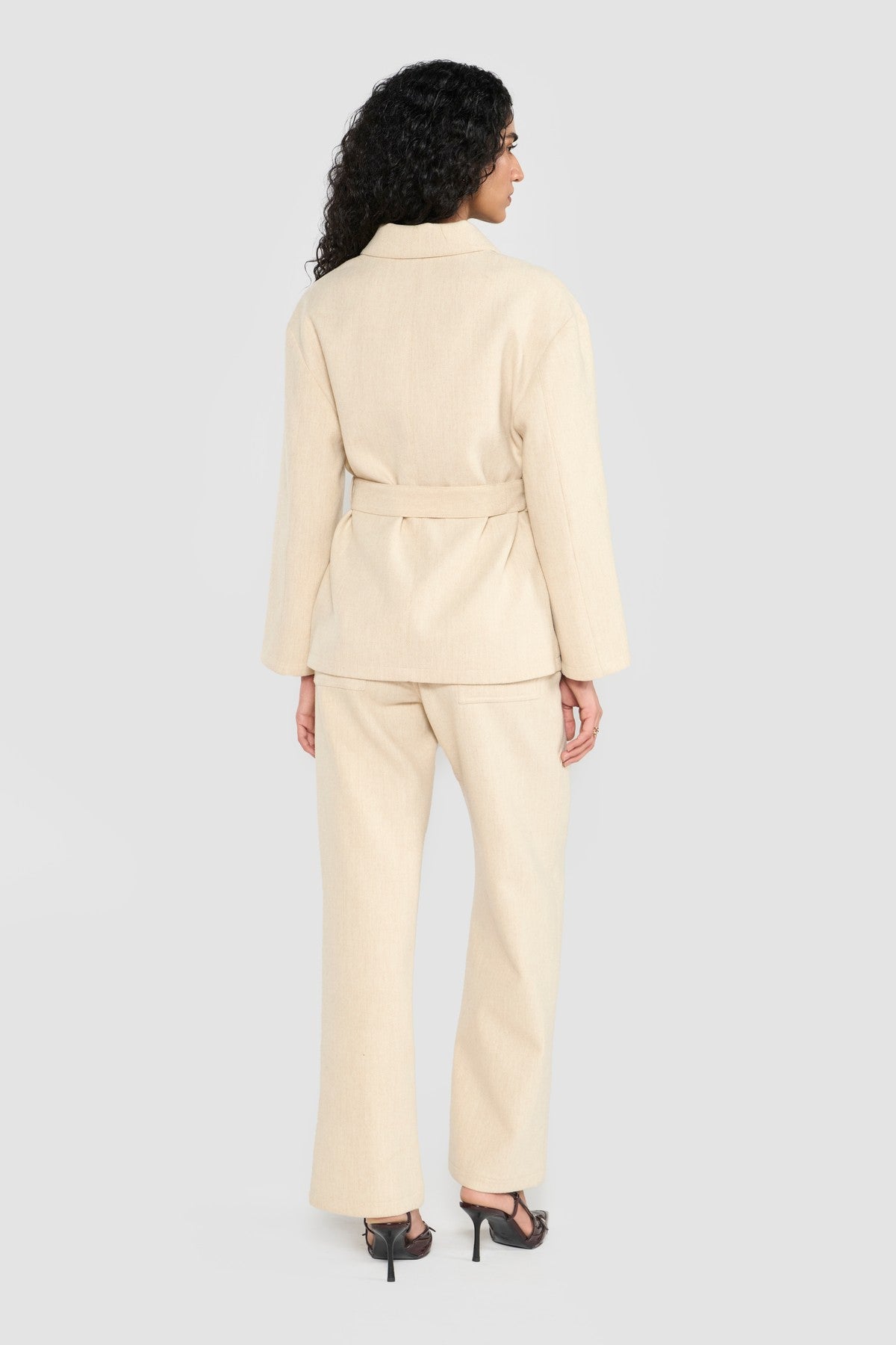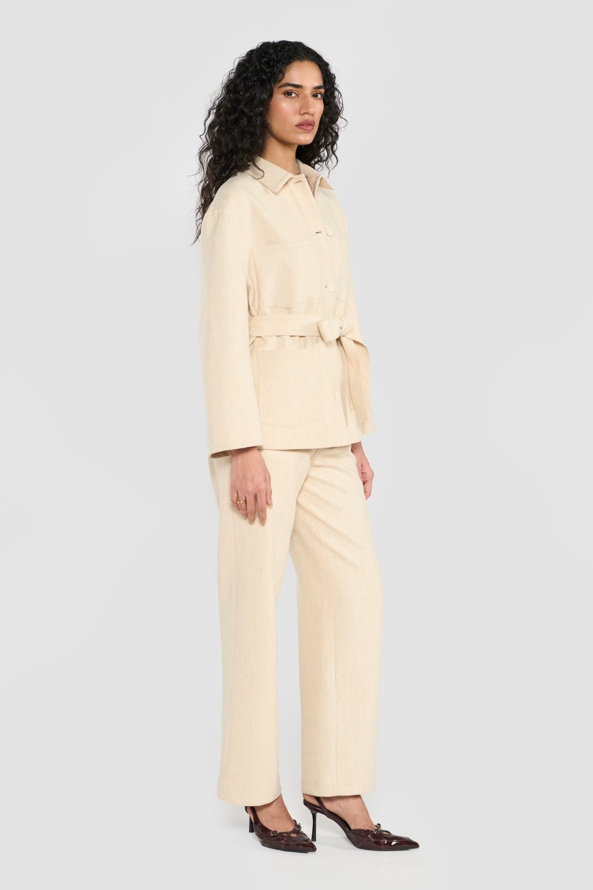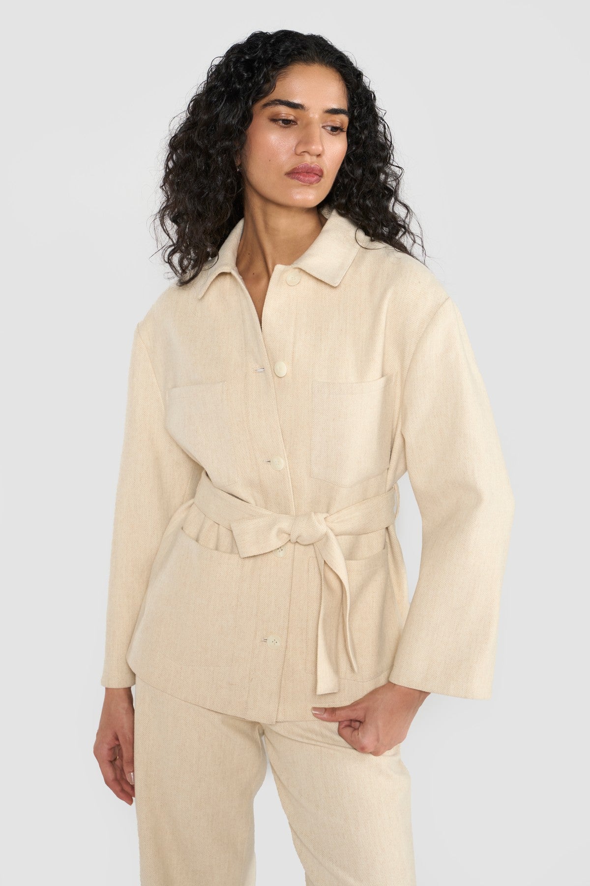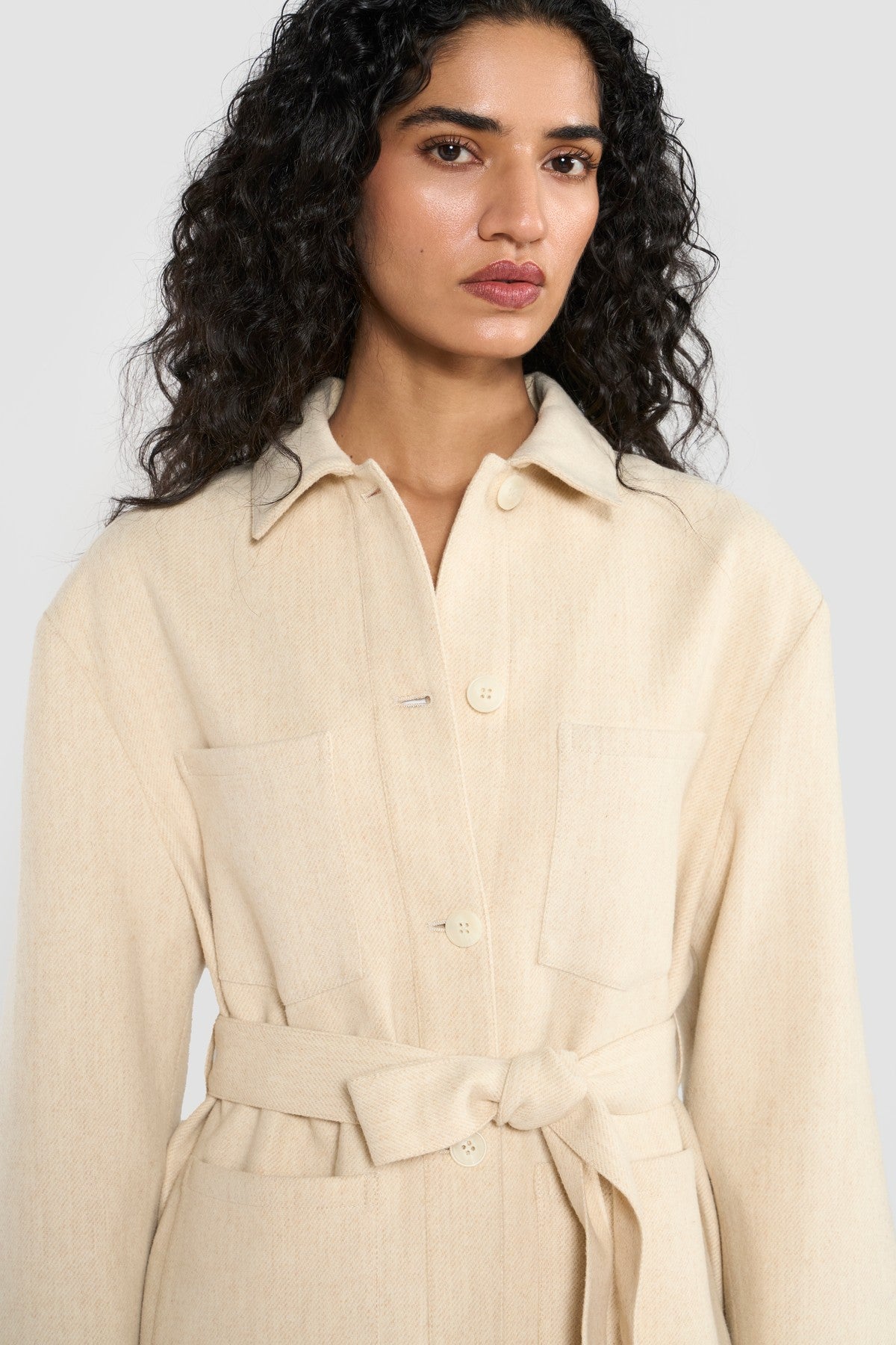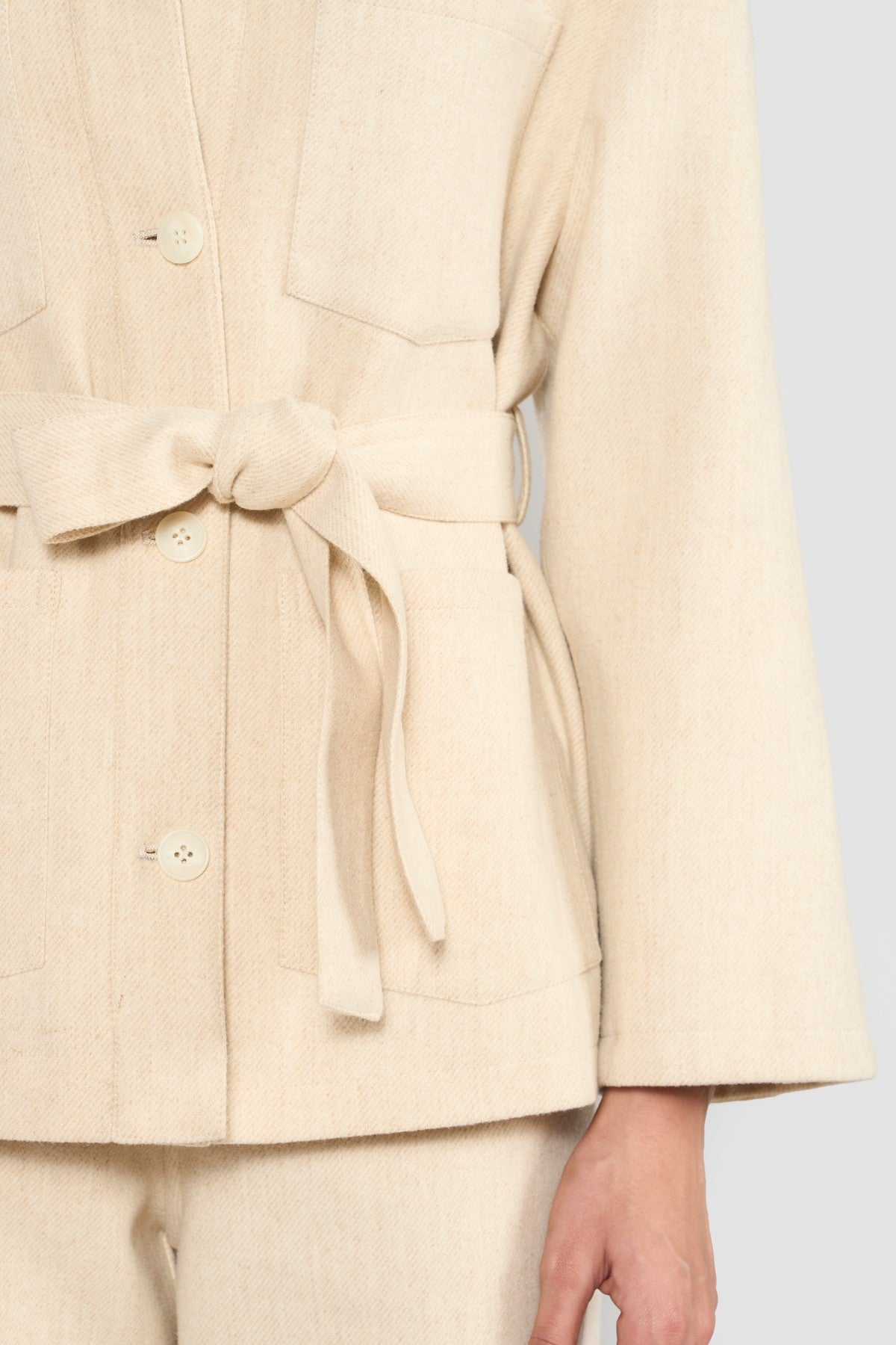A modern essential, this field jacket is tailored from a OEKO-TEX® Certified premium wool blend in Perona’s exclusive ivory colour, offering refined structure and timeless appeal. Designed with a statement stand collar, flap pockets, and a concealed front zipper closure, it balances functionality with understated sophistication. The adjustable cuff openings add versatility, while the waist belt—enhanced with decorative stitching and tonal edge detailing—creates a flattering, tailored silhouette. An elevated staple, this jacket transitions seamlessly from city wear to weekend escapes, embodying effortless elegance in a signature shade.