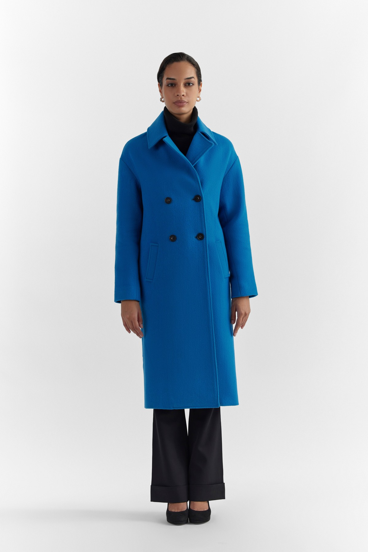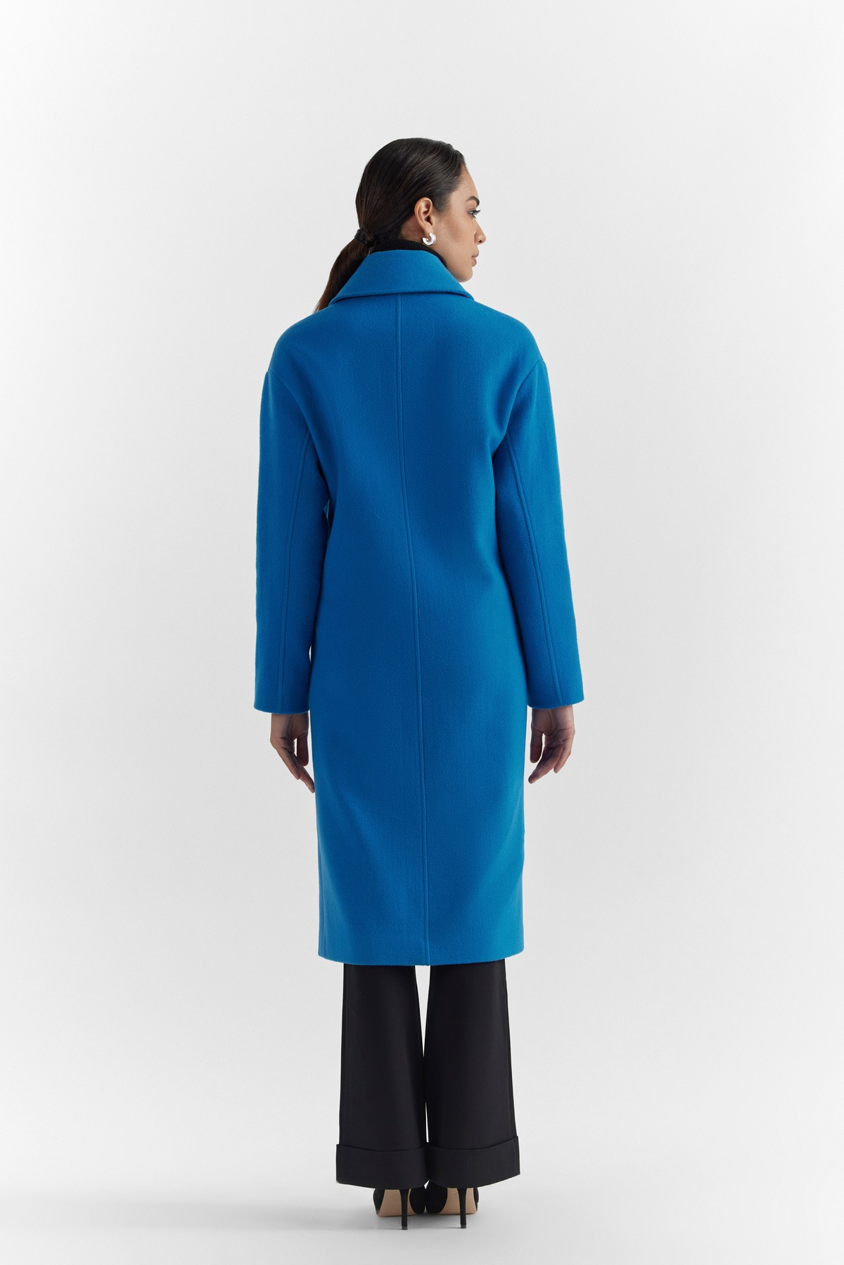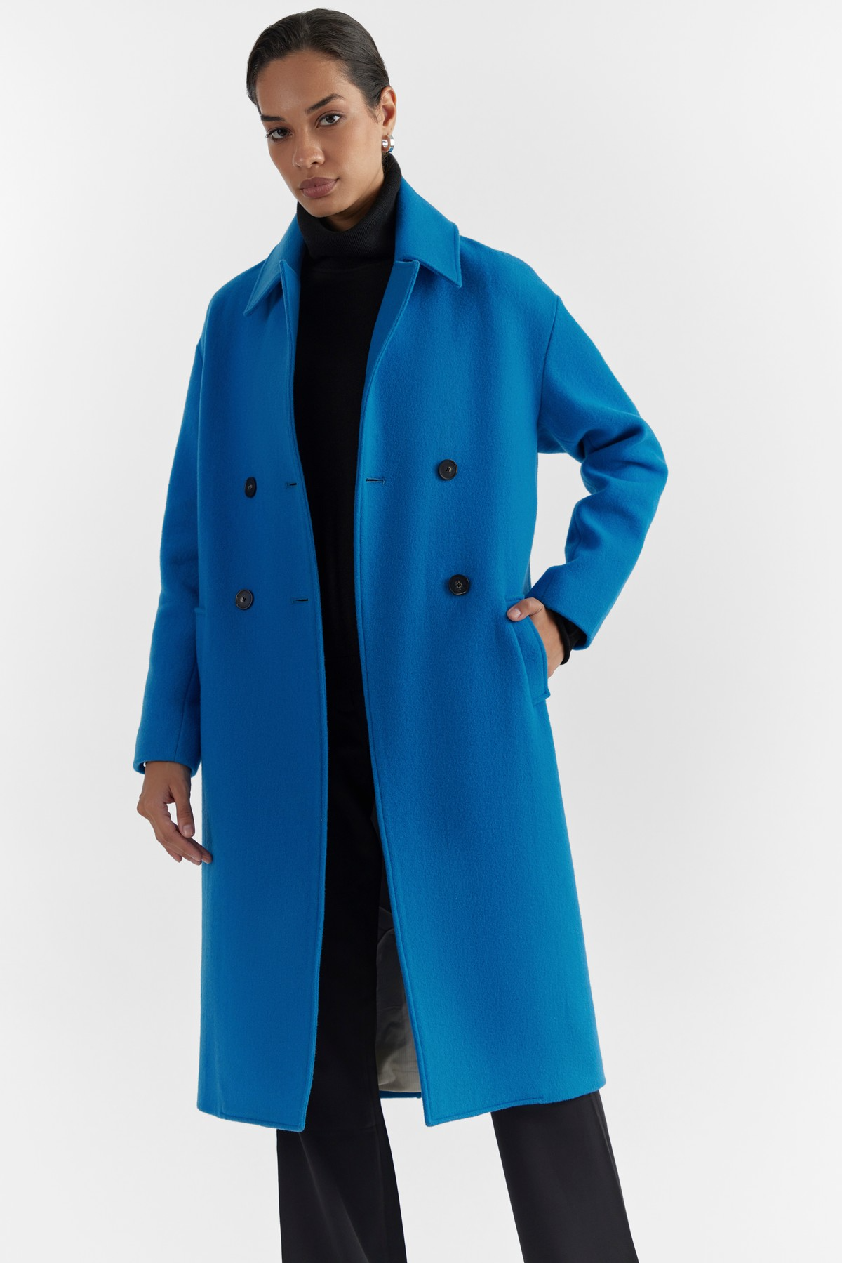 Modern design with Perona’s aesthetics. This coat is accentuated with enveloping form, modern silhouette, drop shoulder and vibrant alpine blue colour. A minimal rarity, crafted from a premium light weight wool- encapsulating ultra- softness and warmth.- Model height is 5'7" ft (170 cm ) and is wearing size S