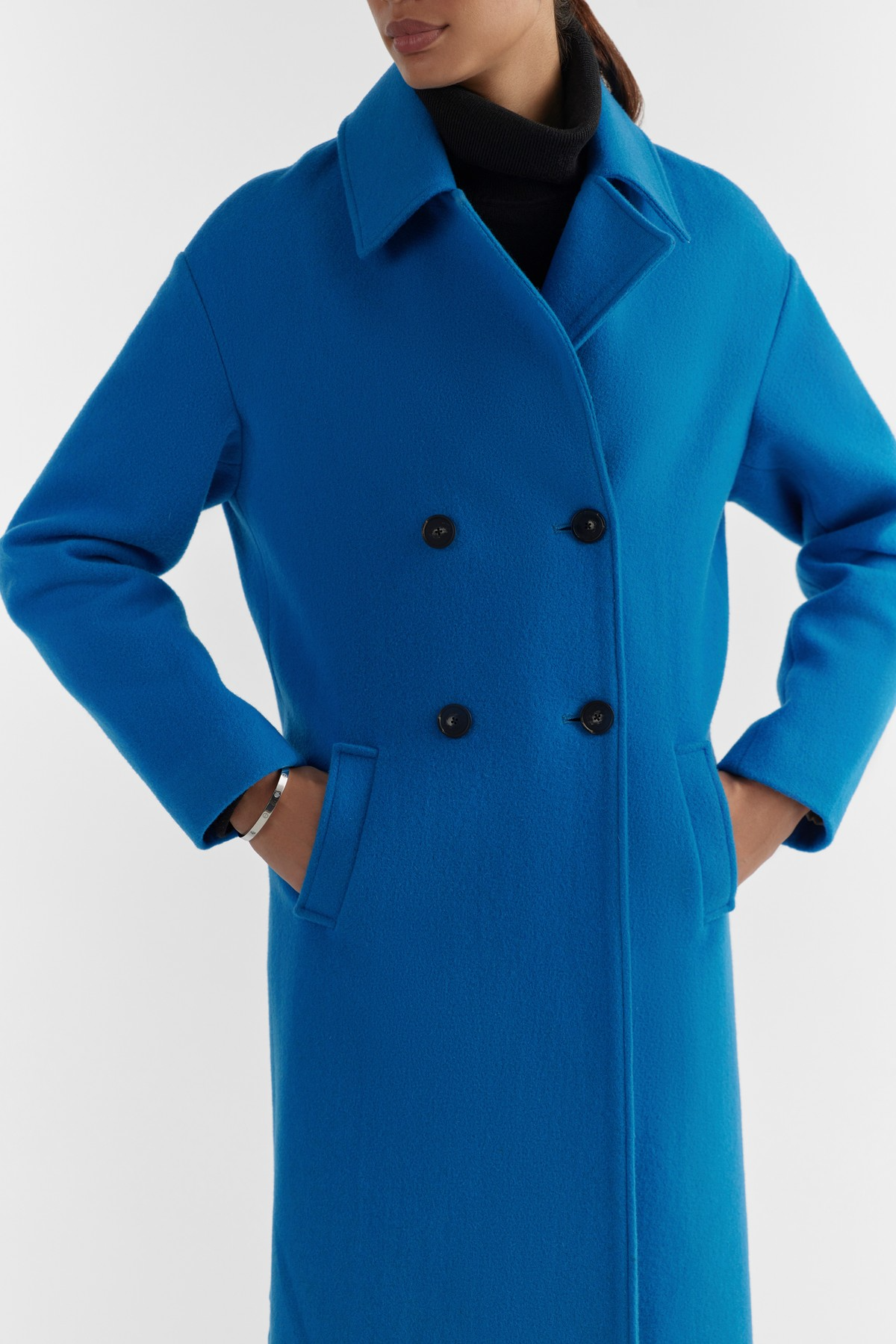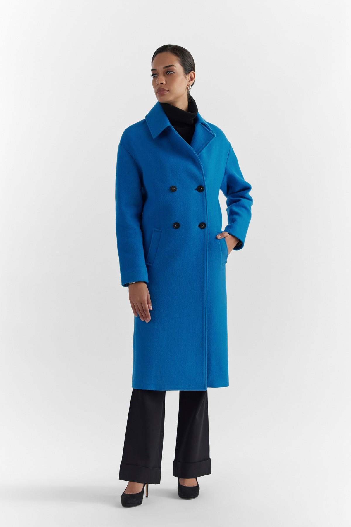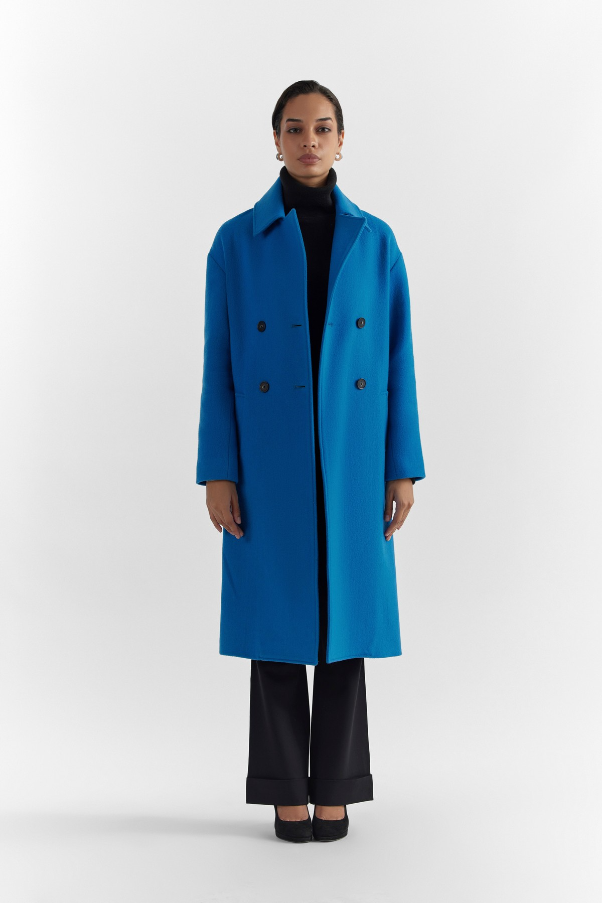 Modern design with Perona’s aesthetics. This coat is accentuated with enveloping form, modern silhouette, drop shoulder and vibrant alpine blue colour. A minimal rarity, crafted from a premium light weight wool- encapsulating ultra- softness and warmth.- Model height is 5'7" ft (170 cm ) and is wearing size S