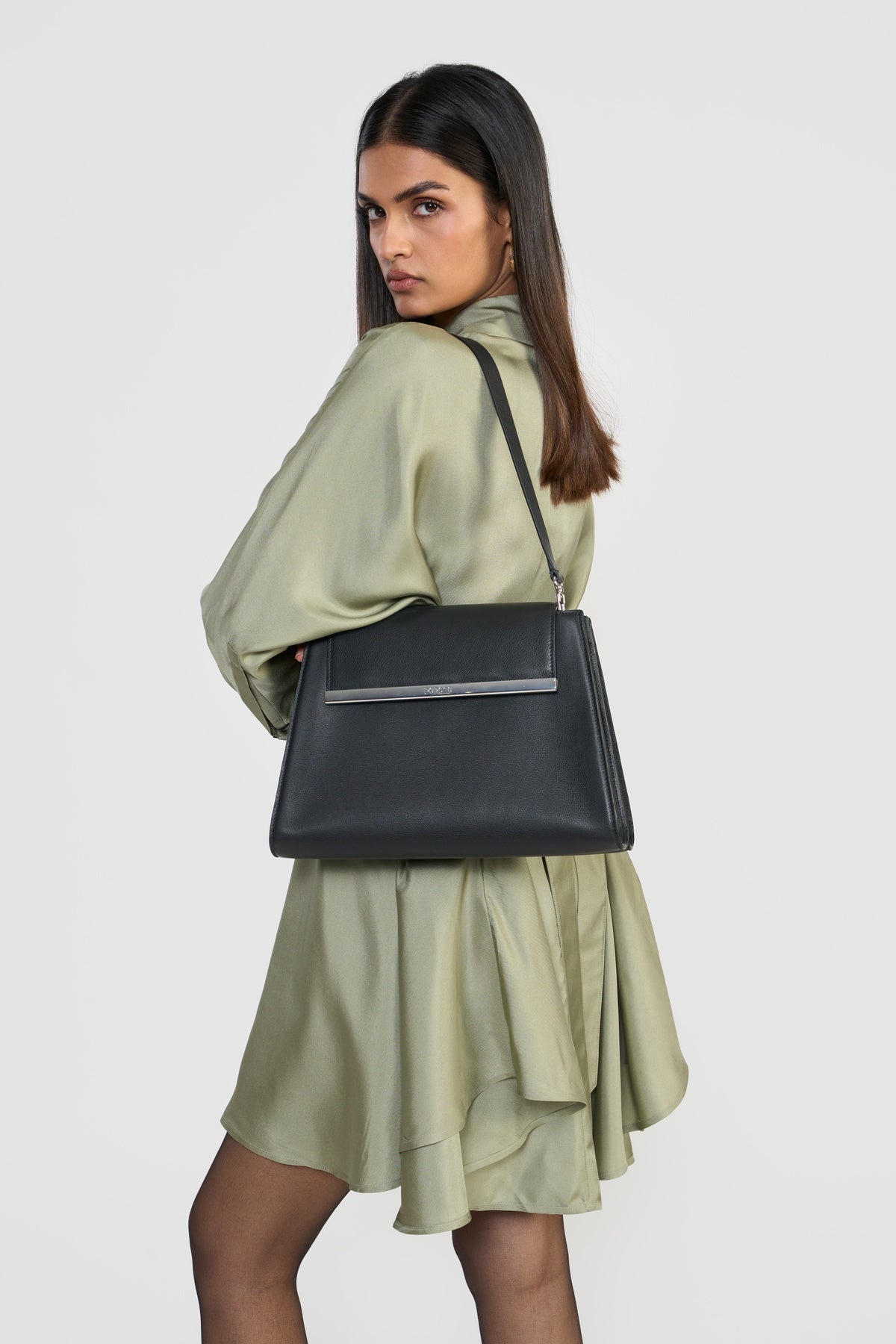 A considered approach to everyday functionality. This structured shoulder bag is crafted from smooth premium leather in classic black, designed with clean lines and a minimal silhouette. A subtle metallic bar detail at the flap introduces a quiet element of refinement. Inside, dual compartments and a central zip pocket offer practical organization, while an additional back slip pocket provides easy access to essentials. The magnetic snap fastening keeps belongings secure, and the adjustable shoulder strap allows for versatile wear—over the shoulder or carried by hand.
