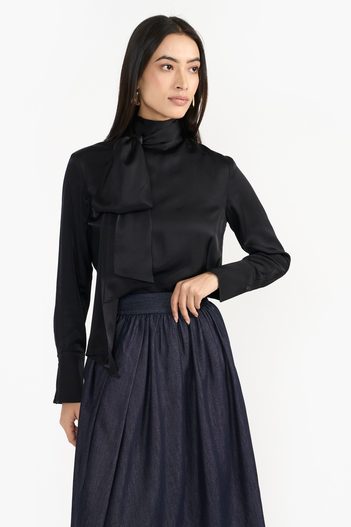 Crafted from eco friendly premium rayon, Joyce is a new take on occasion dressing, this neck tie top is crafted from premium Italian fabric. Tailored silhouette with A line cut, high neck collar, Broad cuff with premium single button closure and full sleeves. It's finished off with a de and fluted hem. Rayon is a plant based material which consists of cellulose fibre, made from dissolving pulp along with high absorbent and breathability features.