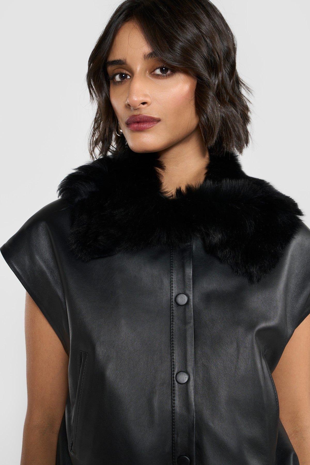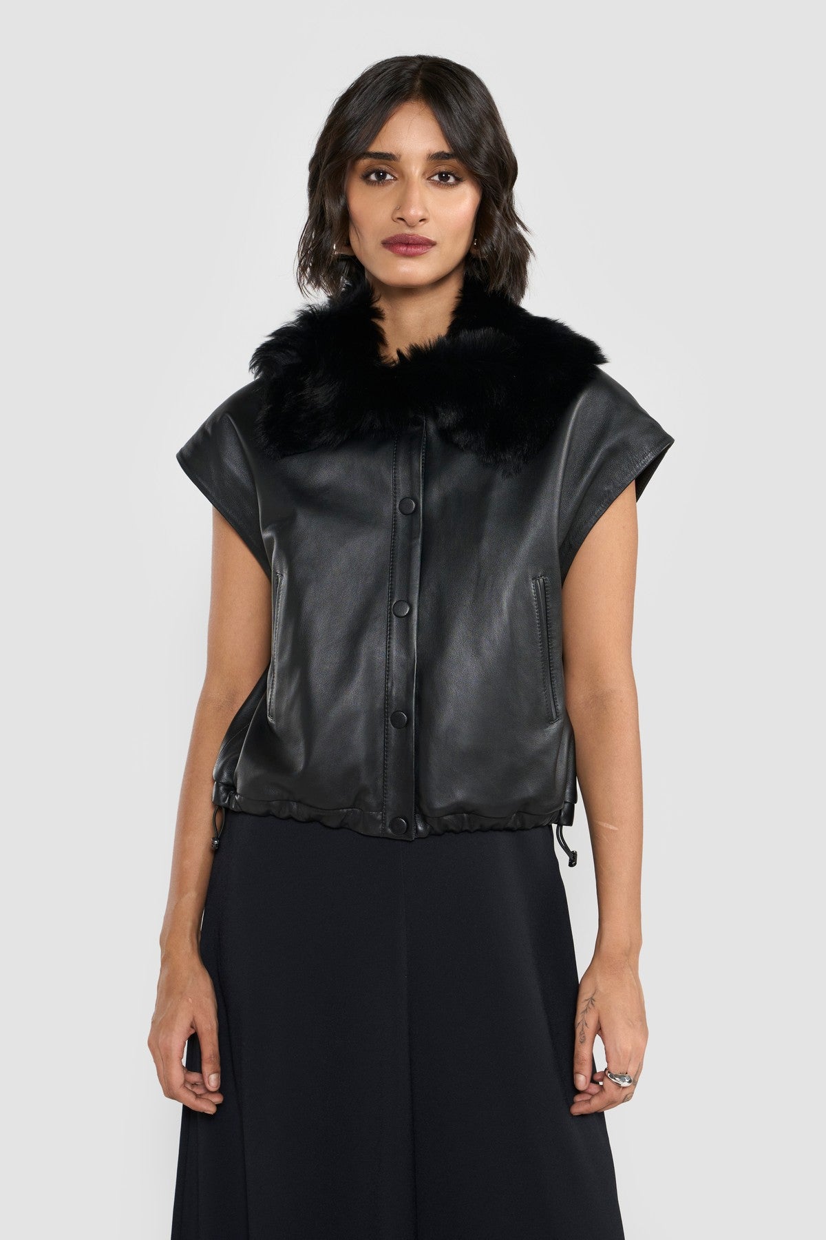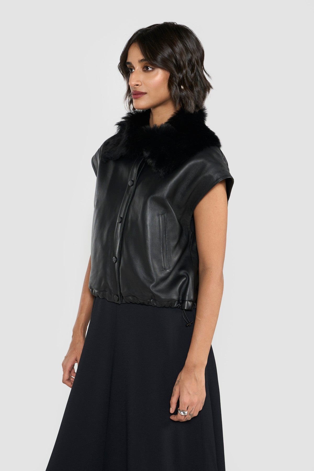 Make a bold statement with our chic and cozy cropped puffer vest. This piece is a must-have for the modern woman who loves to combine luxury with an edgy street style. Crafted from LWG certified supple black leather-effect material, this vest features a plush black Shearling fur collar that adds a touch of high-fashion drama and warmth. The puffer design provides lightweight insulation without the bulk, while the cropped silhouette and adjustable elastic hem create a flattering, cinched waist. A front button opening offers versatility in styling, allowing you to layer it over your favourite long-sleeve tops, sweaters, or dresses.