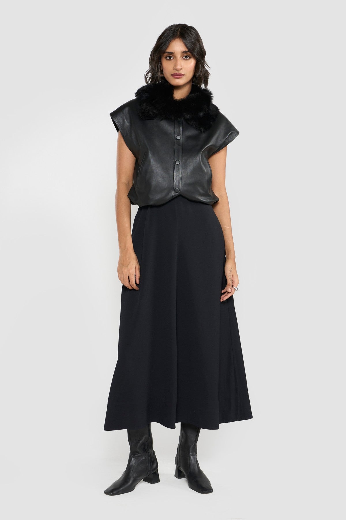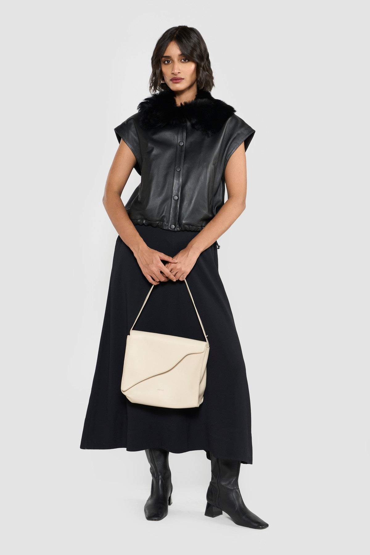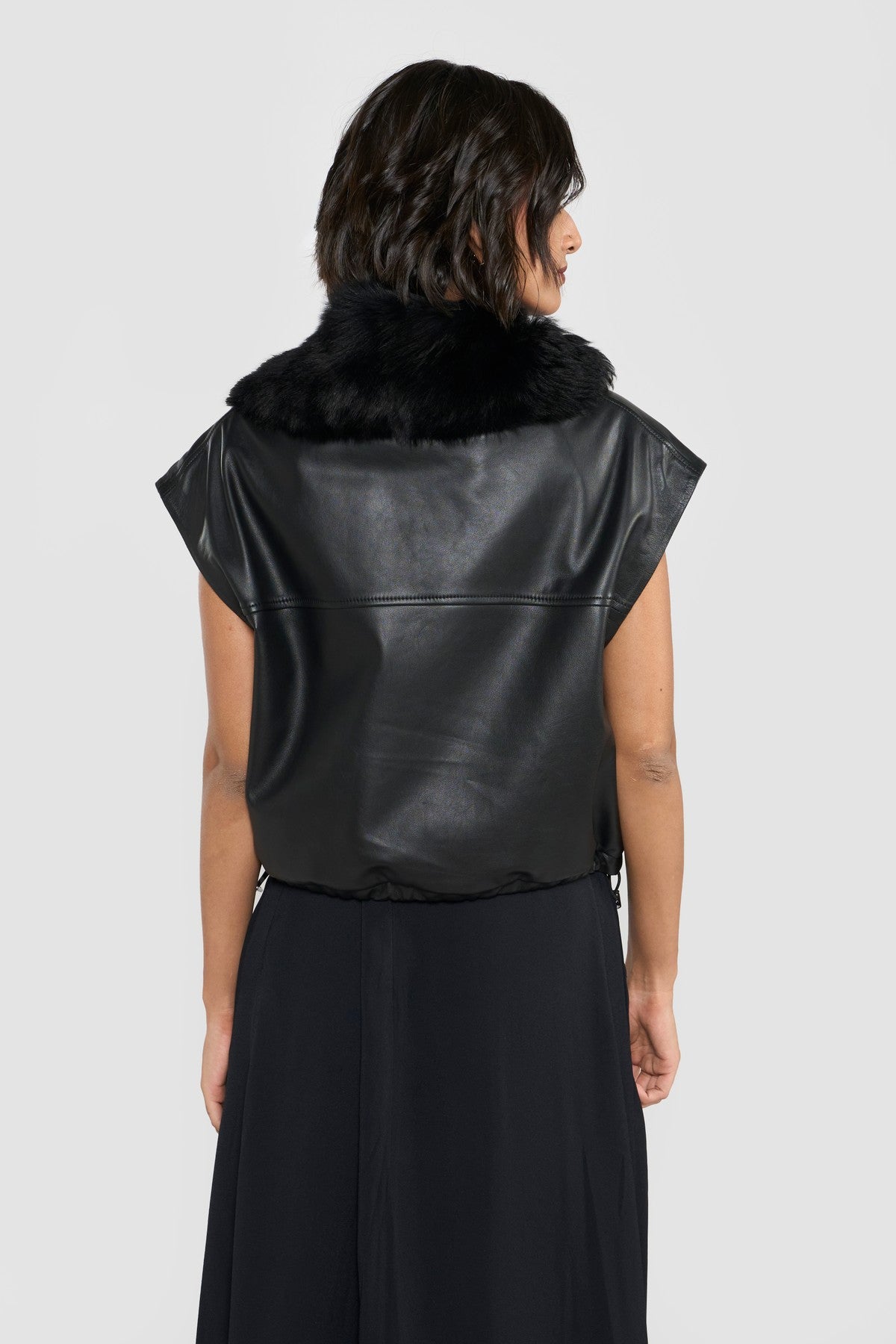 Make a bold statement with our chic and cozy cropped puffer vest. This piece is a must-have for the modern woman who loves to combine luxury with an edgy street style. Crafted from LWG certified supple black leather-effect material, this vest features a plush black Shearling fur collar that adds a touch of high-fashion drama and warmth. The puffer design provides lightweight insulation without the bulk, while the cropped silhouette and adjustable elastic hem create a flattering, cinched waist. A front button opening offers versatility in styling, allowing you to layer it over your favourite long-sleeve tops, sweaters, or dresses.