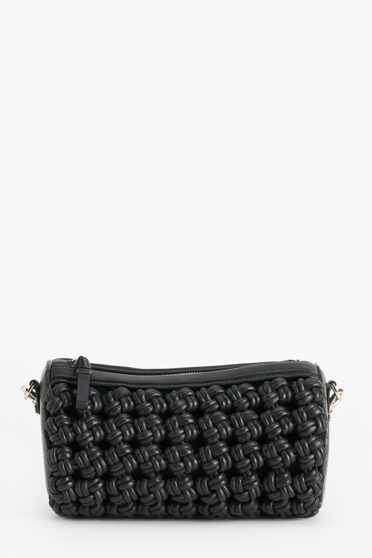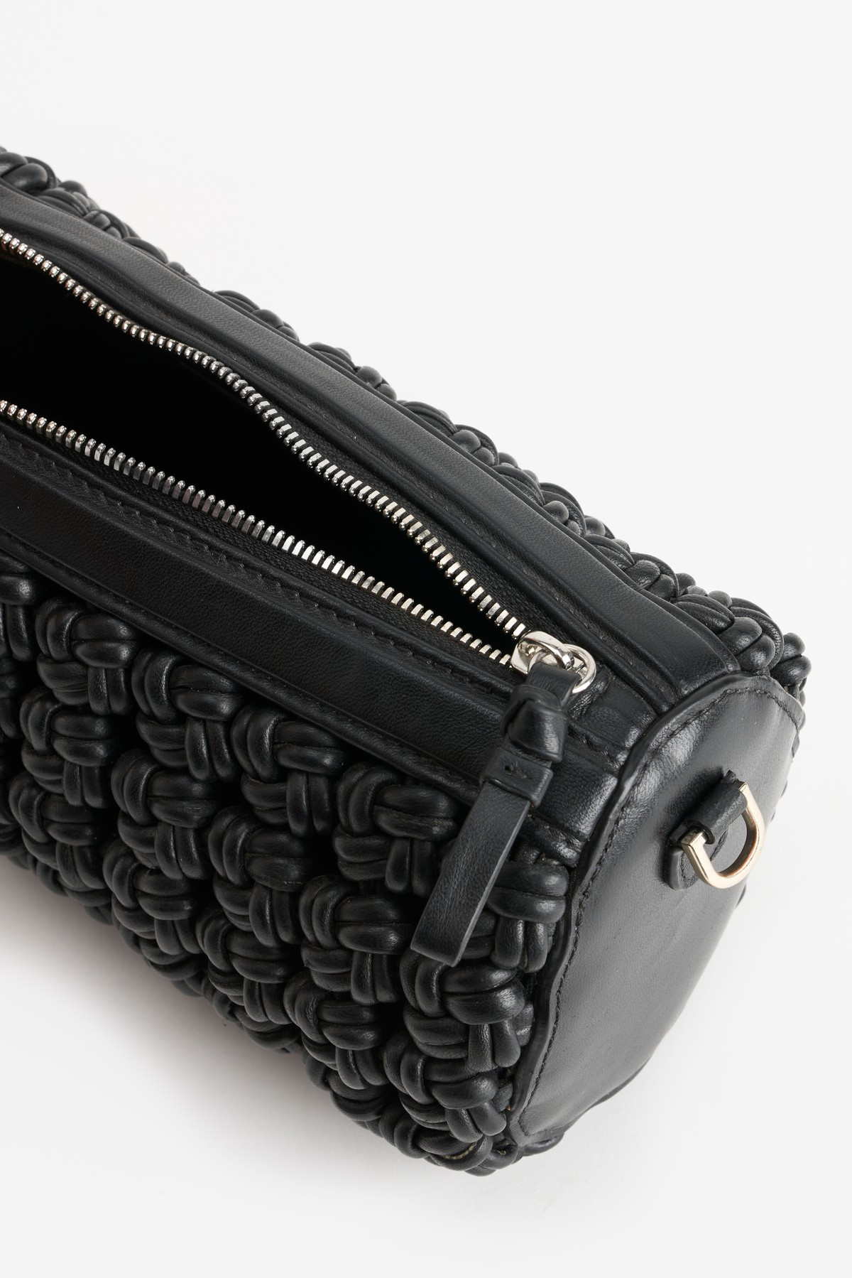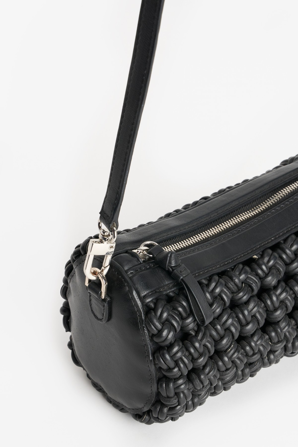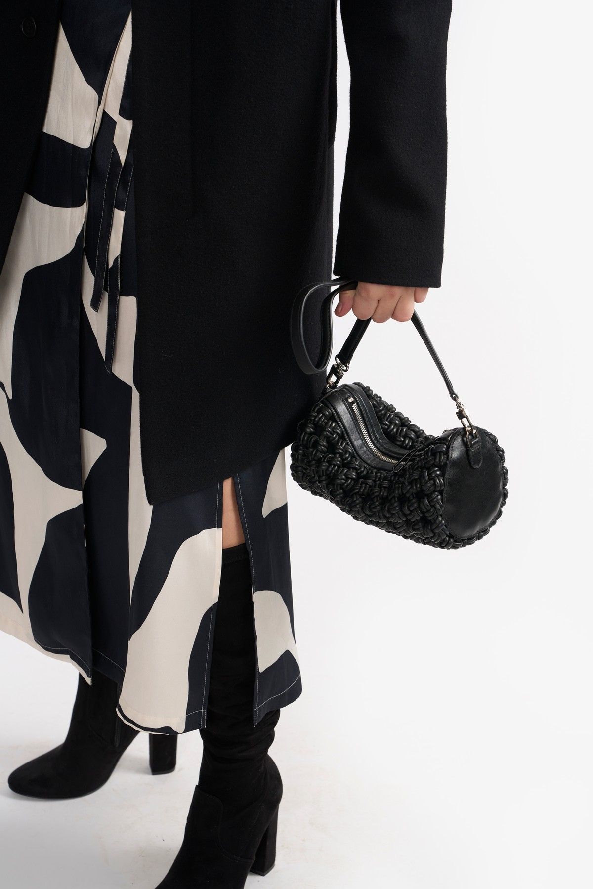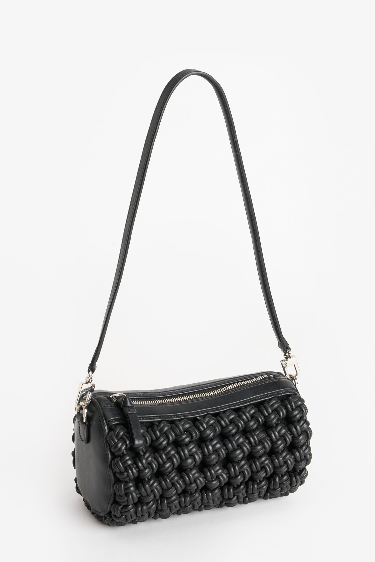 Effortlessly timeless. Crafted from fine, genuine leather, Perona's KATNISS bag is a generously-sized cylindrical bag dives into the heart of exceptional craftsmanship perfectly calibrated with hand crafted intricate weave creating an innovatively connected double solomon's knoting pattern with circular leather cords, giving it a statement woven matt like texture look. Designed to be held in hand and is adorned cylindrical to carry all your essentials effortlessly. Featured with adjustable shoulder strap that continues as a gusset and adorned with edge paint. Its striking yet versatile form makes it an ideal day-to-night hand bag. Its striking yet versatile form makes it an ideal day-to-night hand bag. Crafted from LWG certified premium lush Italian leather with premium linen lining.
