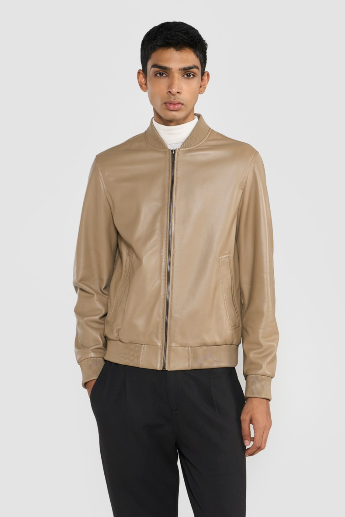 Statement bomber jacket in parchment colour with sleek, contemporary lines. Crafted from ultra-soft LWG certified leather, this jacket is the perfect option for winter. The easy front zipper closure, side functional zipper pockets, leather ribbed cuff, collar and bottom hem elevates its effortless design and minimal accent.