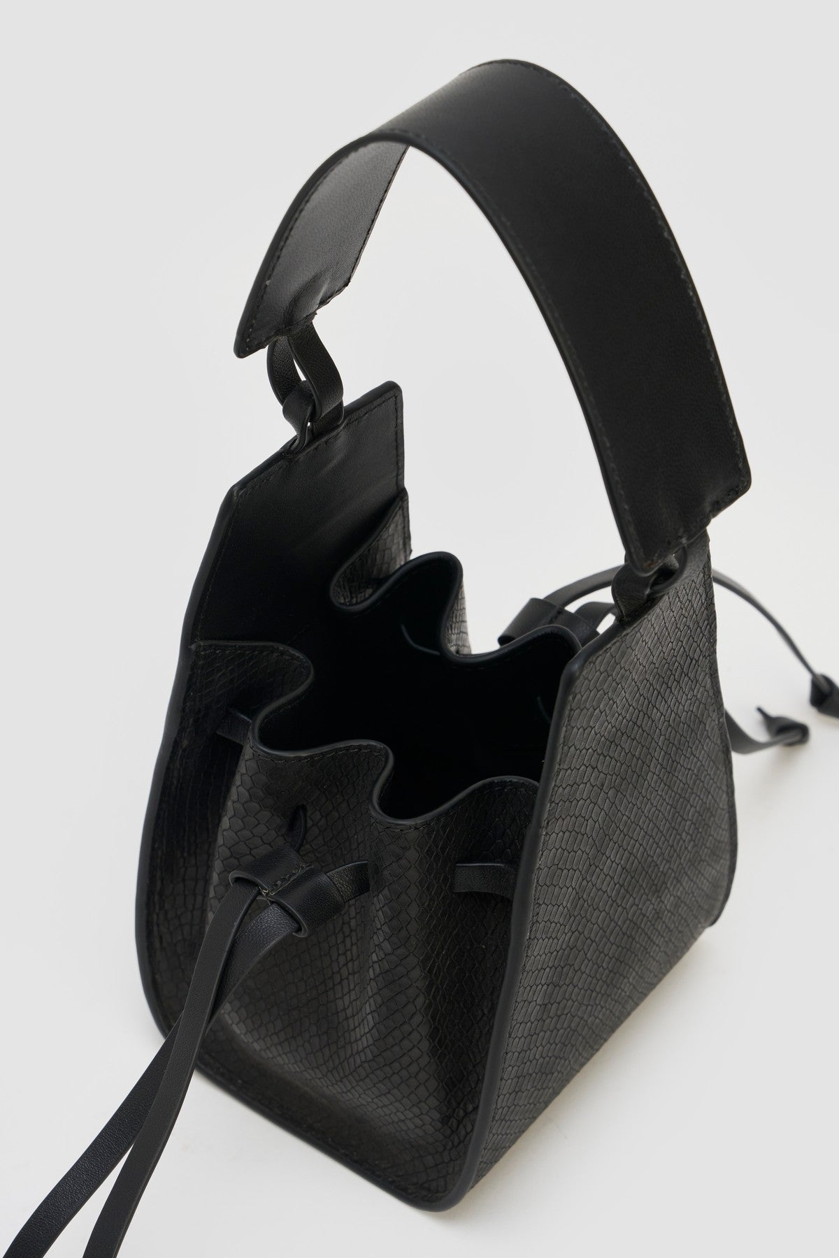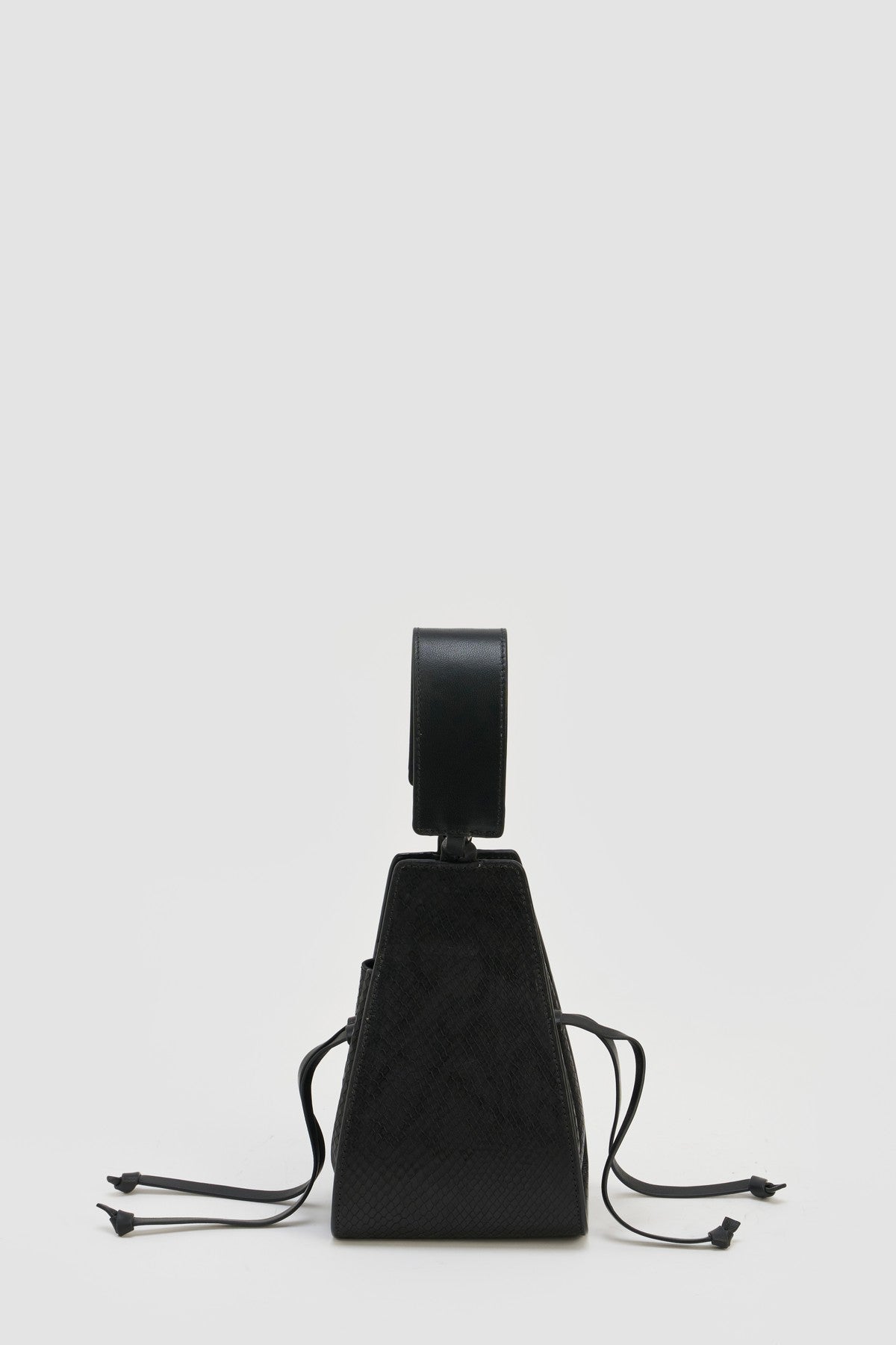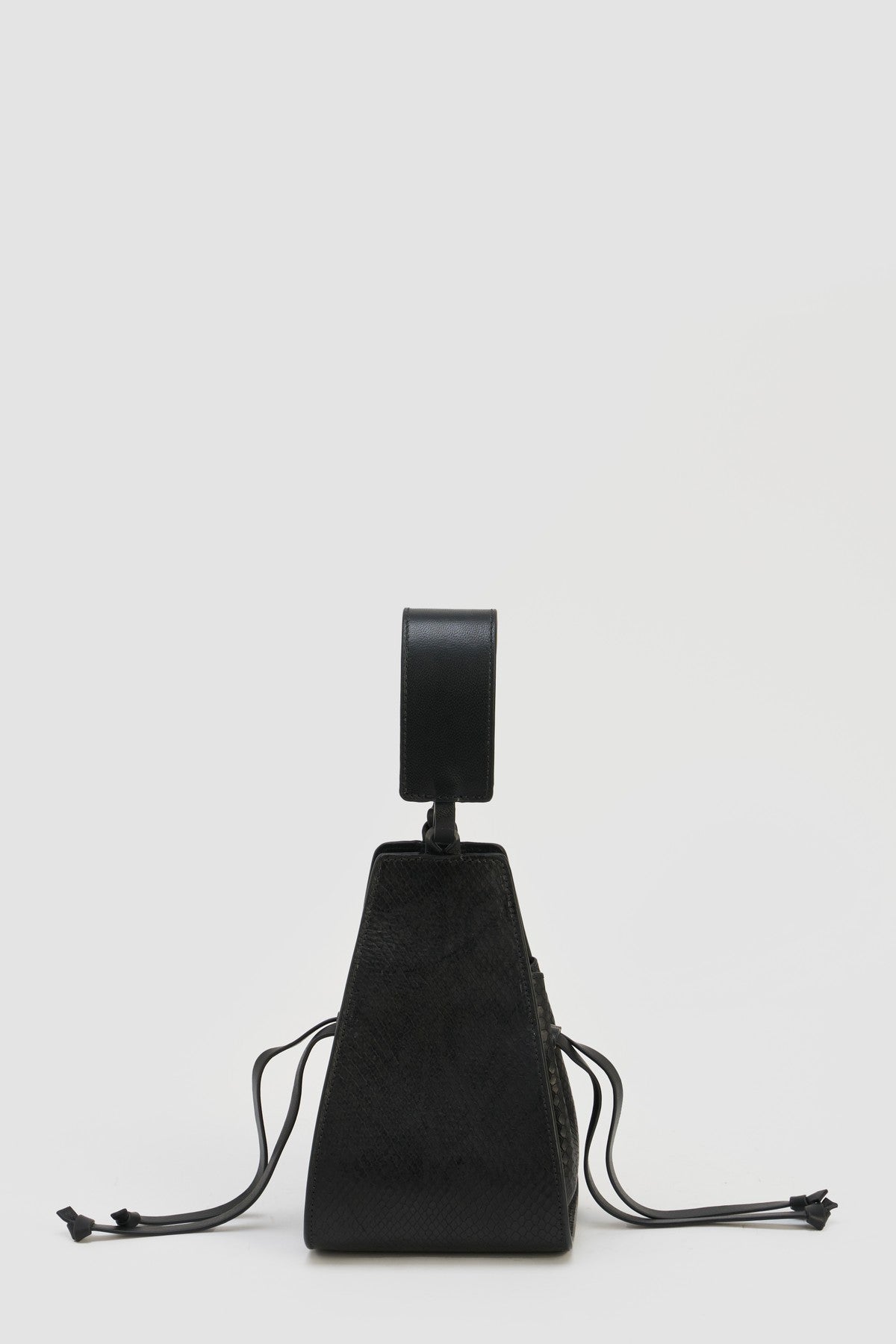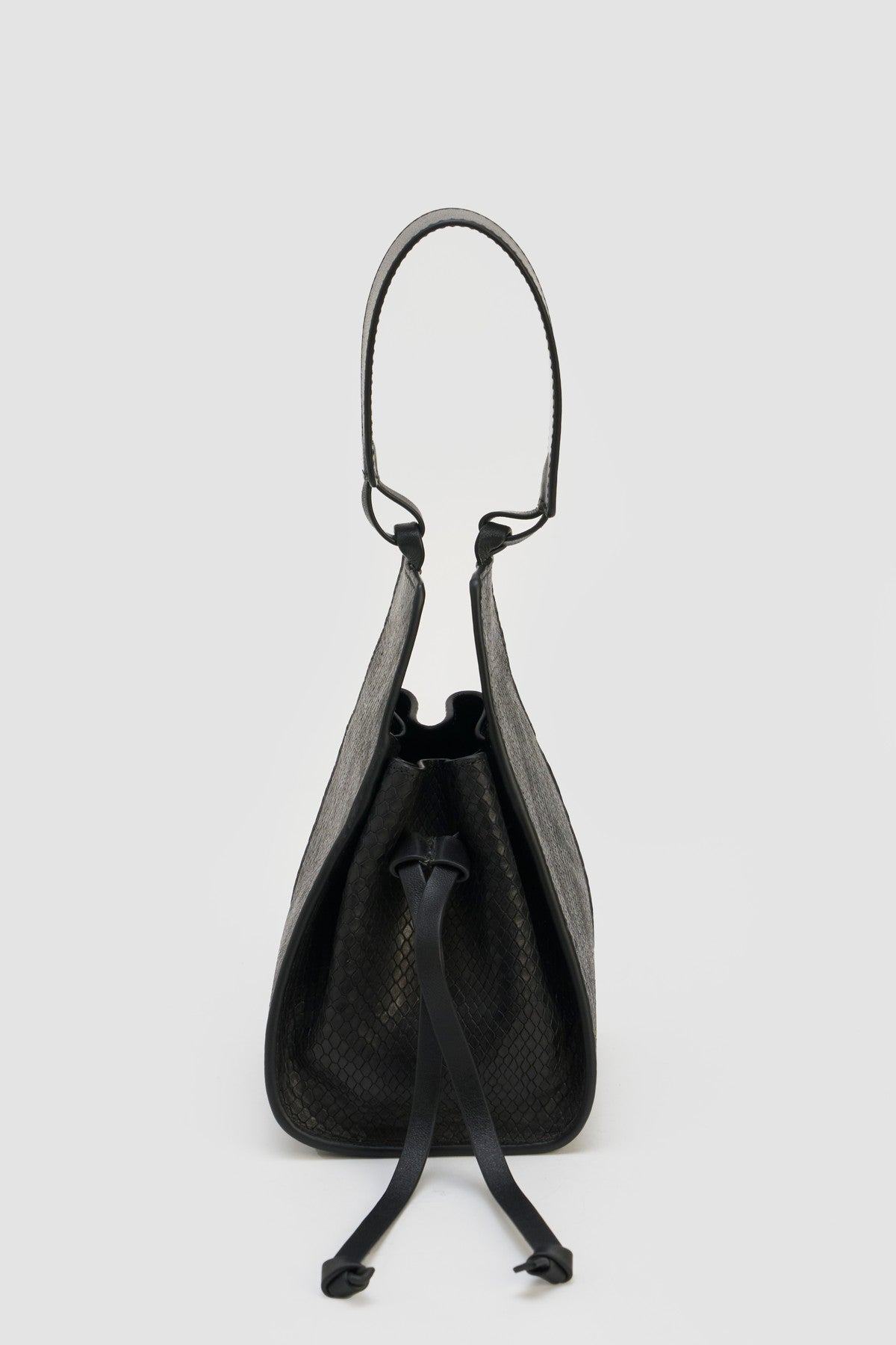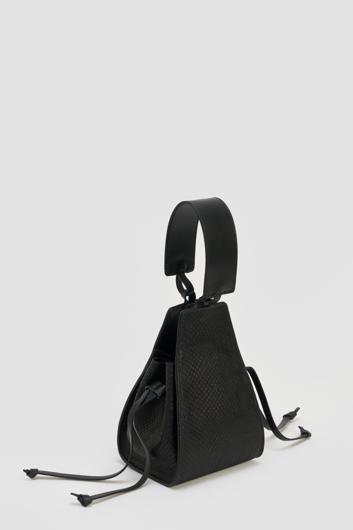 Perona’s iconic creation, beautifully curated with its unique drawcord closure, the KHLOE pouch bag, is crafted with genuine leather and embossed with a reptile print. Features drawstrings knotted on both sides, creating an exaggerated, softly gathered profile. The top handle, artfully attached with a hand-tied knot, showcases artisanal craftsmanship and creates a striking design detail that blends tradition with modernity. On the sides, the gusset construction envelops the body, giving the bag a sculptural silhouette that sets it apart from conventional shapes. This thoughtful design not only enhances durability but also creates a distinct, contemporary aesthetic. A perfect harmony of structure and fluidity, this piece redefines everyday sophistication.