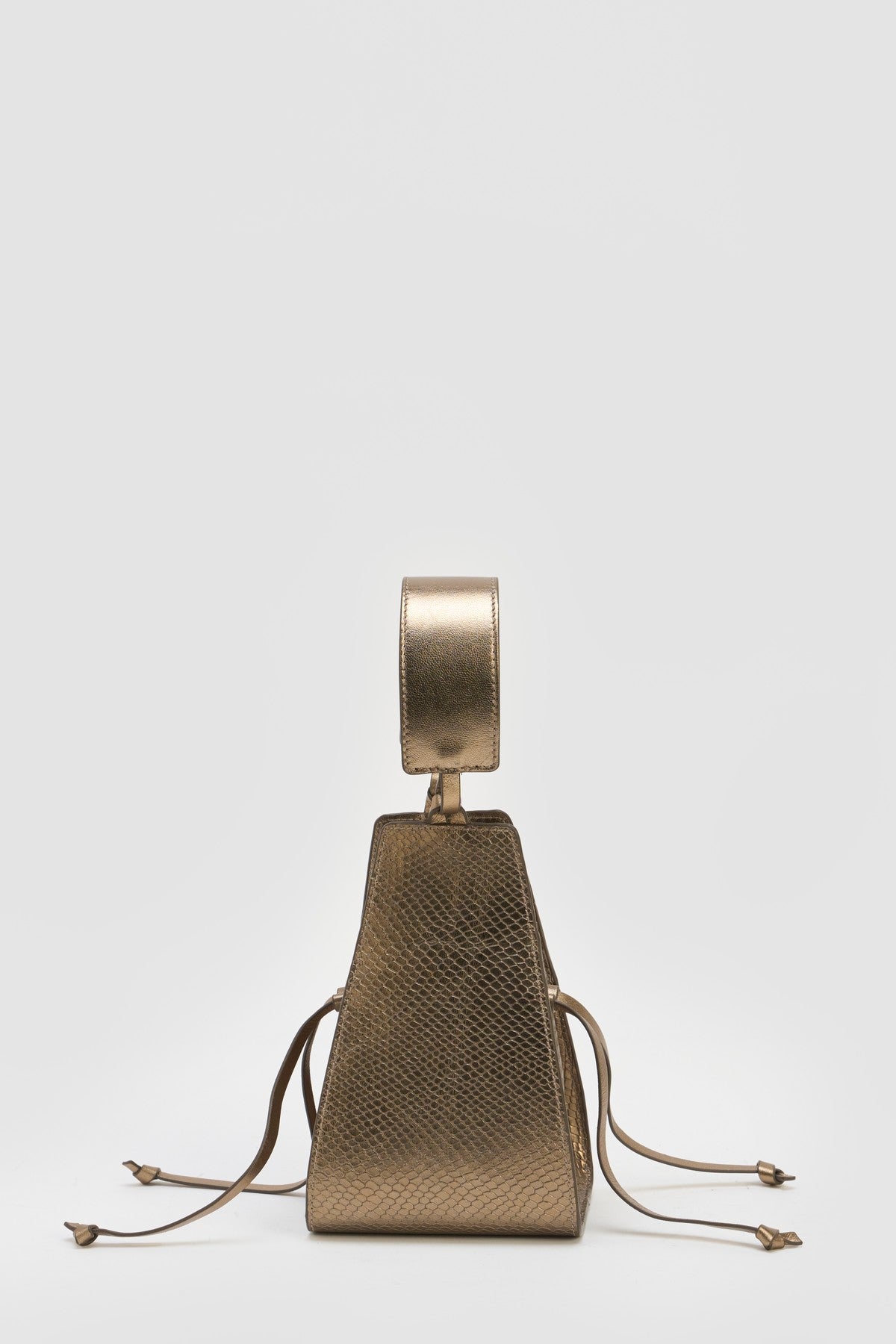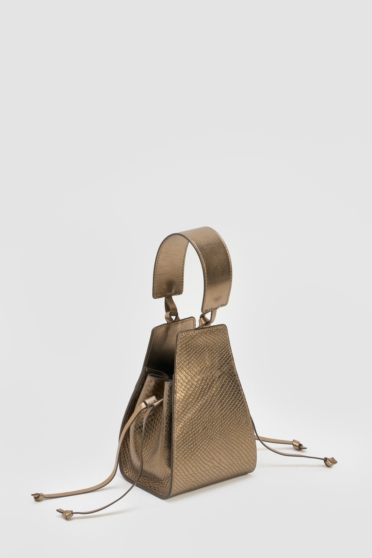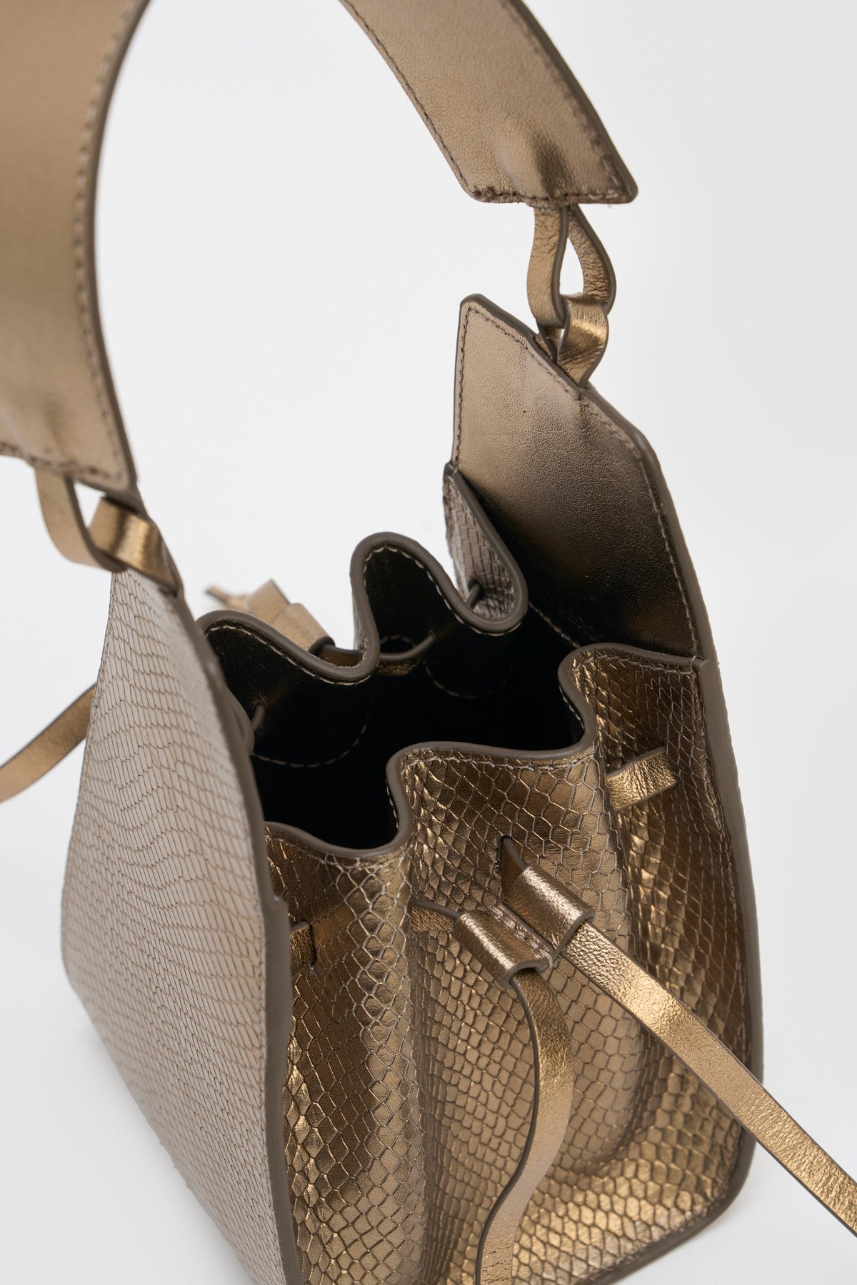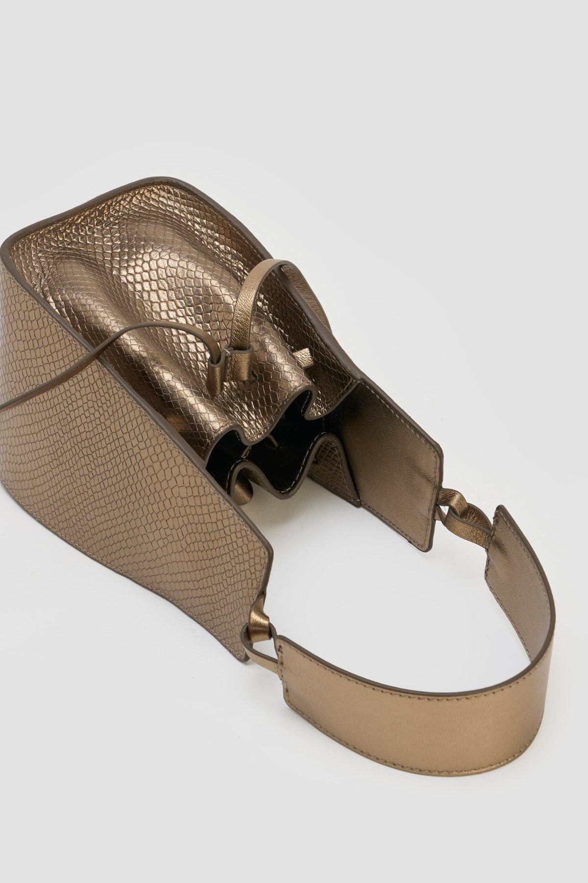 Perona’s iconic creation, beautifully curated with its unique drawcord closure, the KHLOE pouch bag, is crafted with genuine leather and embossed with a reptile print. Features drawstrings knotted on both sides, creating an exaggerated, softly gathered profile. The top handle, artfully attached with a hand-tied knot, showcases artisanal craftsmanship and creates a striking design detail that blends tradition with modernity. On the sides, the gusset construction envelops the body, giving the bag a sculptural silhouette that sets it apart from conventional shapes. This thoughtful design not only enhances durability but also creates a distinct, contemporary aesthetic. A perfect harmony of structure and fluidity, this piece redefines everyday sophistication.